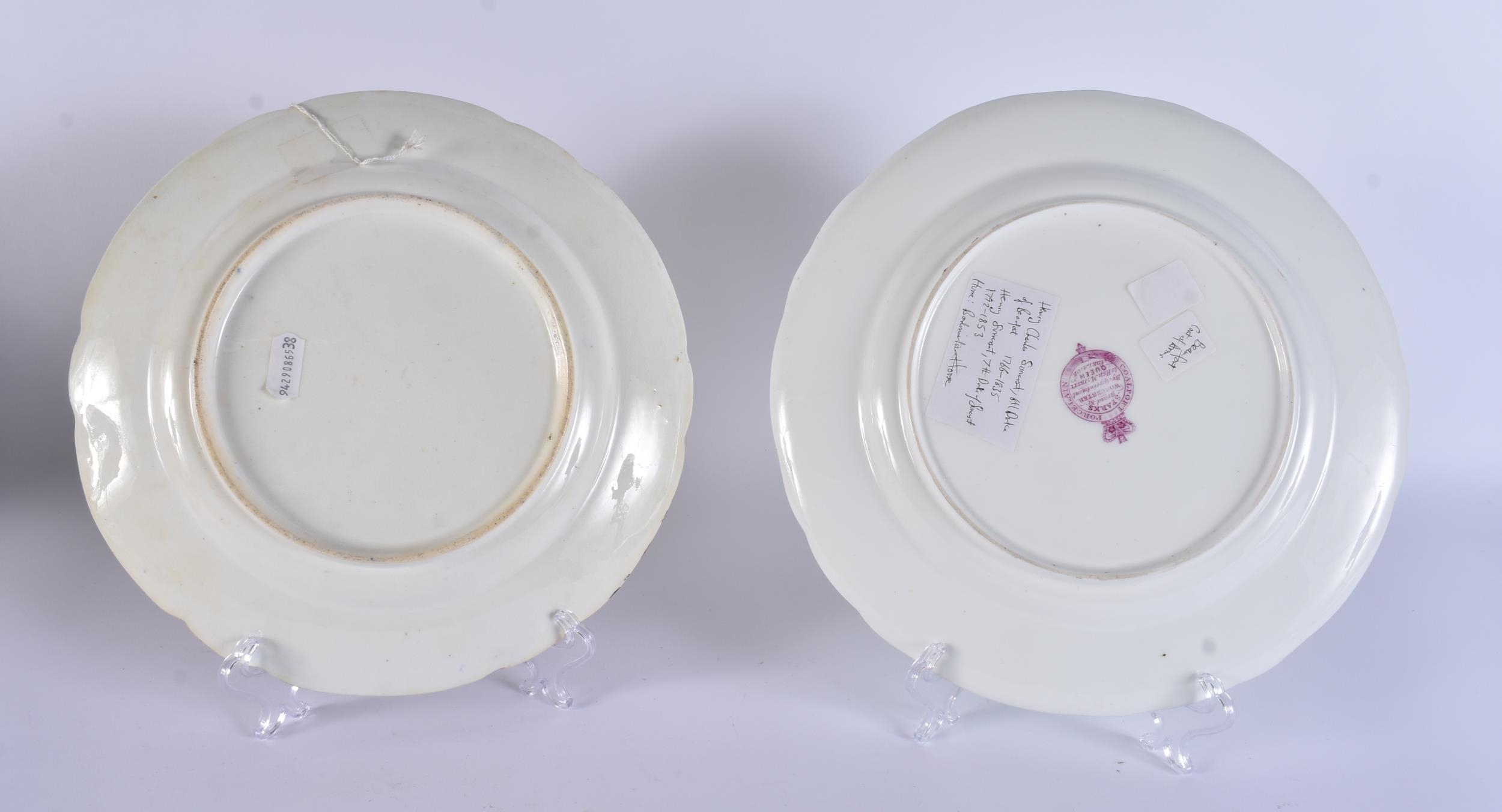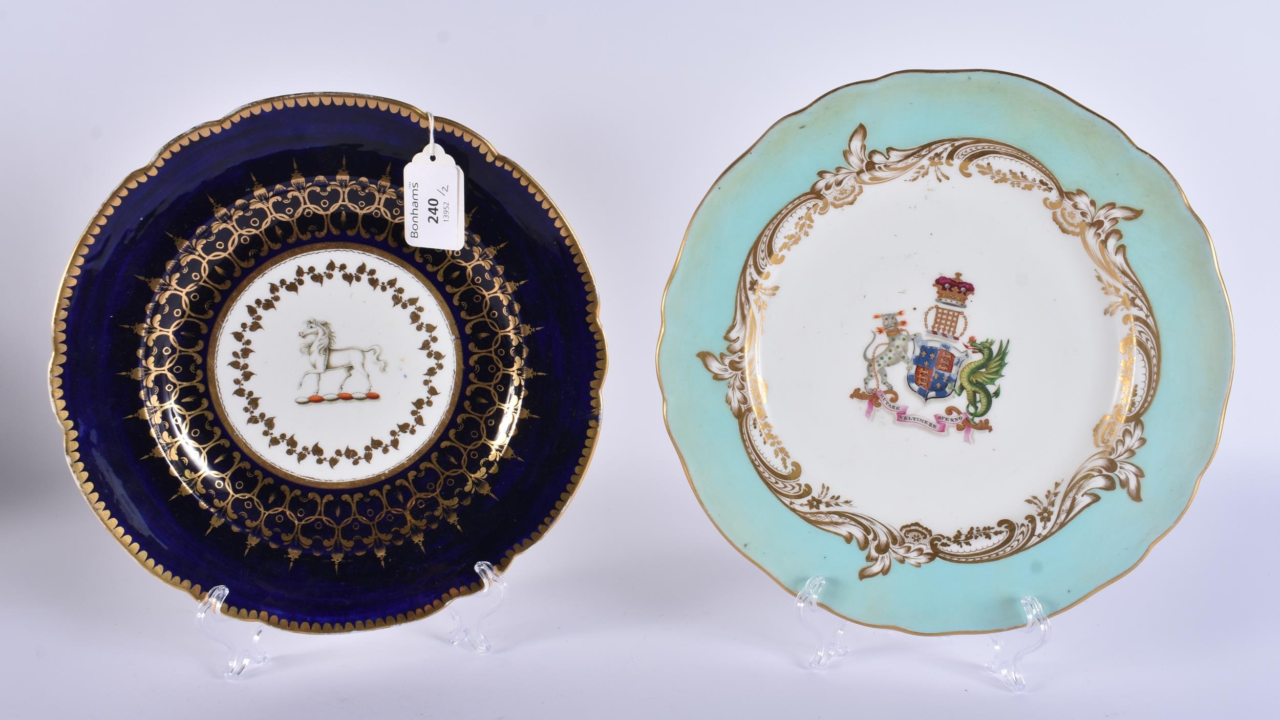 TWO EARLY 19TH CENTURY CHAMBERLAINS WORCESTER ARMORIAL PLATES. 24.5 cm wide. (2)