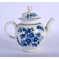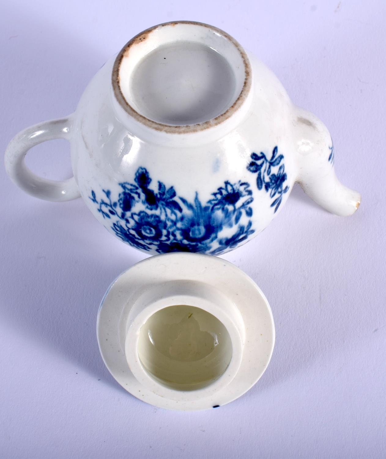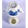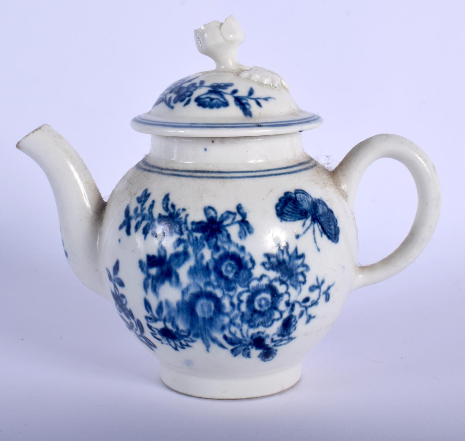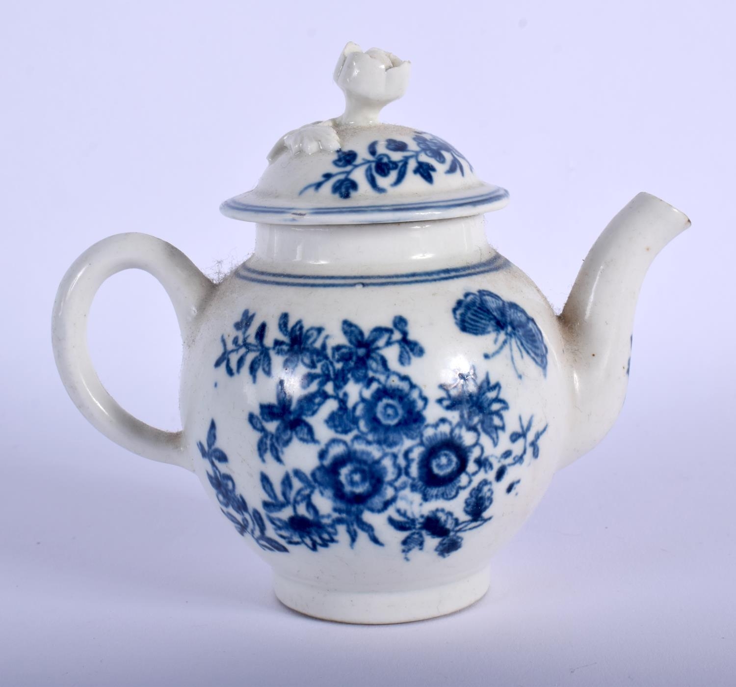 18TH C. ENGLISH PORCELAIN RARE MINIATURE TEAPOT AND COVER DECORATED IN UNDERGLAZE BUE WITH A VERSION OF THE THREE FLOWERS PATTERN. 9.5cm high