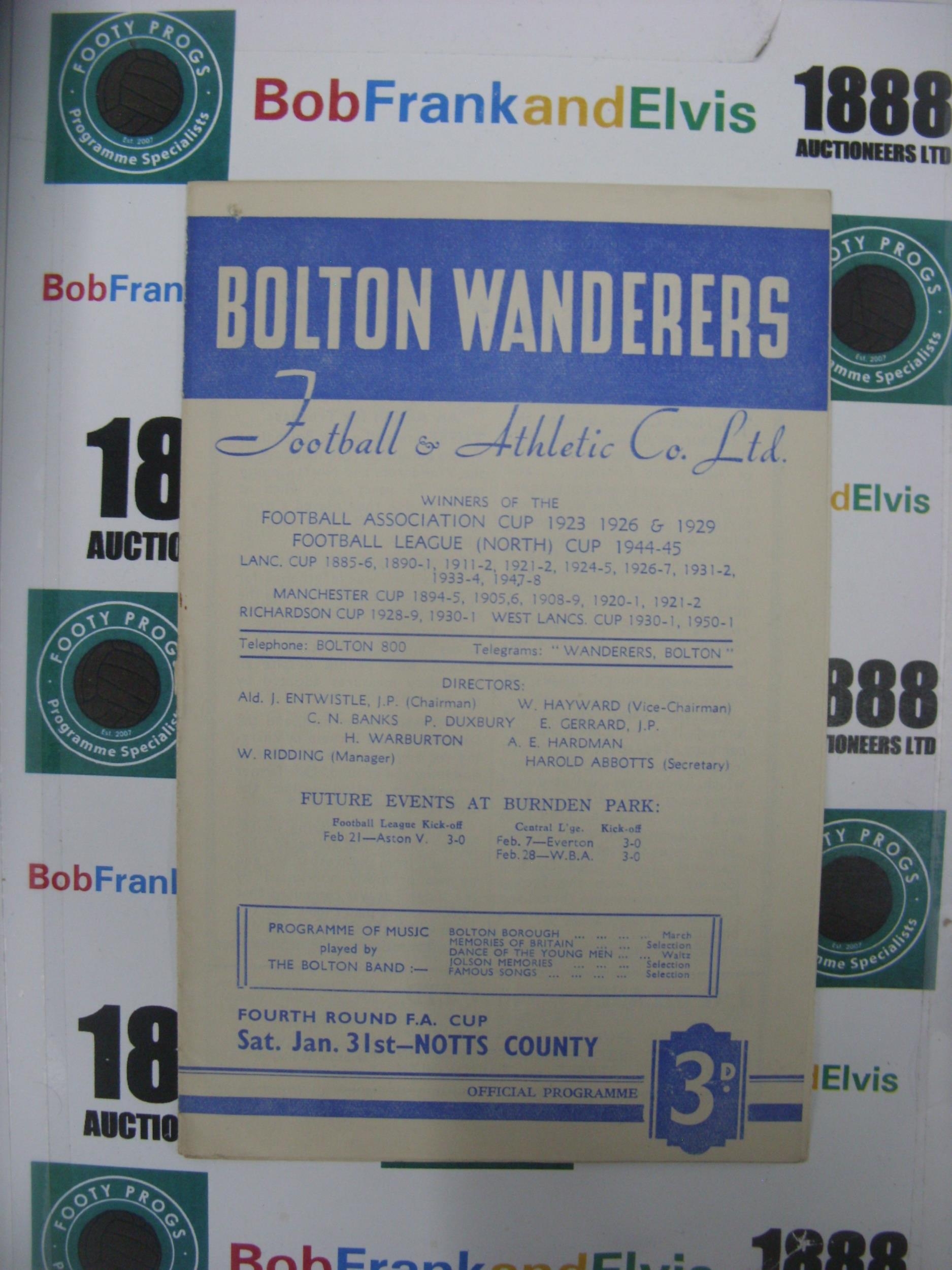 BOLTON WANDERERS, 1952/1953, a football programme from the game versus Notts County, played on 31/01/1953 in the FA Cup (folded, score on back, pin hole).
