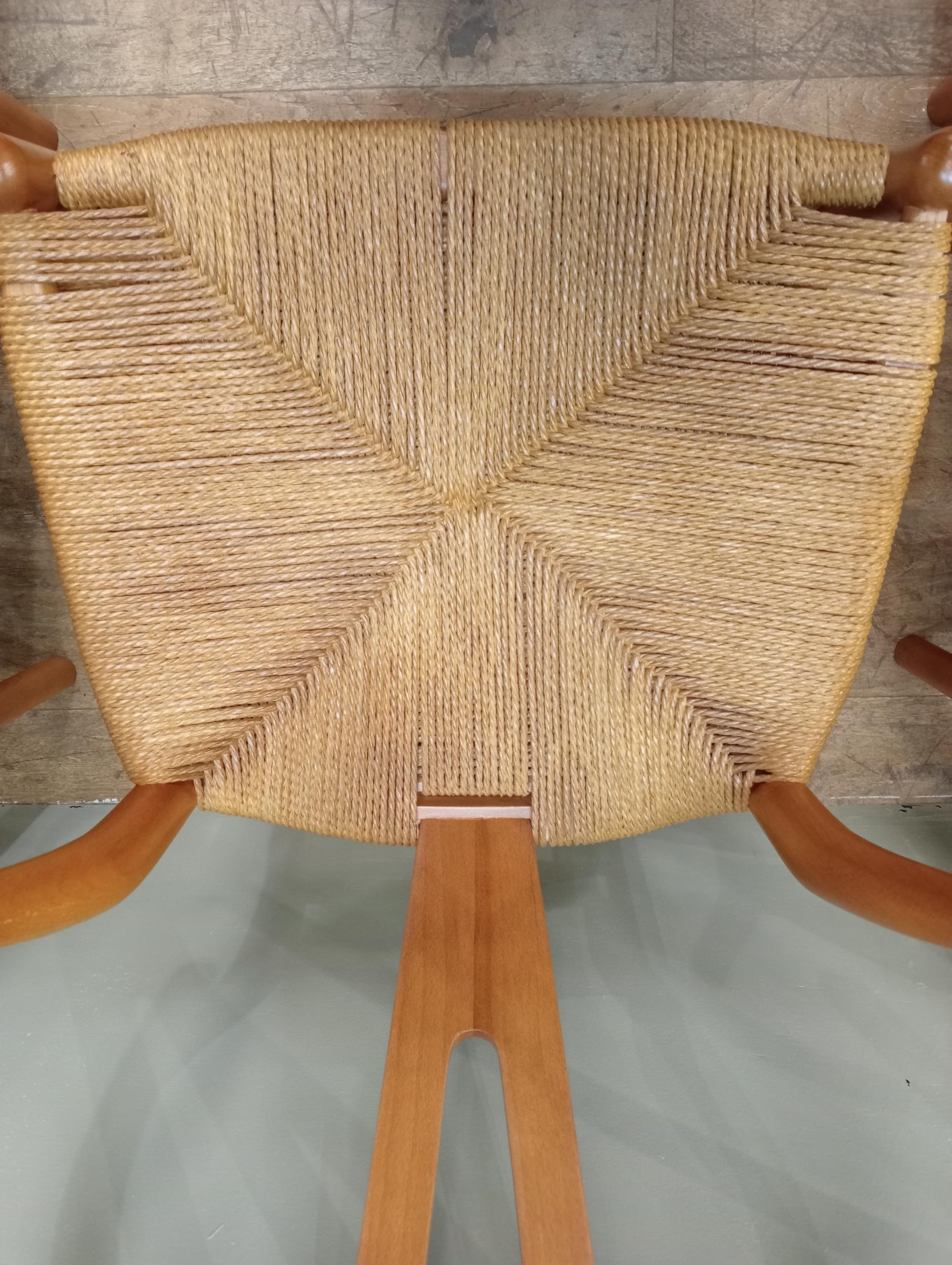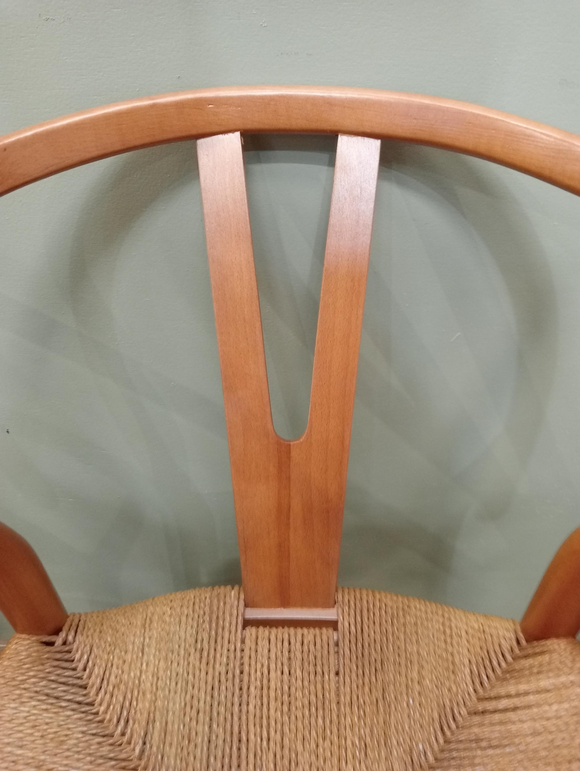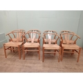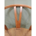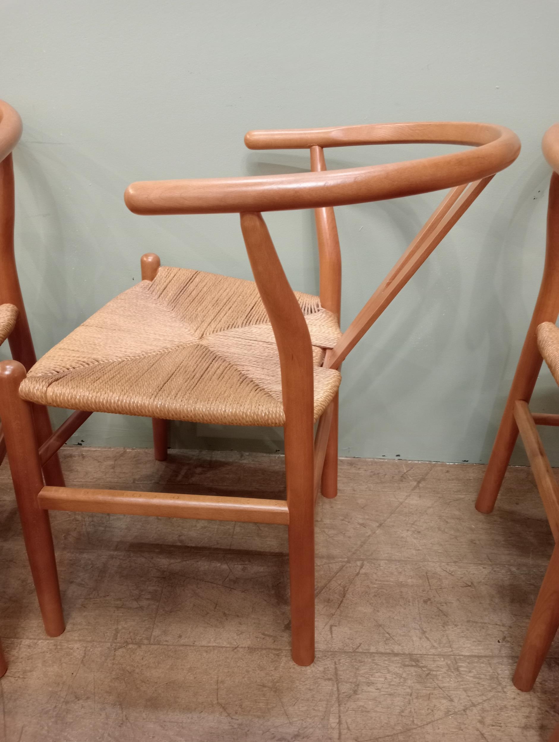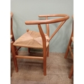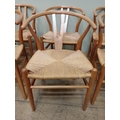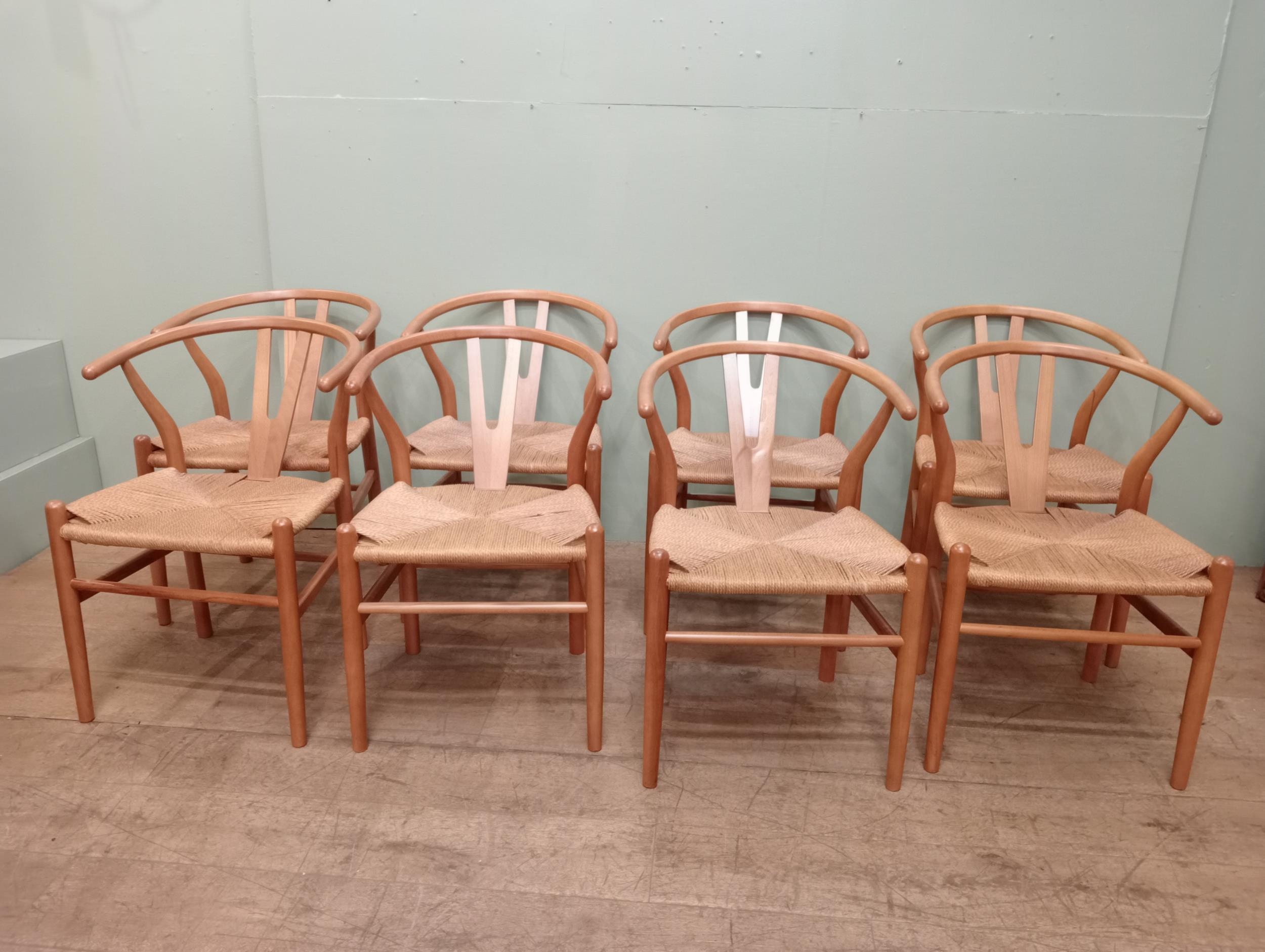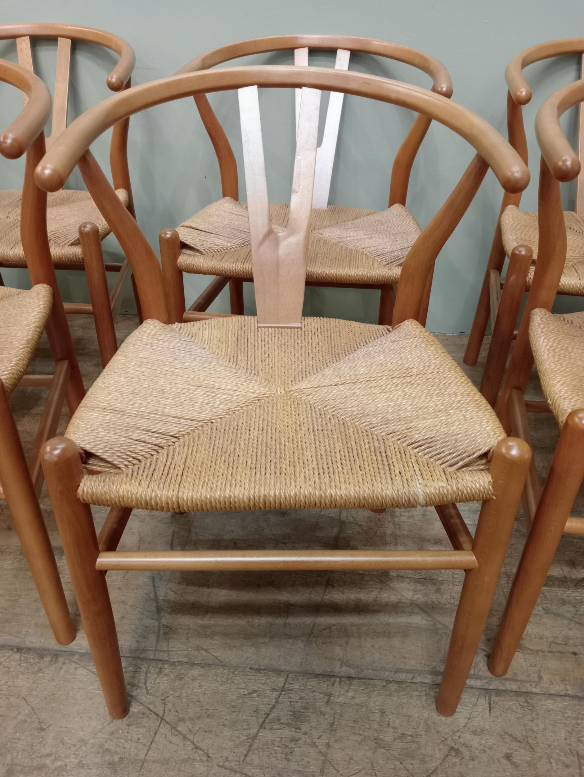Set of eight vintage wishbone Danish dining chairs with woven rush seats. {H 73cm x W 52cm x D 52cm }. NOT AVAILABLE TO VIEW IN PERSON.