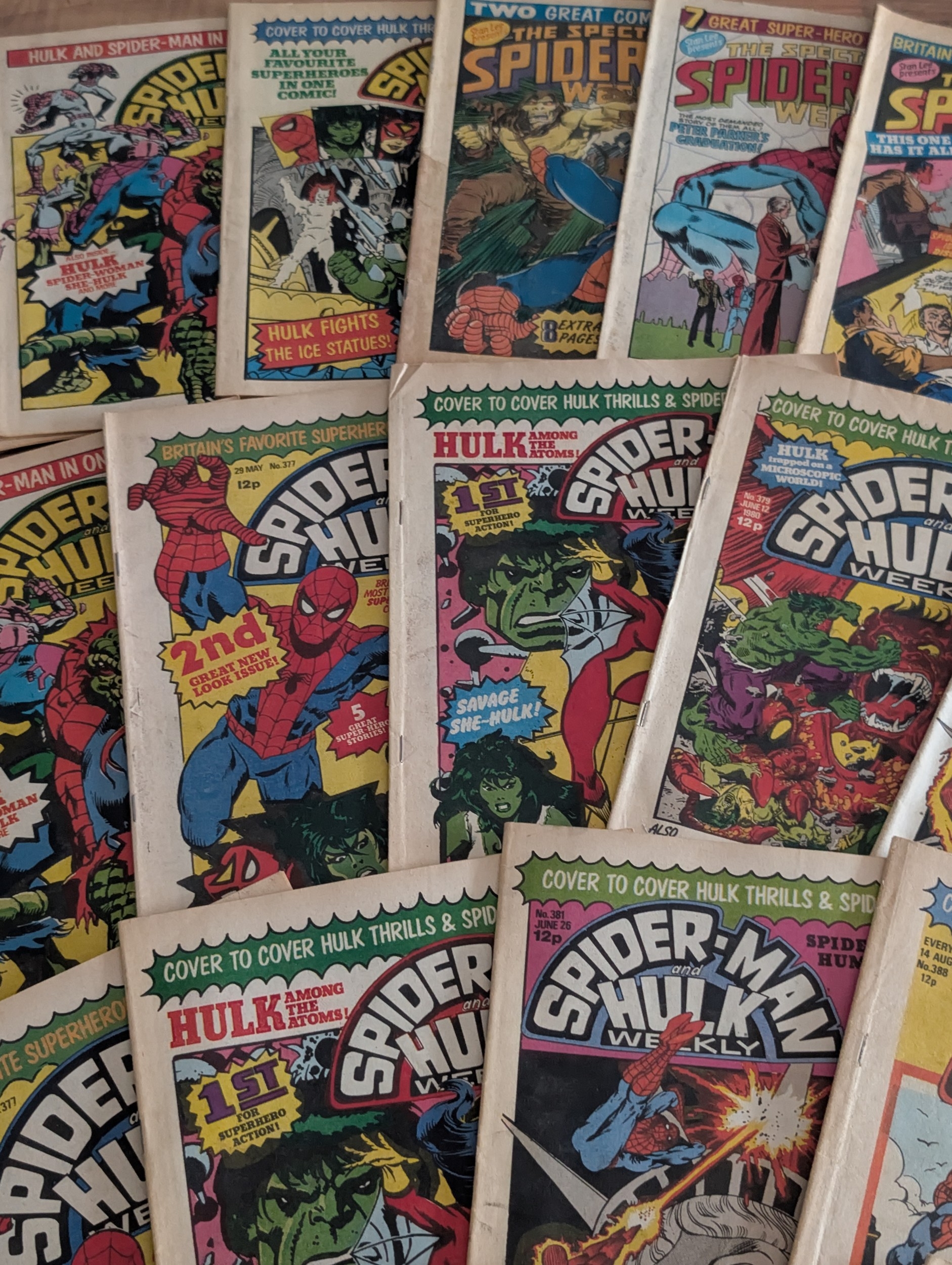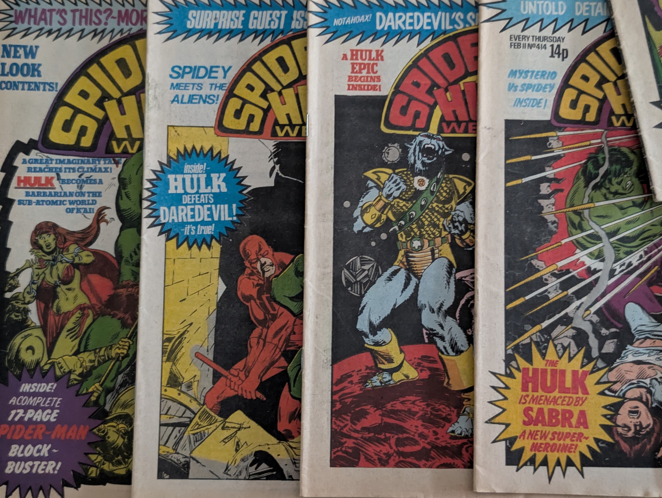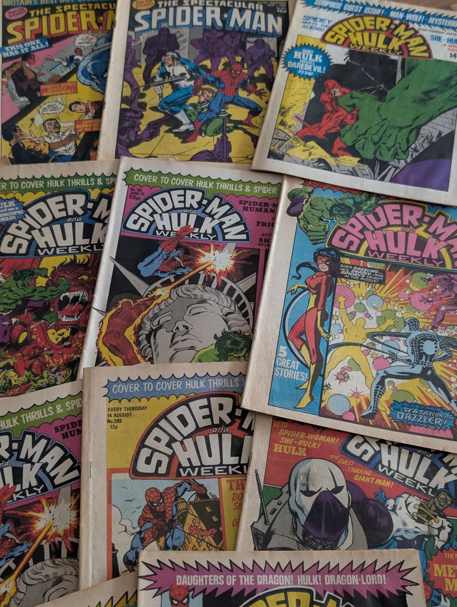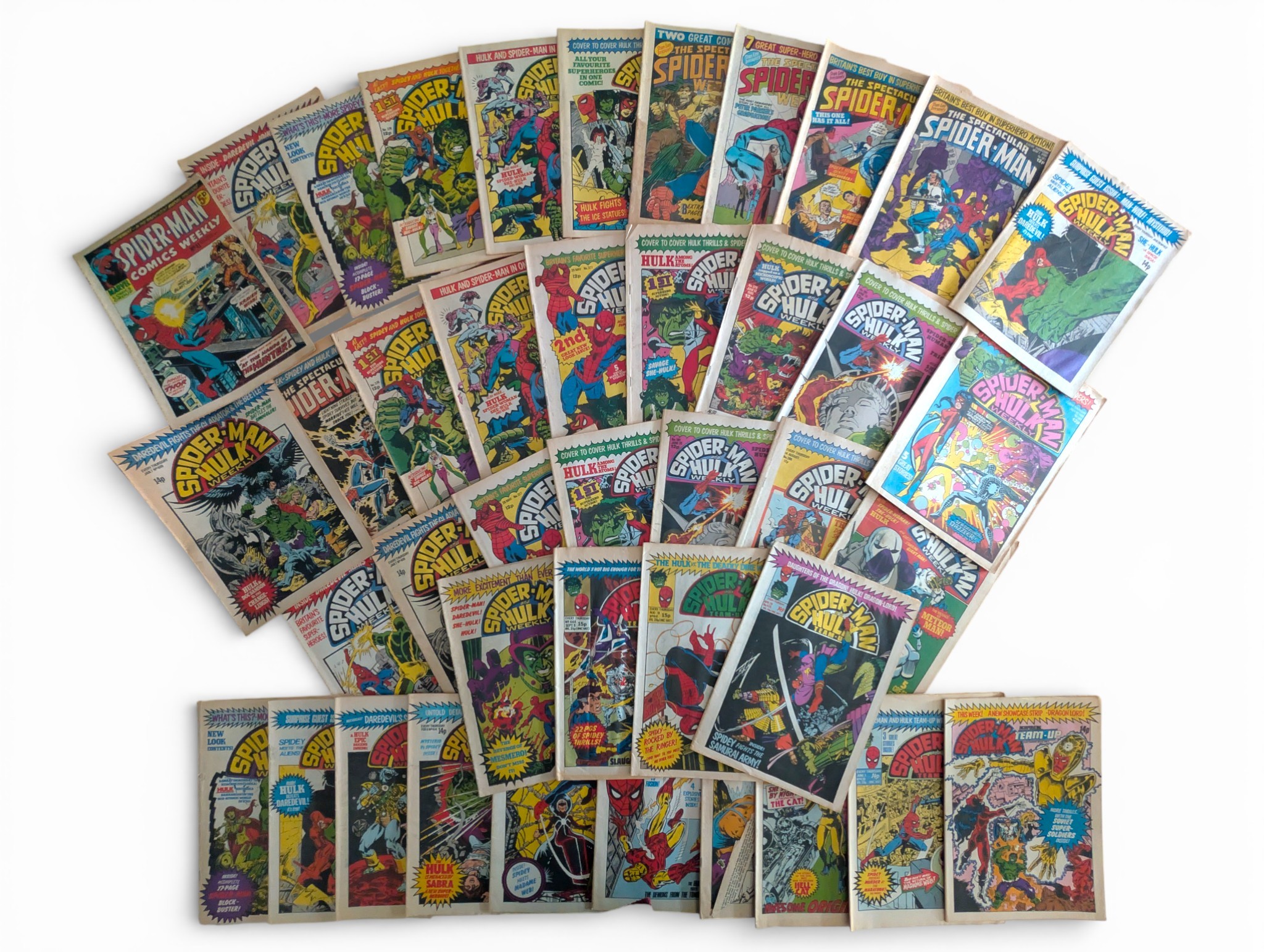 Marvel Comics – Spider-Man & Hulk Weekly, large group of Marvel UK weekly issues, predominantly late 1970s–early 1980s. Strong run of Spider-Man and Hulk titles with mixed storylines and cover variants.
