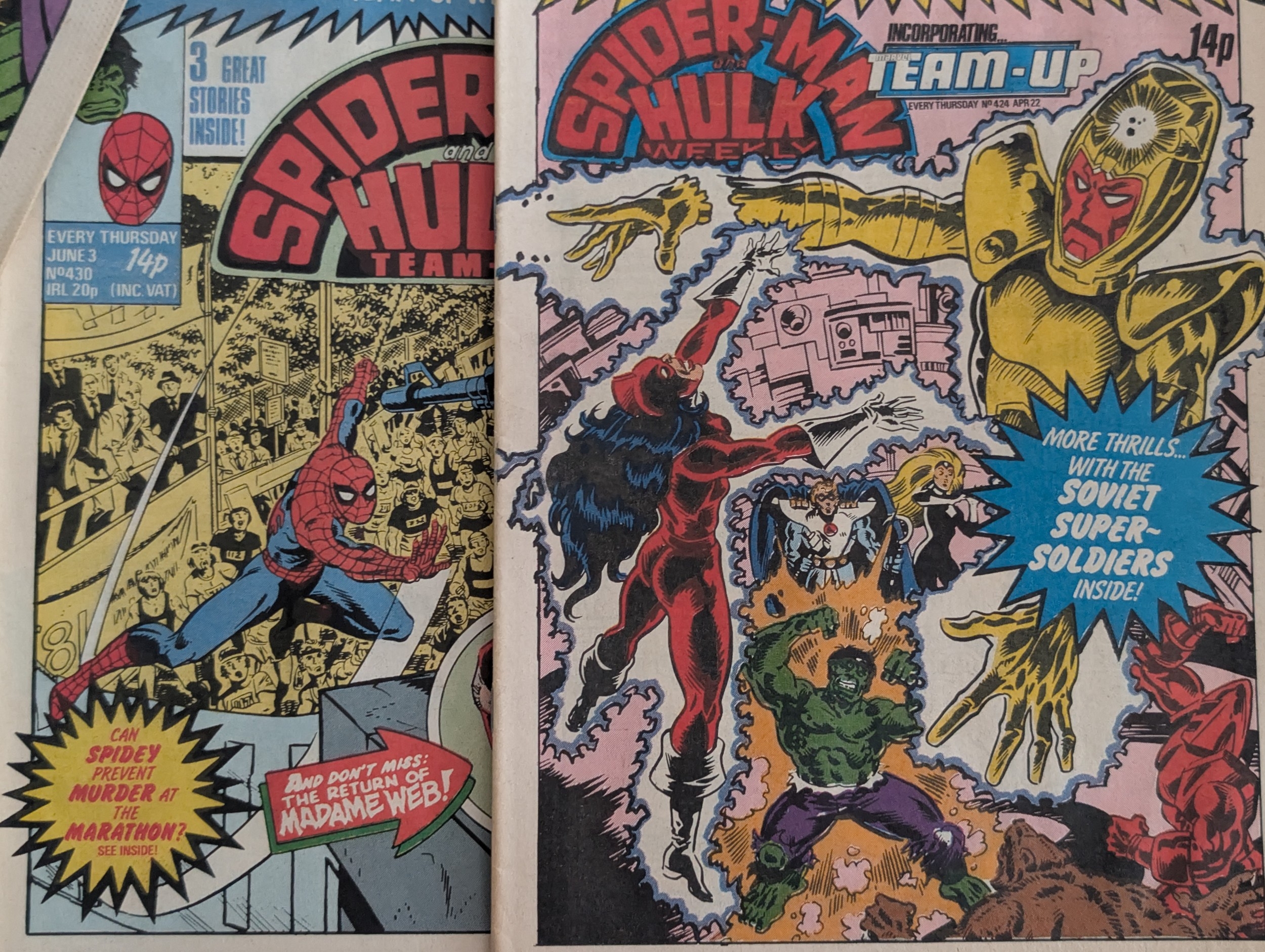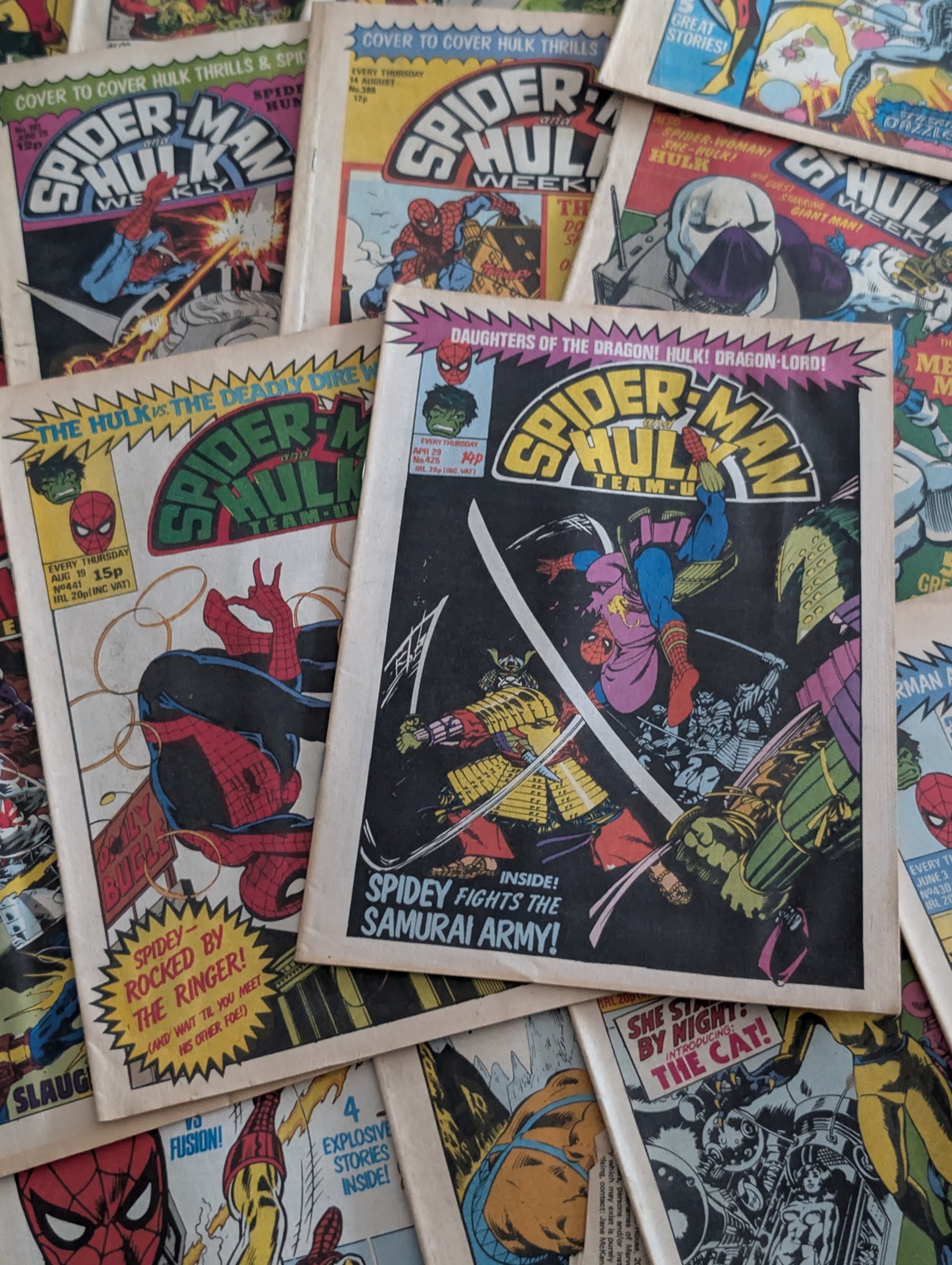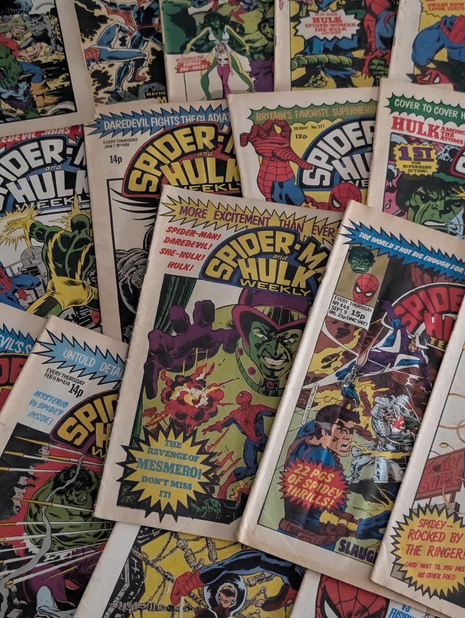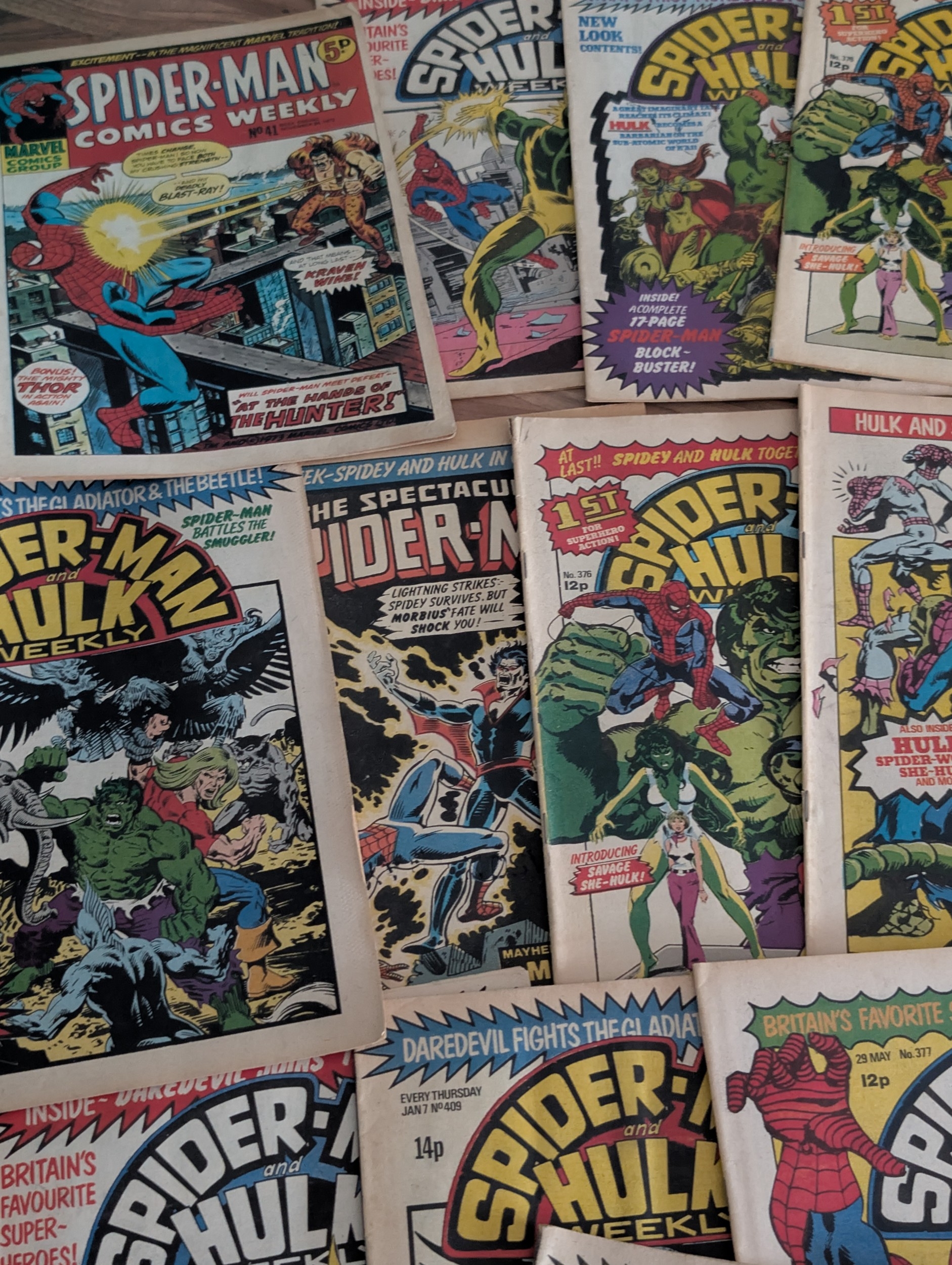Marvel Comics – Spider-Man & Hulk Weekly, large group of Marvel UK weekly issues, predominantly late 1970s–early 1980s. Strong run of Spider-Man and Hulk titles with mixed storylines and cover variants.