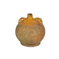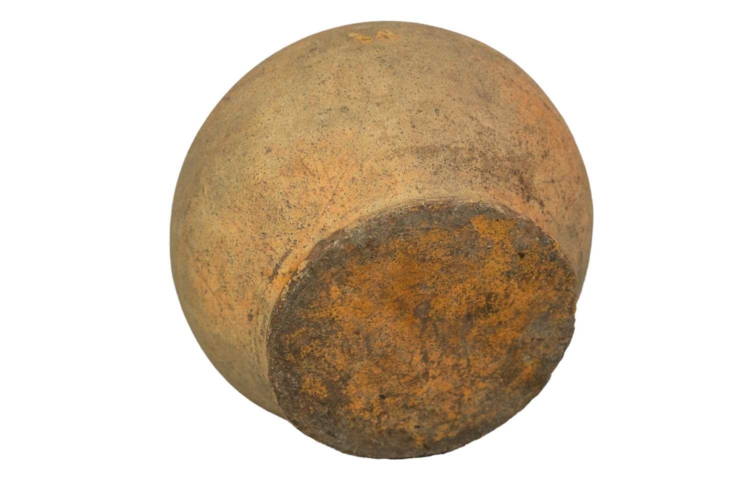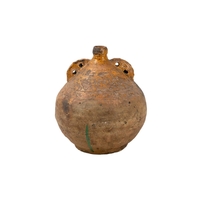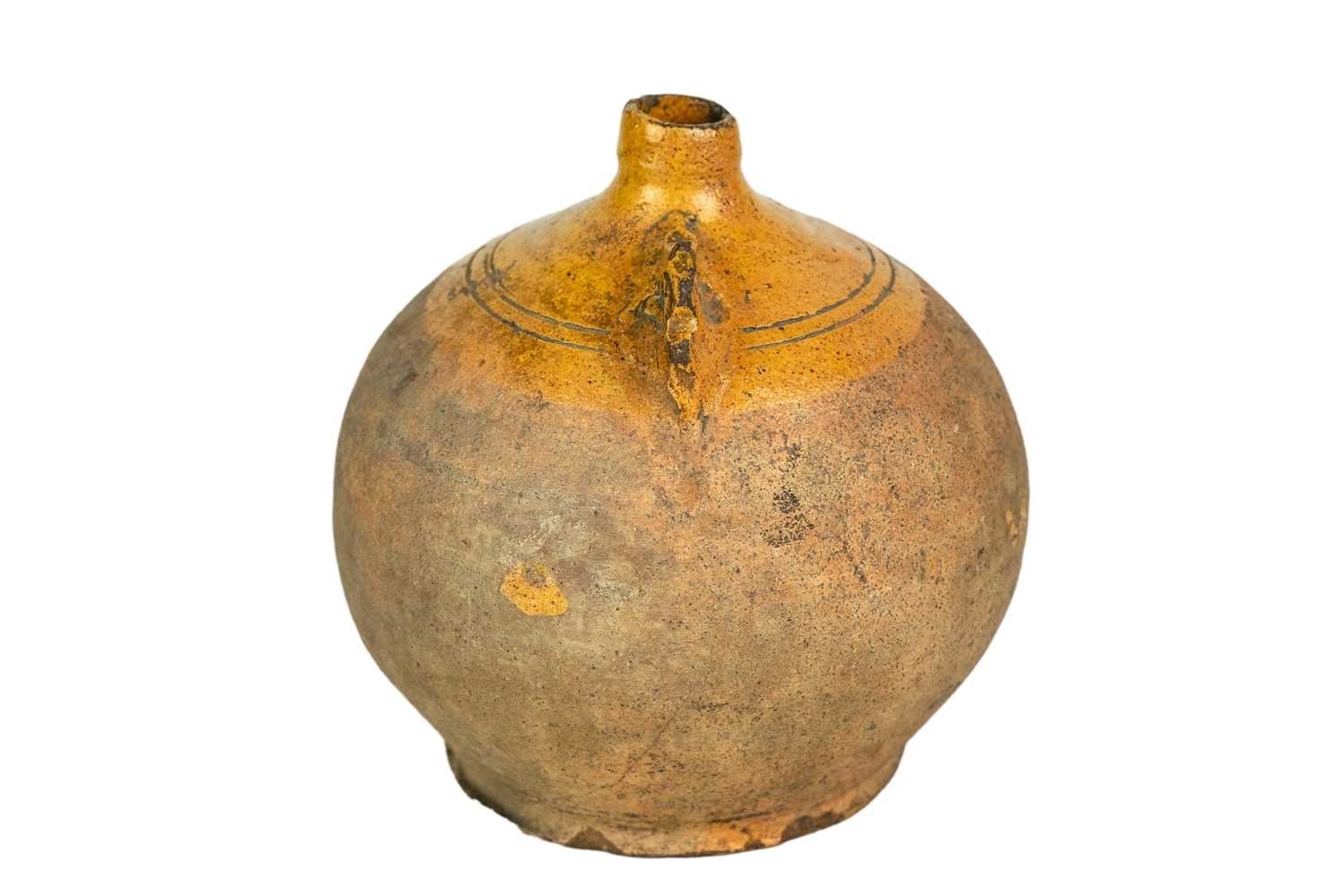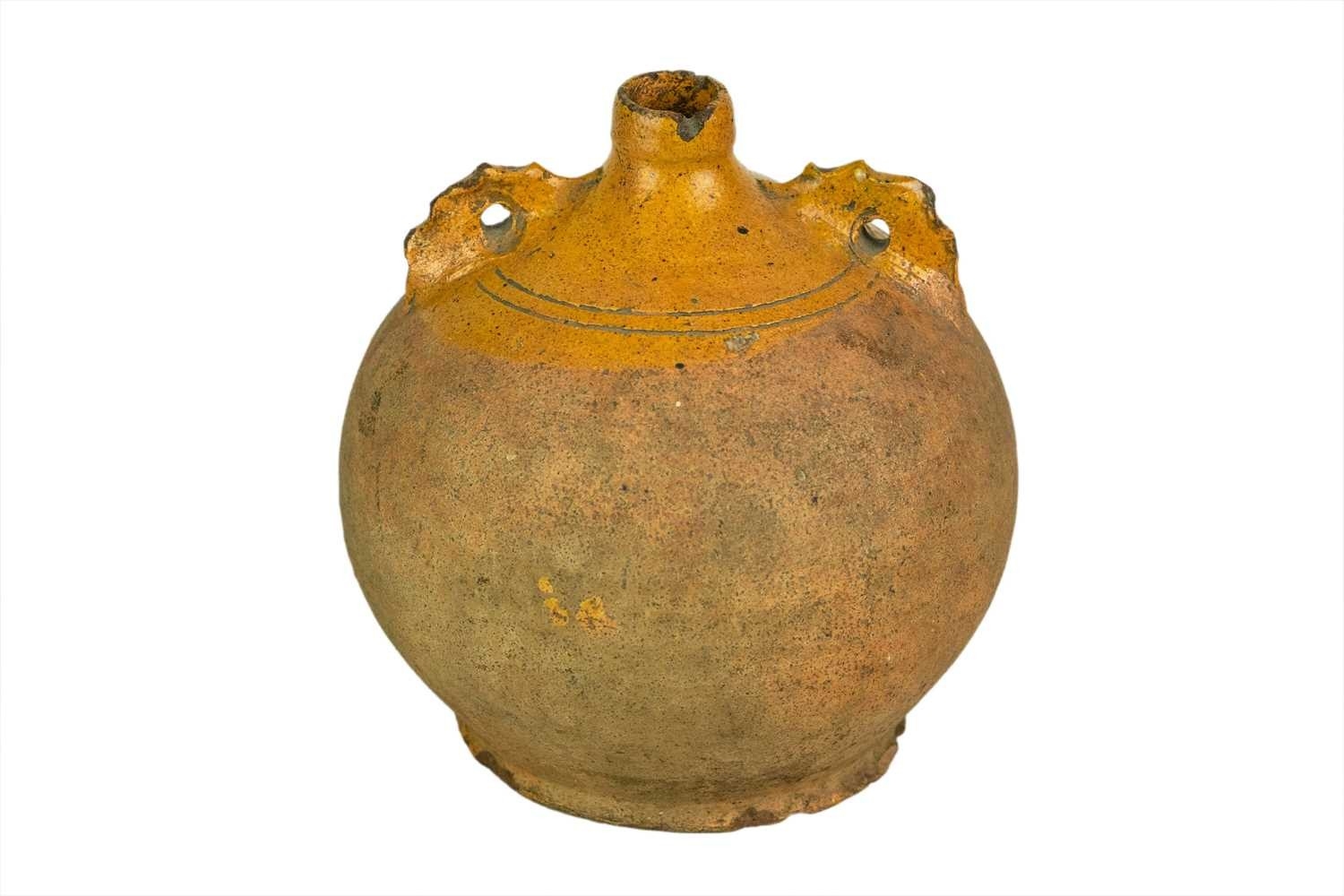 A Verwood (Dorset) pottery owl costrel. 19th century, of typical bellied form, with pierced lug handles, height 20cm. The collection of the late potter Peter Smith of Bojewyan Pottery in West Cornwall. Fellow of the Craftsman Potters Association, member of Newlyn Society of Artists and later chairman of Newlyn Gallery. Peter was also an influential teacher of ceramics at Falmouth University, where he encouraged a spontaneous and improvised approach based on developing technique and an understanding of the medium of clay as an expressive and practical form. Peter originally started as a research chemist before turning to pottery after attending evening classes. He started his own pottery at Bojewyan in West Cornwall in 1974. As well as being a renowned and experimental potter and tutor, he was also a keen collector of medieval and later pottery from the UK and further afield. His Guardian obituary can be read here:https://www.theguardian.com/artanddesign/2025/aug/13/peter-smith-obituary