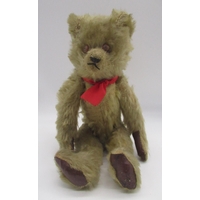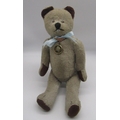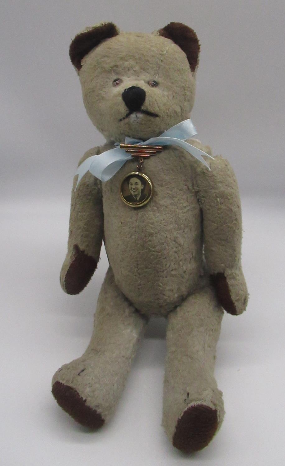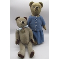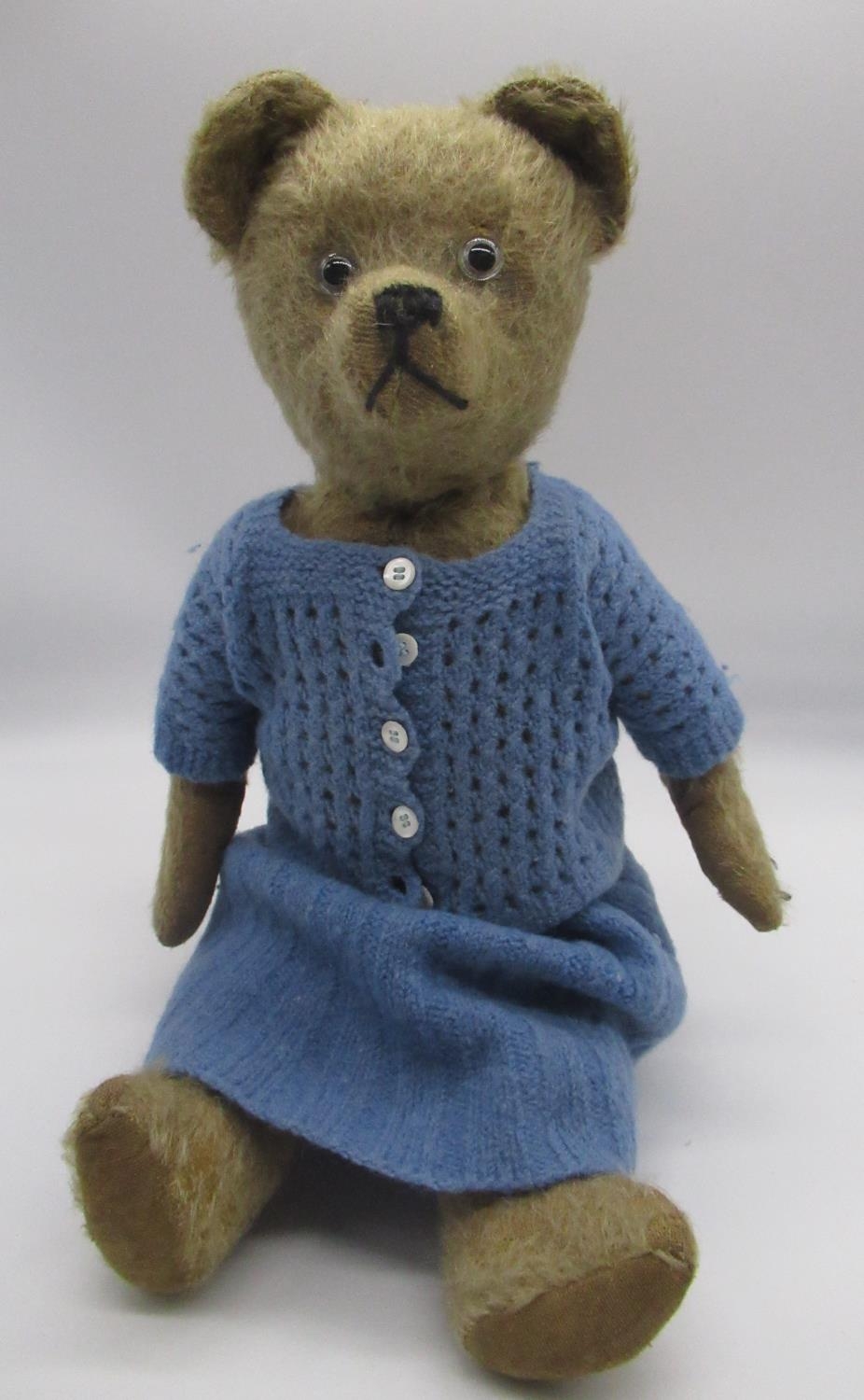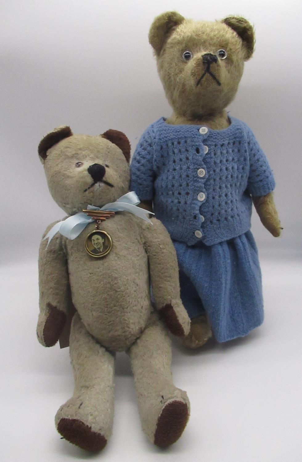 Circa 1930's possibly French teddy bear, in blonde mohair, with pale glass eyes, jointed arms and legs and swivel head with stitched nose wearing blue knitted dress and cardigan, H40.5cm, and a c. 1940's French teddy bear, in faded blue with brown ears and paws, with all original features, wearing a blue ribbon with photo on pin H35.5cm (2)