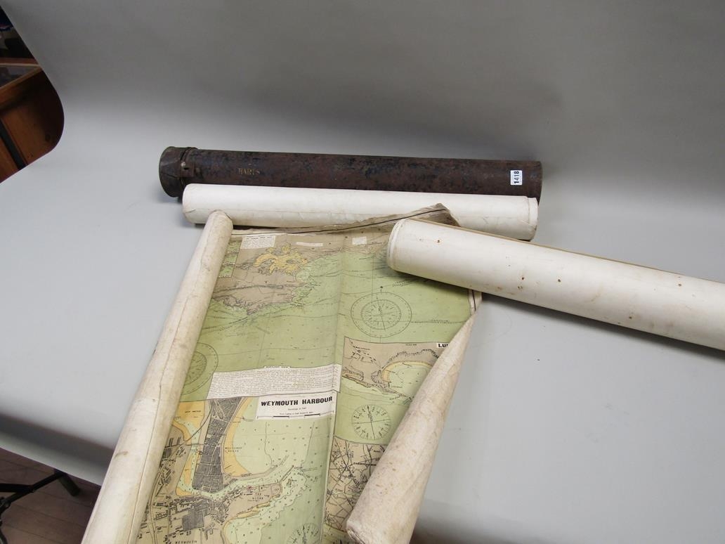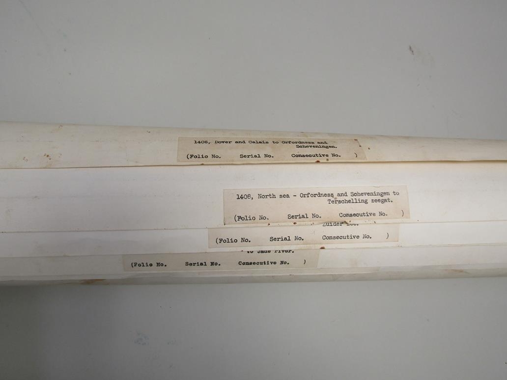 COLLECTION OF COASTAL SEA CHARTS TO INC DOVER AND CALAIS ETC, IN METAL TUBE