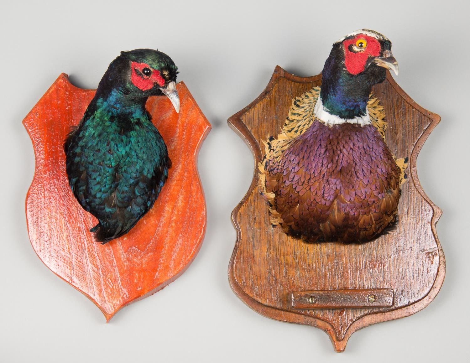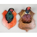 TWO LATE 20TH CENTURY PHEASANT HEADS UPON WOODEN SHIELDS.
