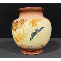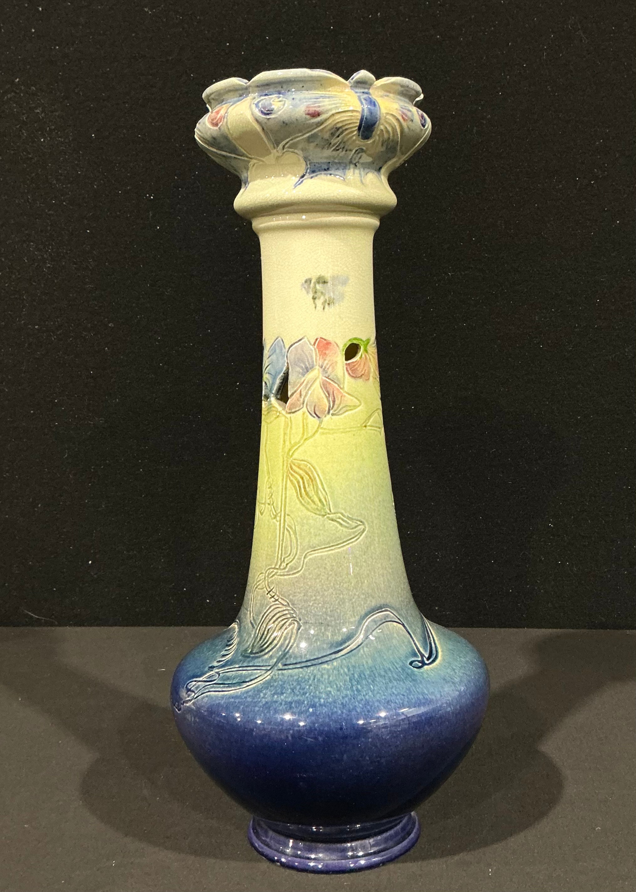 A Bretby Pottery slender tapering bottle vase, incised with trailing flowers and butterflies, painted with insects in flight, the neck with reticulations, drip glazed in pastel shades, 39cm, impressed sunburst mark with star, c.1890