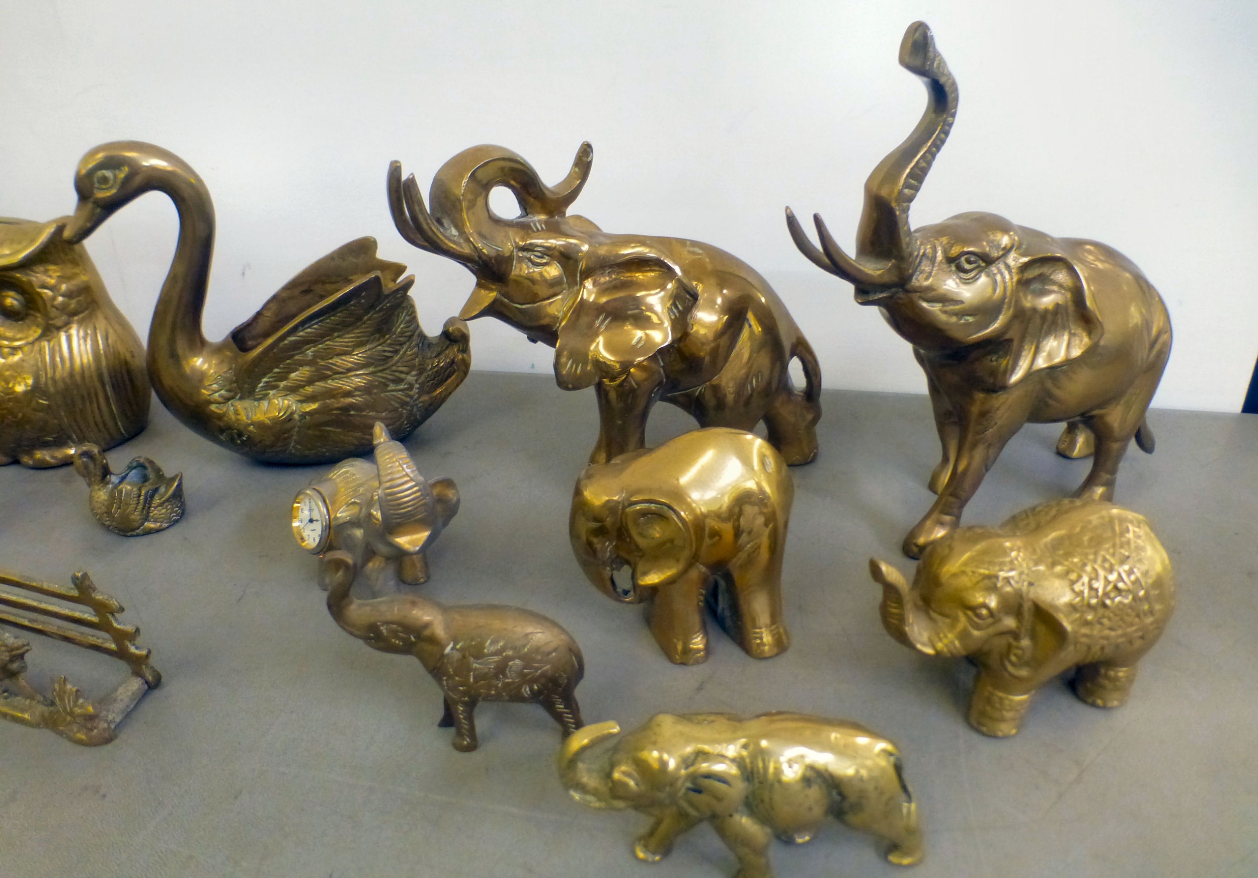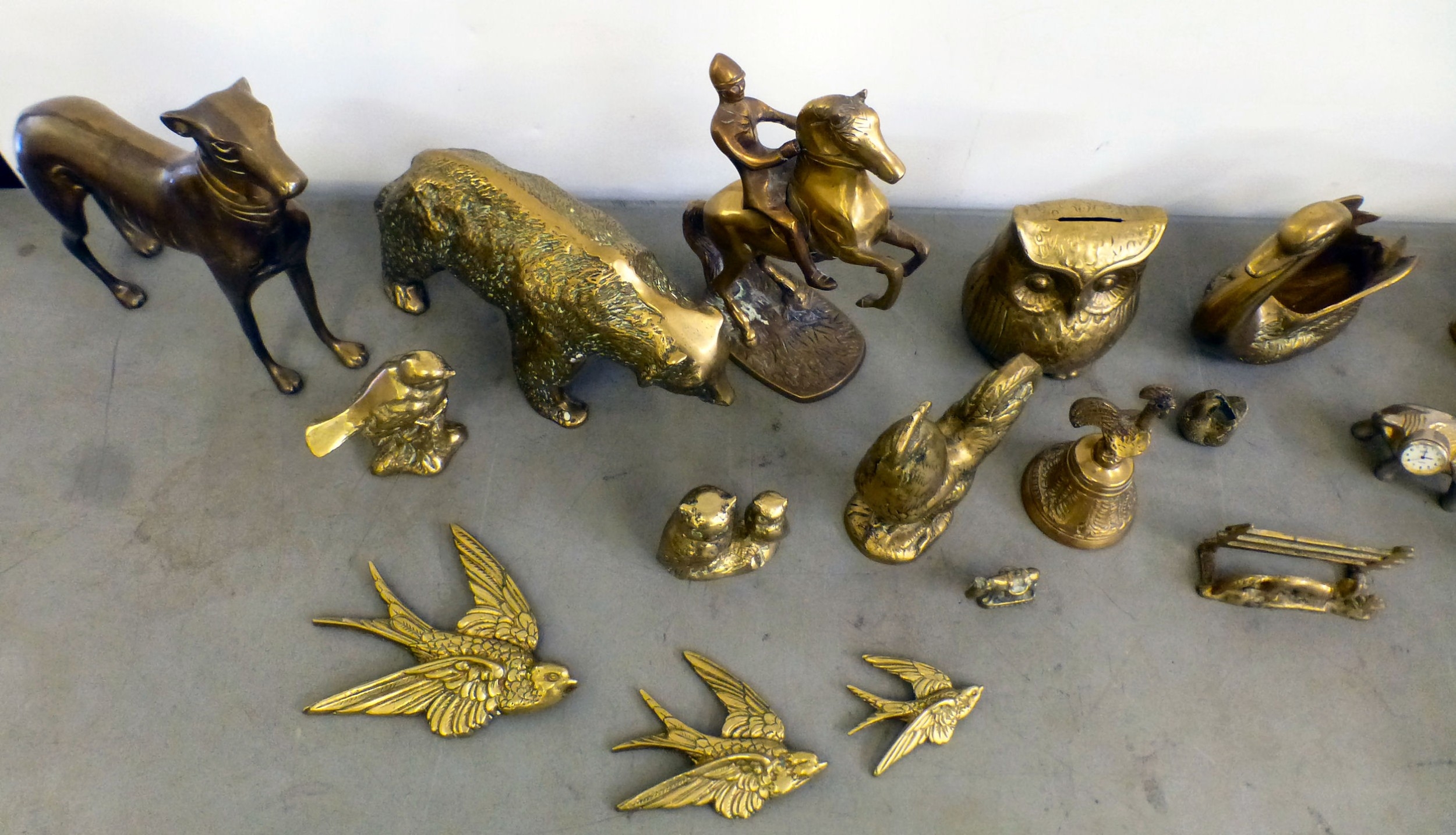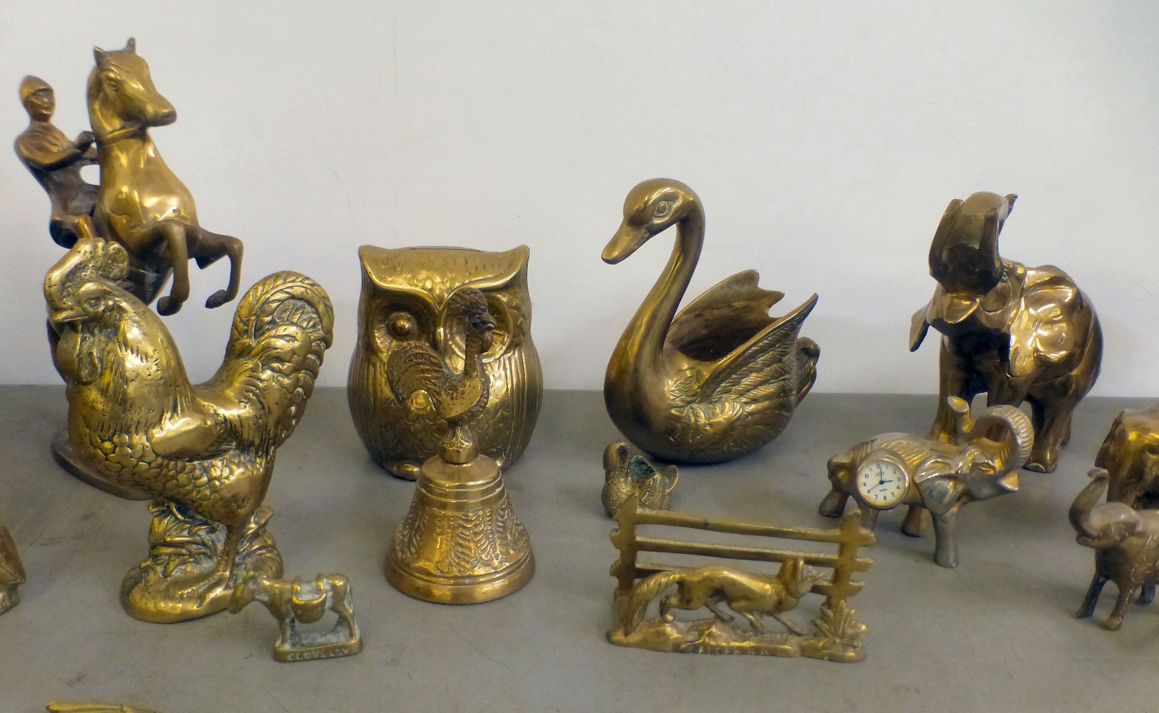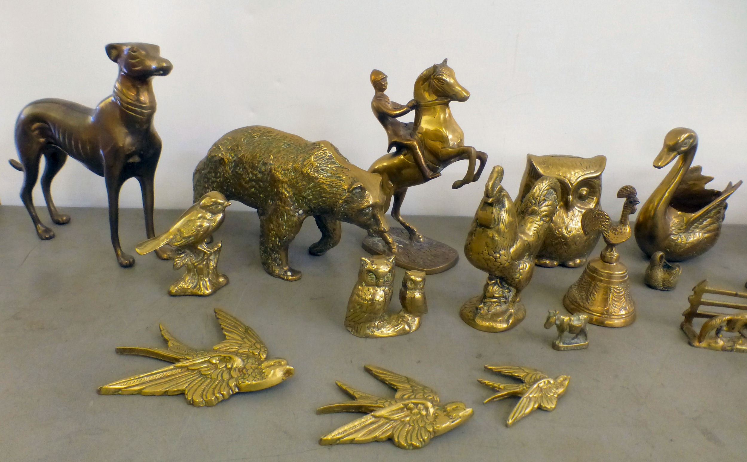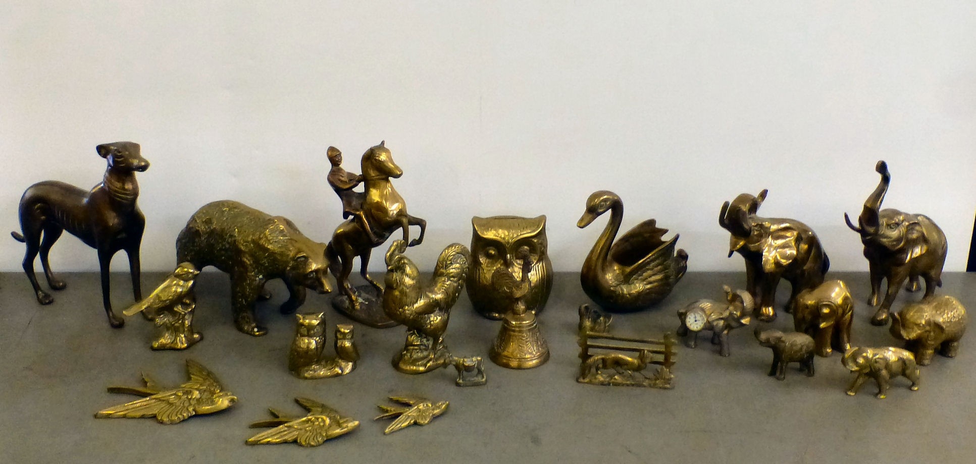 Brass model animals: to include a trumpeting elephant 7.5"h; and a standing greyhound 8"h