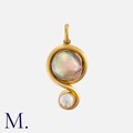 A Pearl And Diamond Pendant in yellow gold, set with a baroque pearl, within a scrolling gold mount suspending an old cut diamond of approximately 0.20ct. Unmarked, tests indicate 14 carat gold.