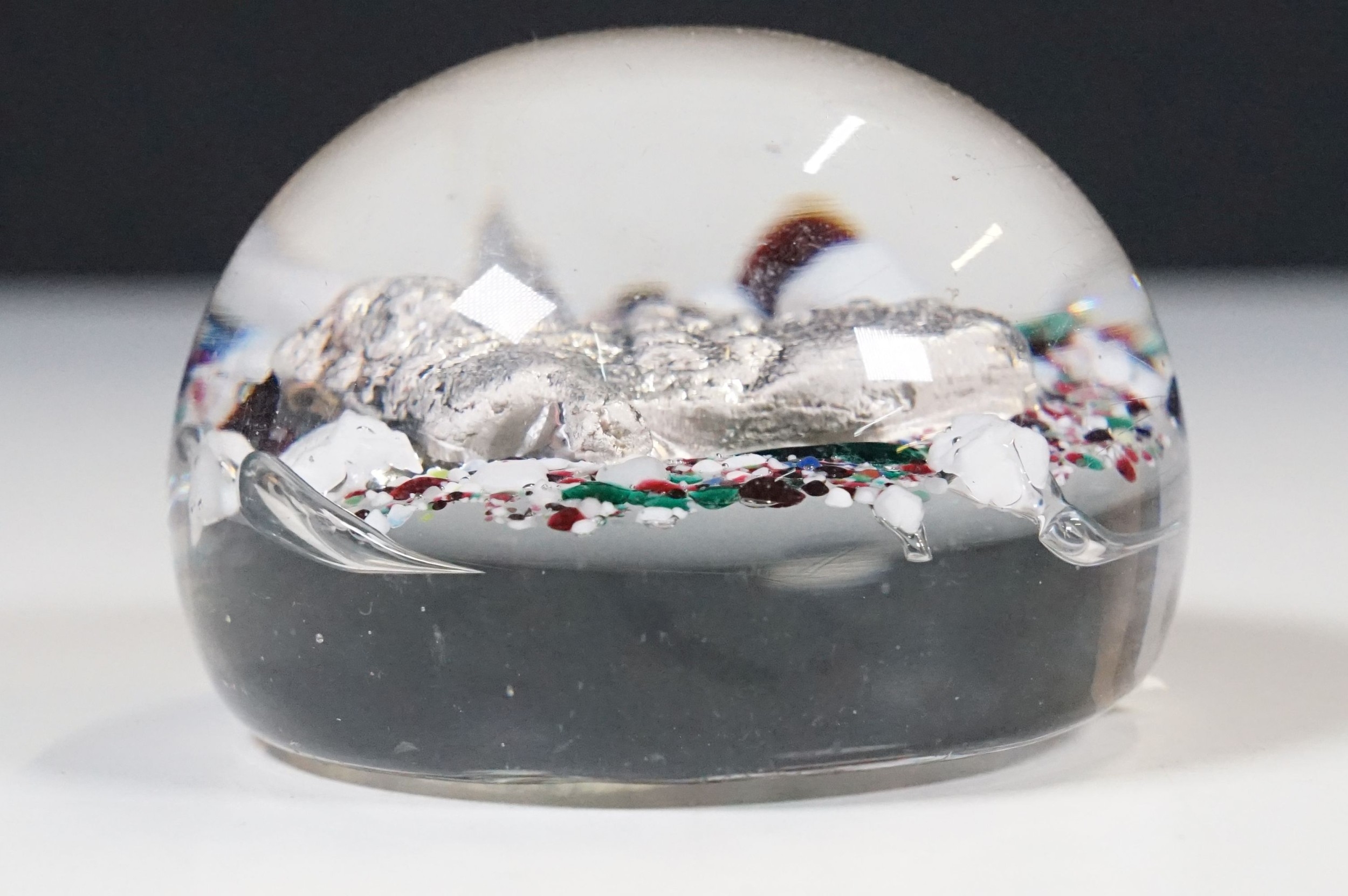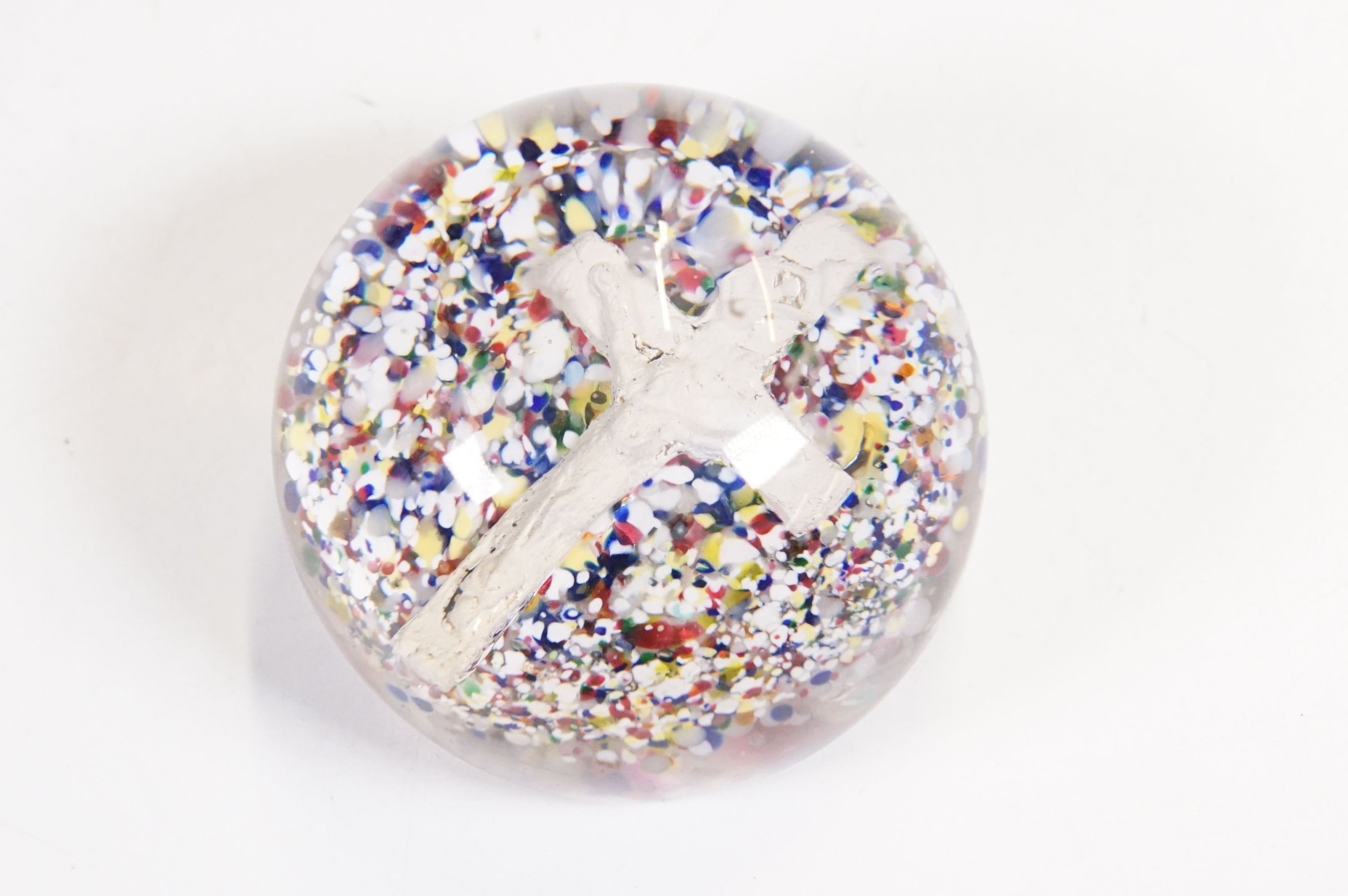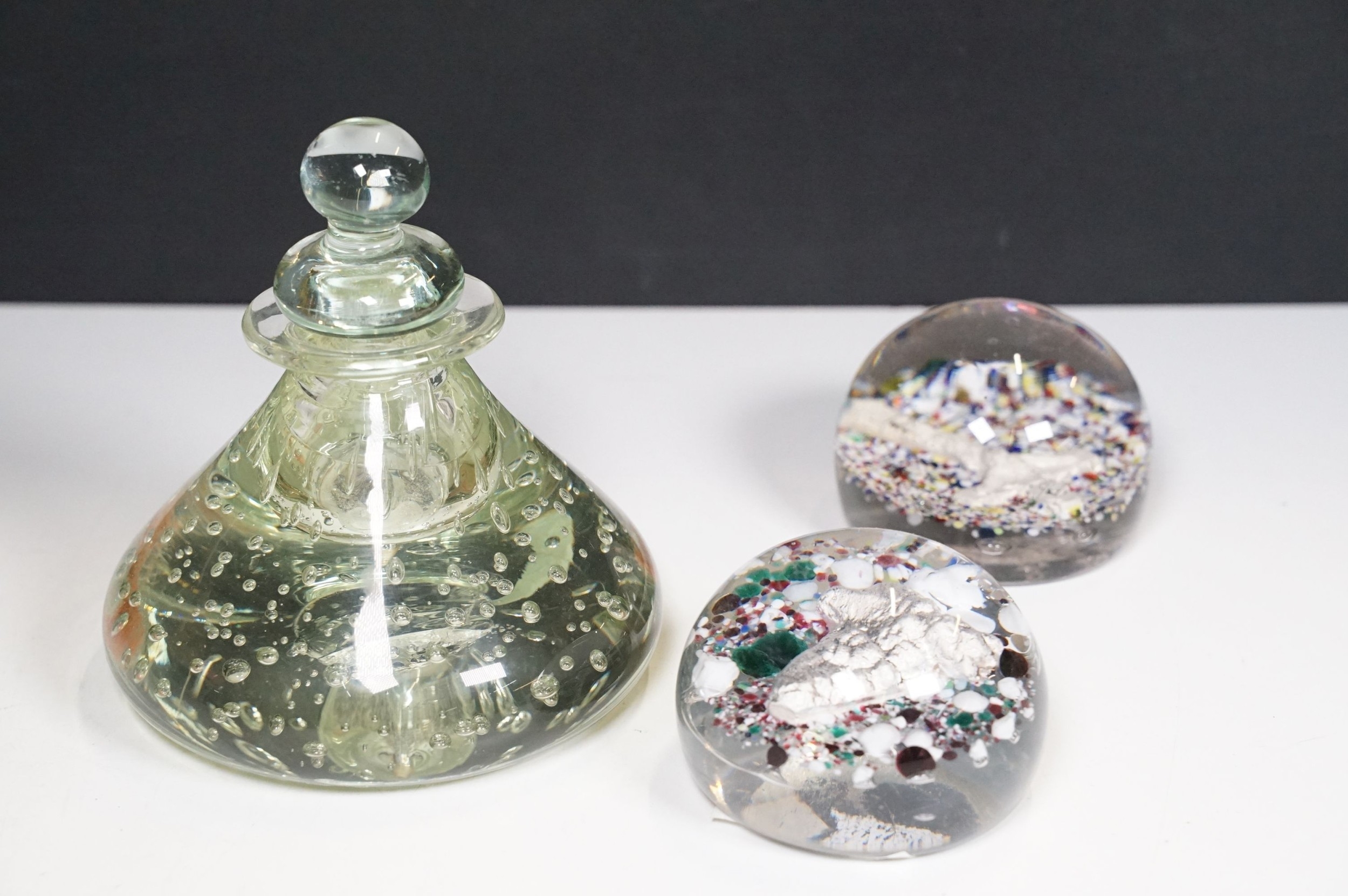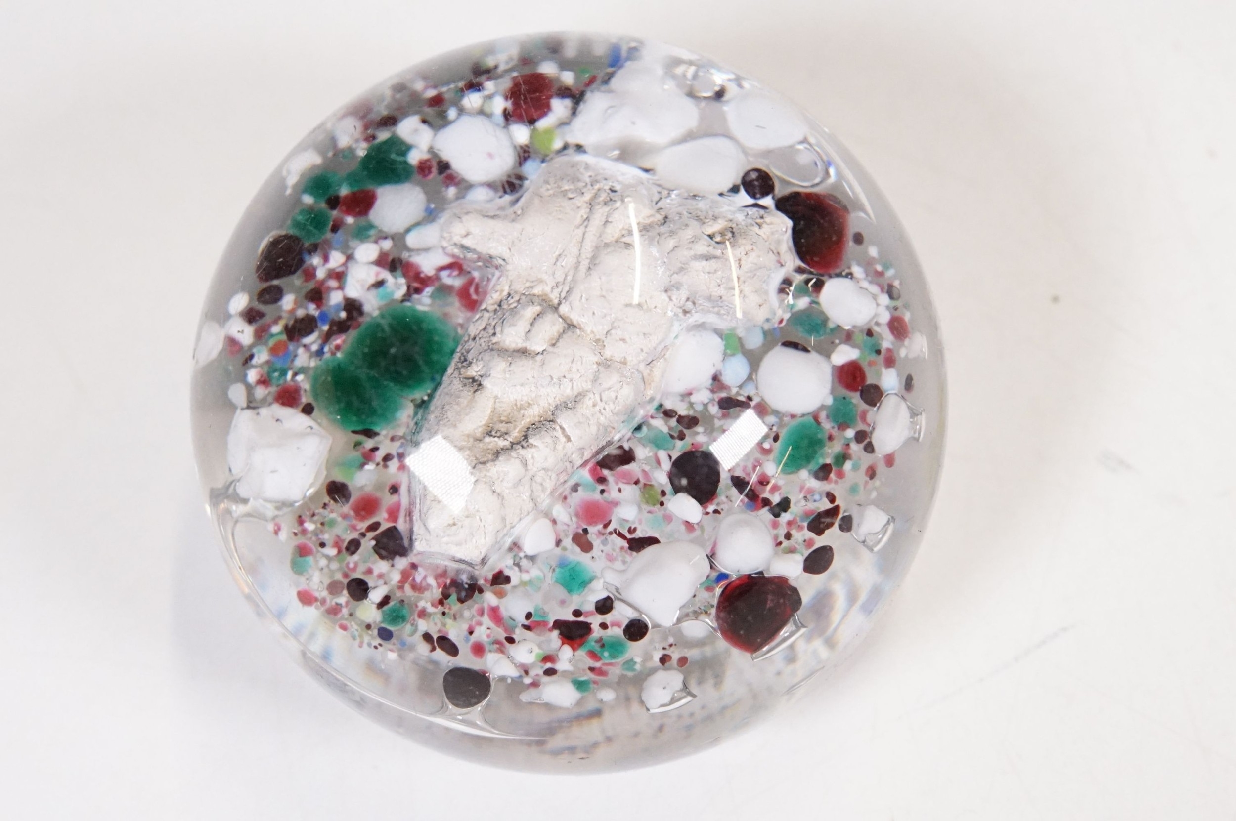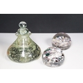 Victorian dump glass bubble ink well together with two sulfide inclusion paperweights, one lion and one crucifix example (1 box)