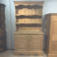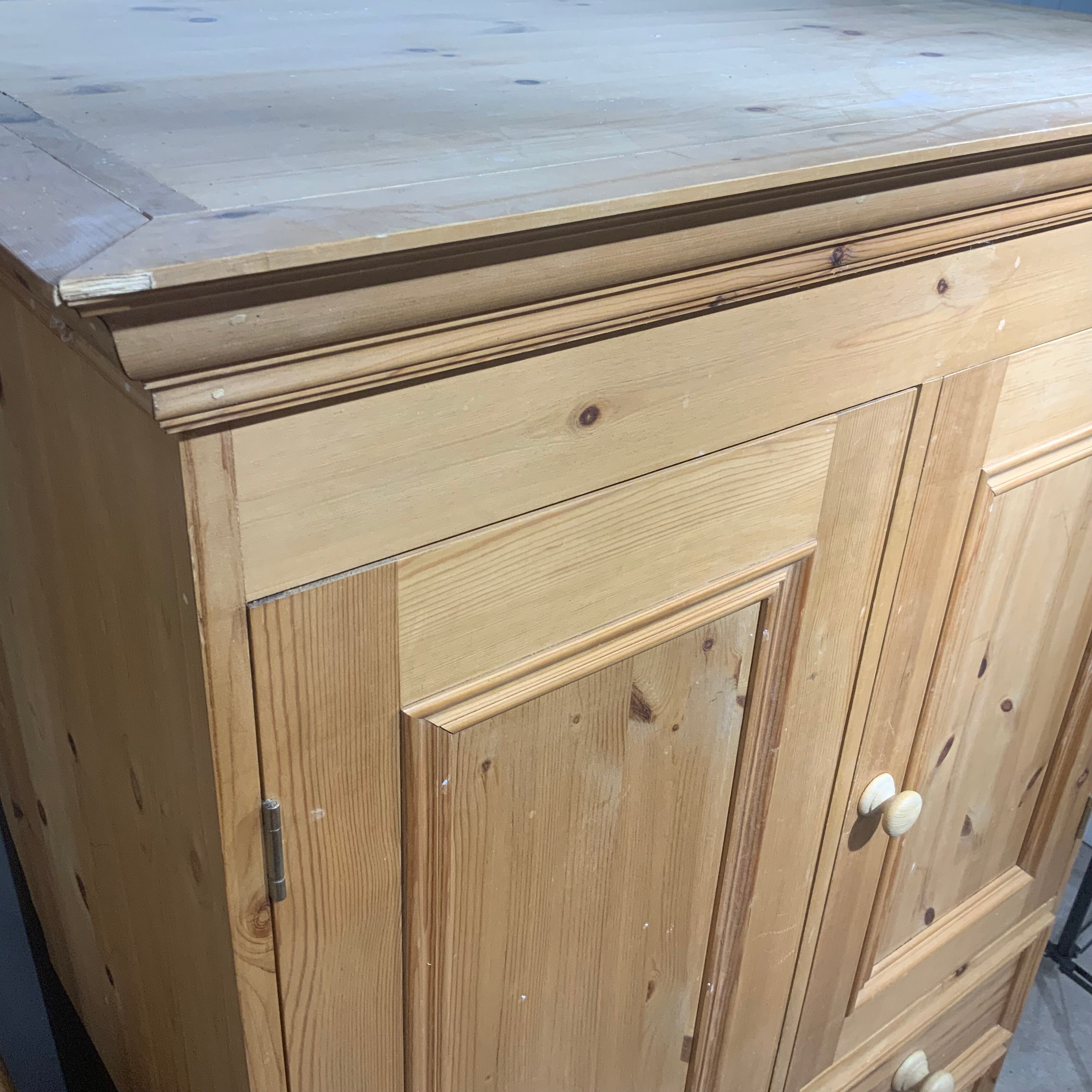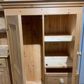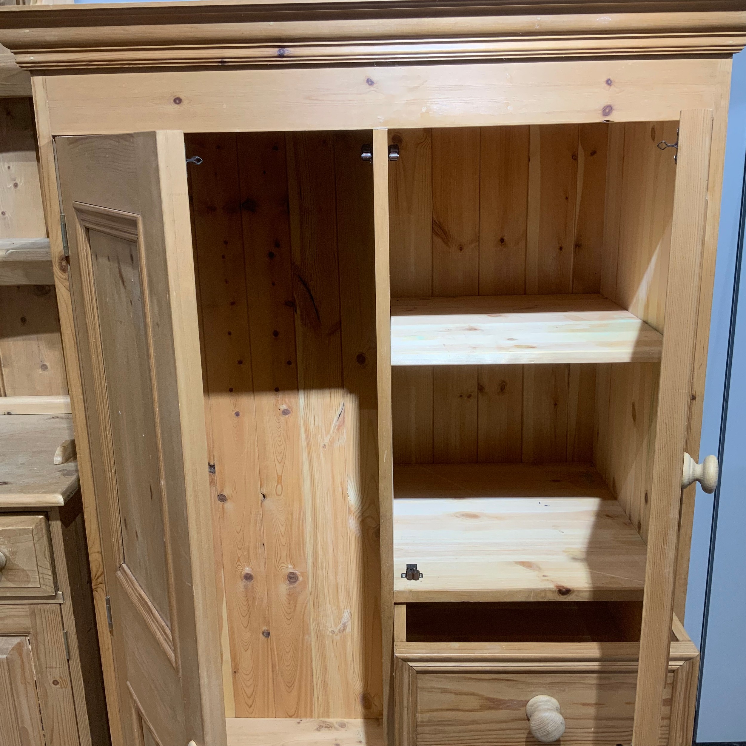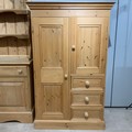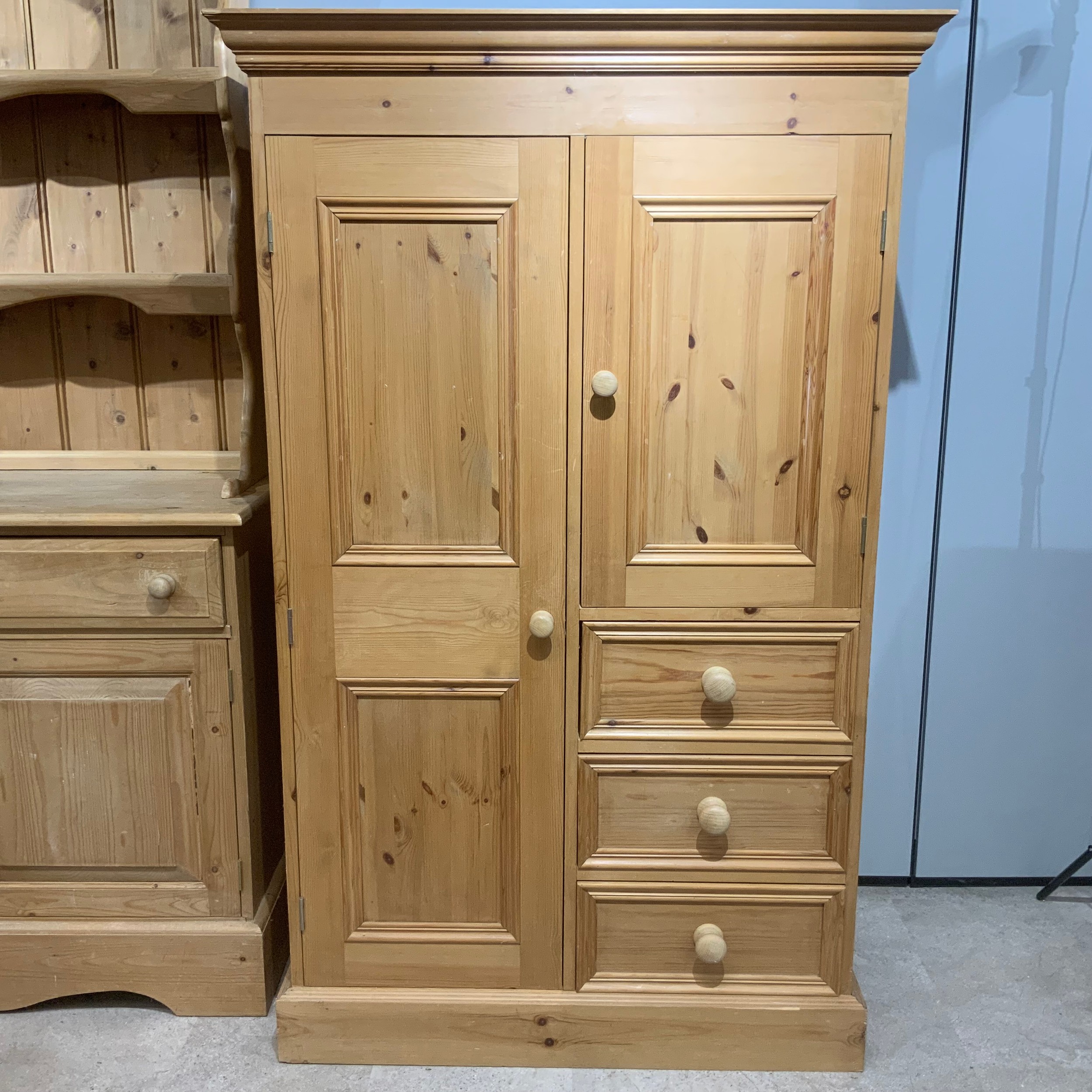 Contemporary 3/4 pine combi-wardrobe, comprising a single wardrobe flanked by a cupboard with an internal shelf, above a bank of three short drawers. H150cm x W93.5cm x D55cm.