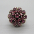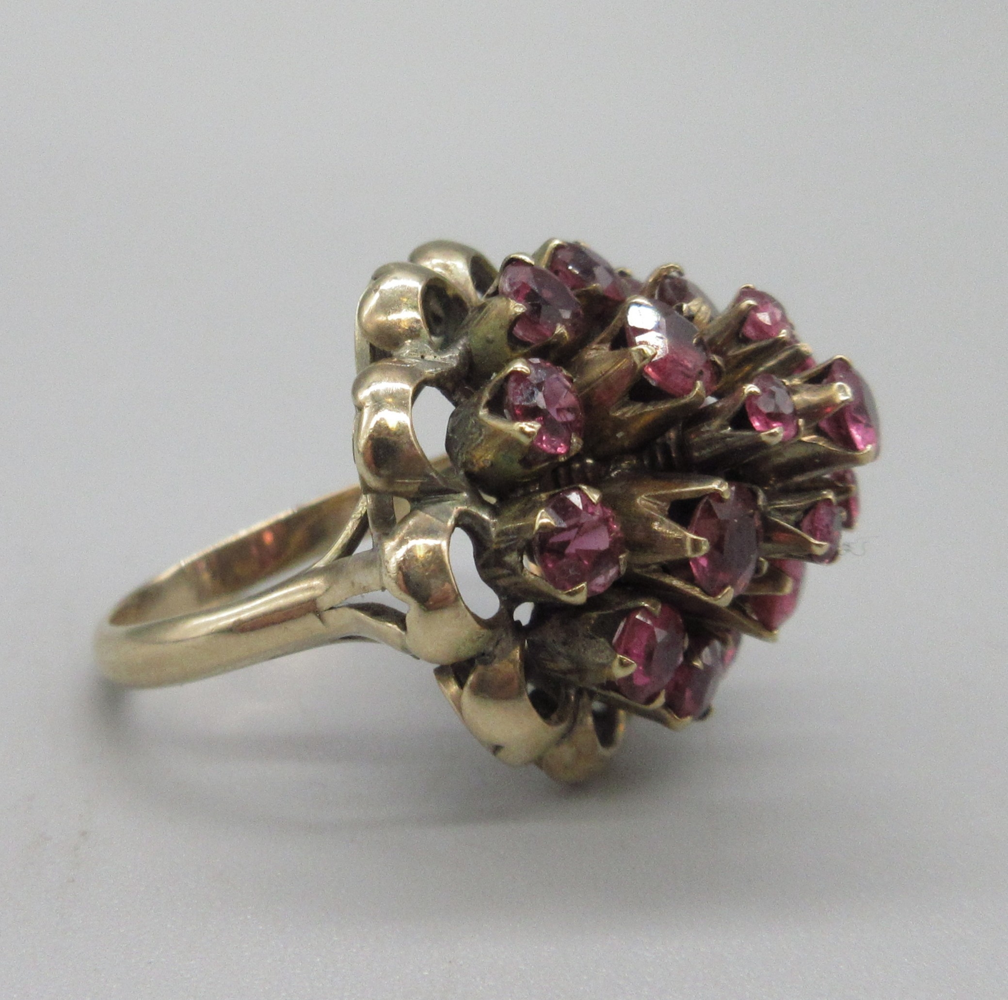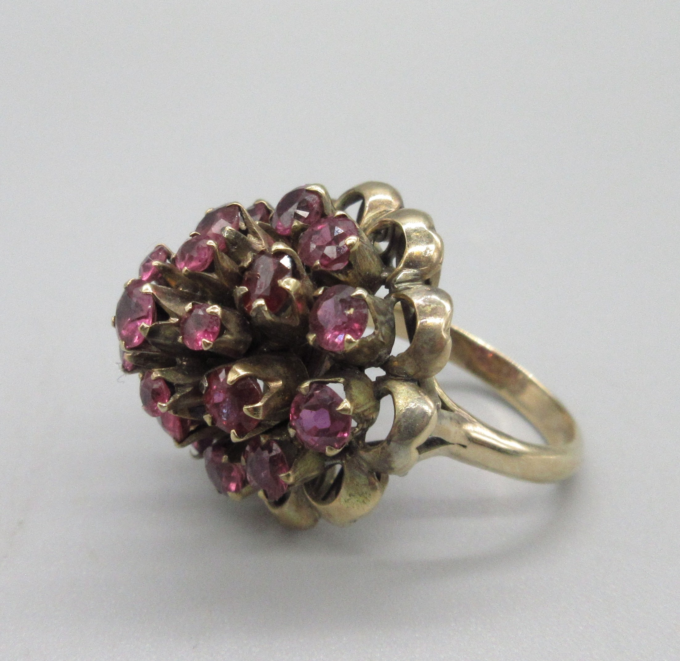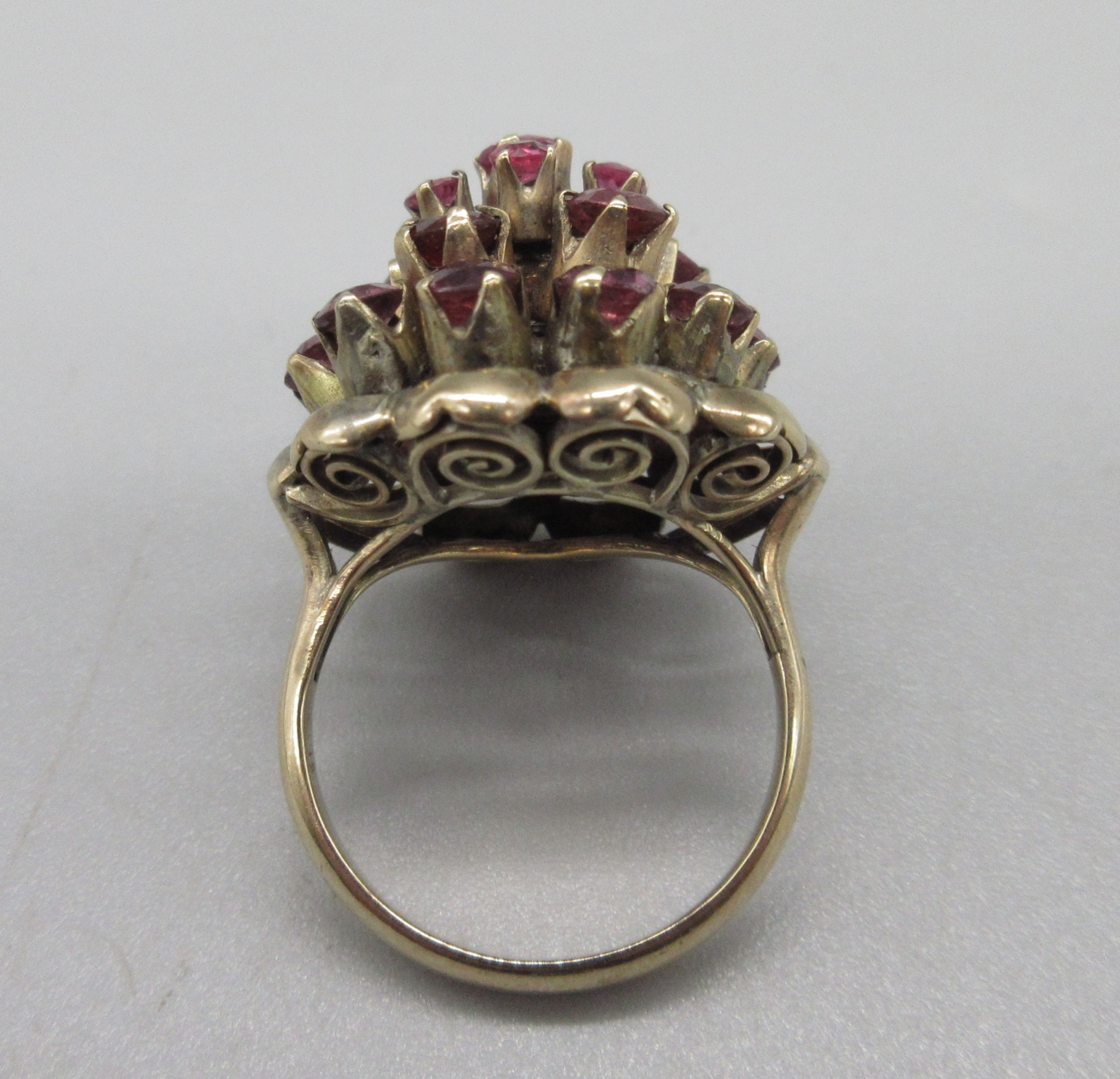 18ct yellow gold princess ring set with twenty-one rubies, stamped 18k, size K, 6.6g
