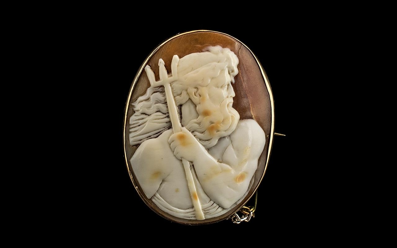 An Antique Classical Cameo Depicting Neptune In a Pose From Roman Antiquity, Holding His Symbolic Trident and Sporting Flowing Locks and a Beard. Housed In An Oval 9ct Gold Frame. c.1850's / 1860's. Size 1.3/4 x 1.5 Inches. Excellent Condition In All Aspects - Please Confirm with Photo. Provenance - From a Ladies Private Collection.