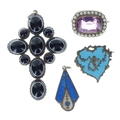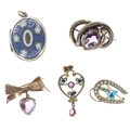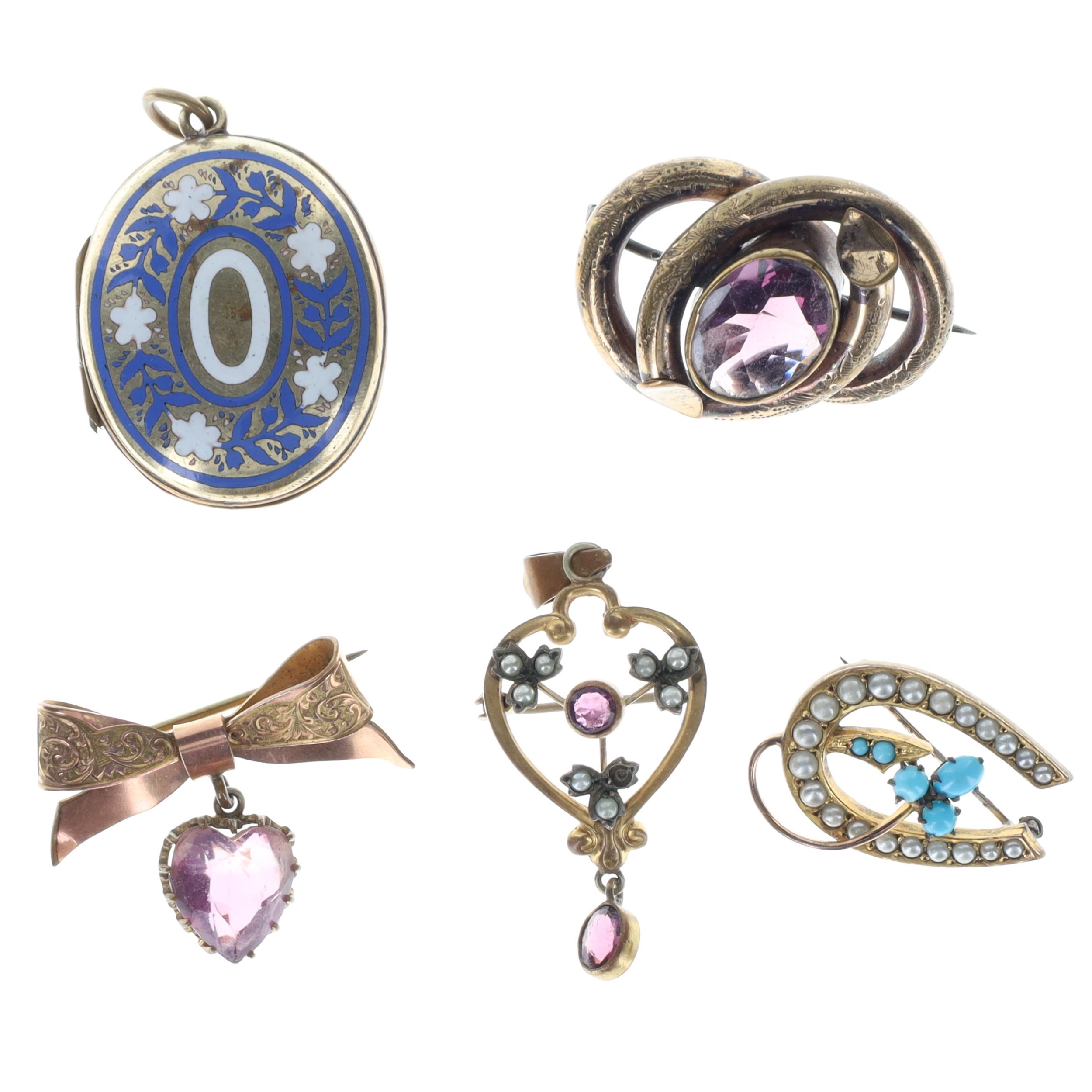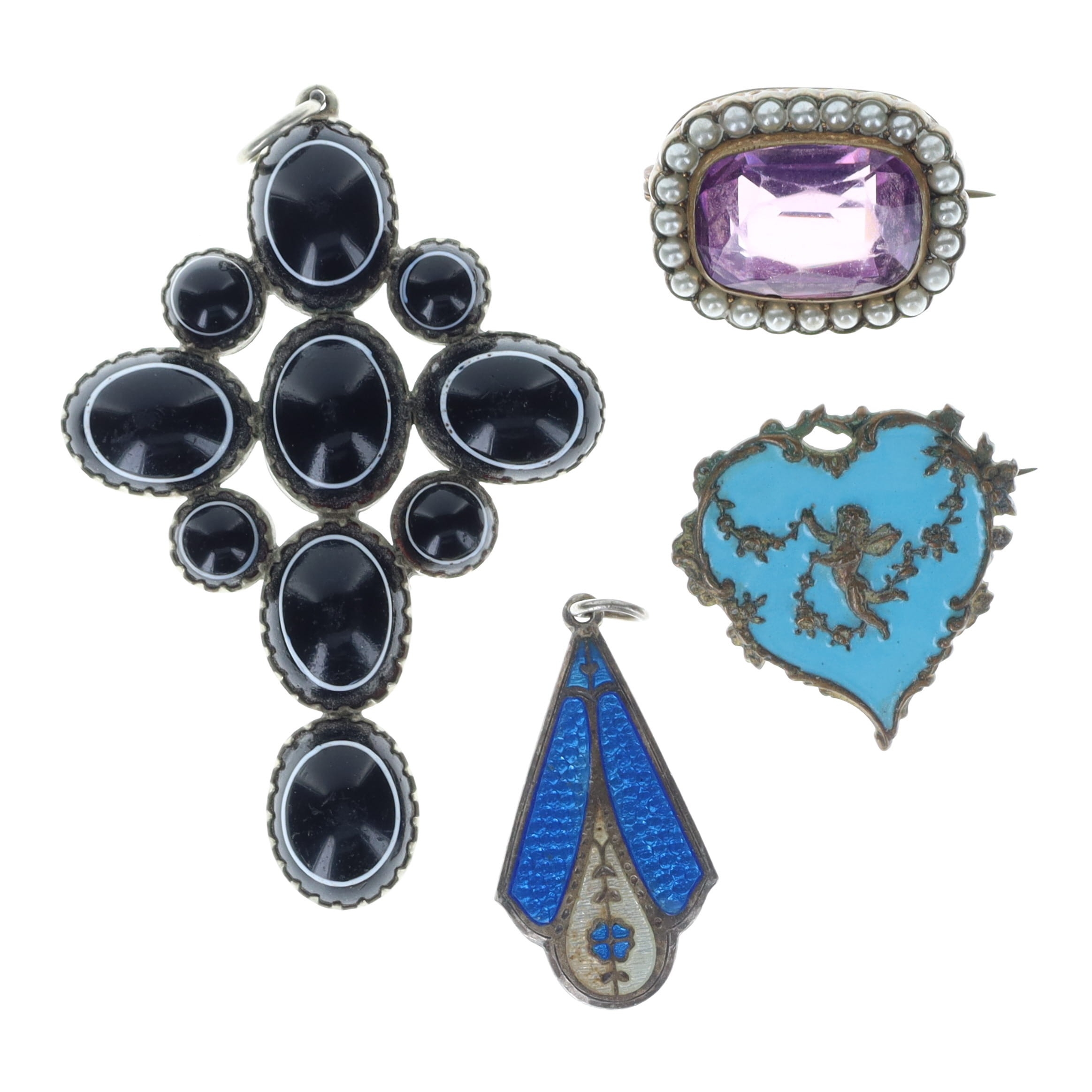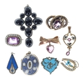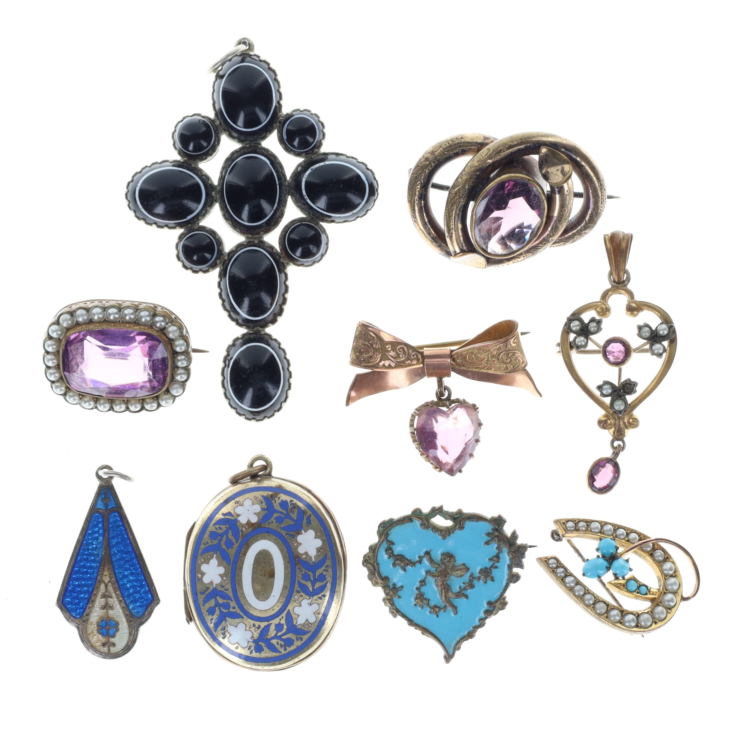 Collection of antique jewellery inc. gemstone, enamel, paste. There are a variety of sizes. Signs of general age and wear as expected. Weighs in total 65.5g
