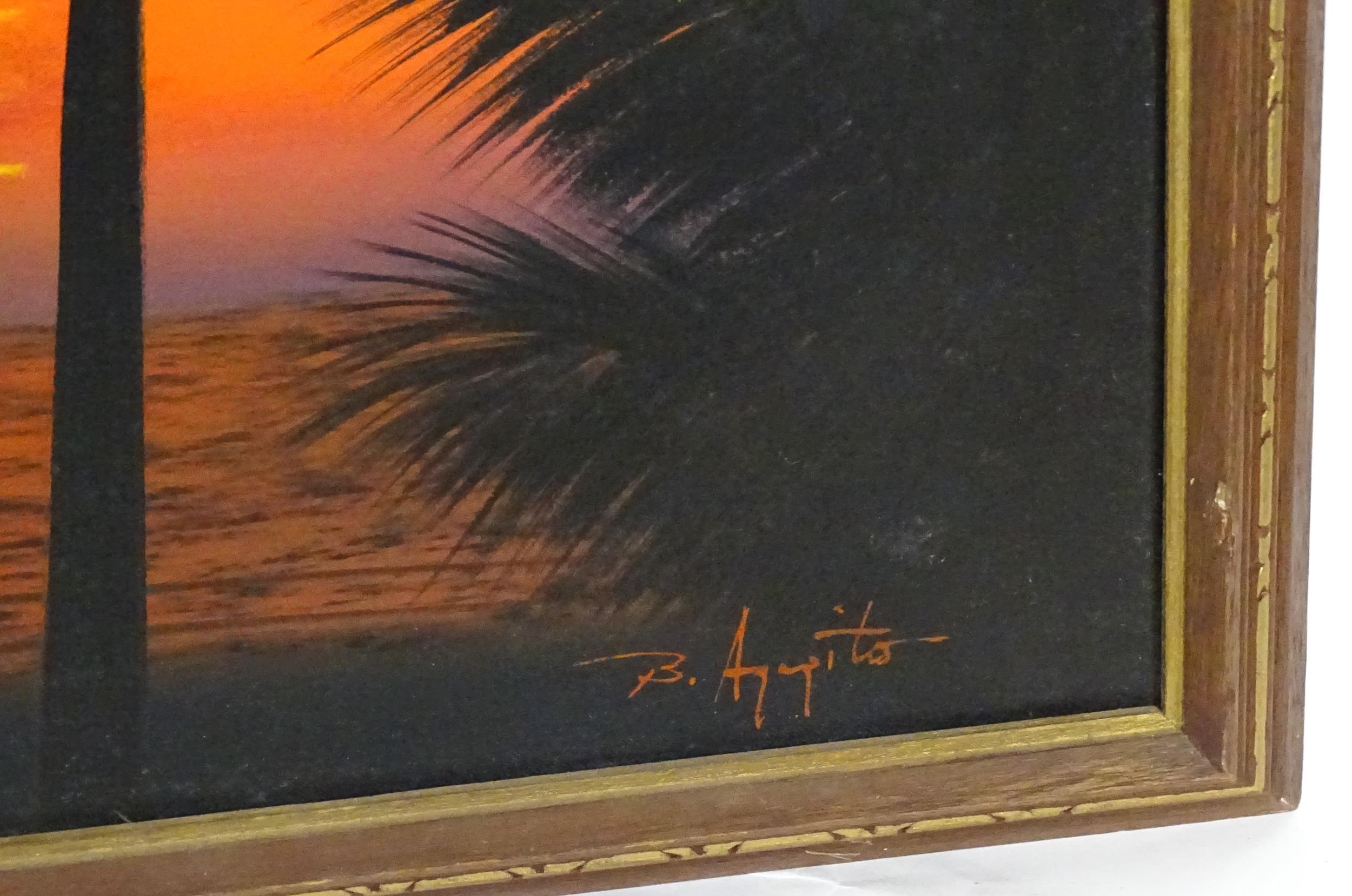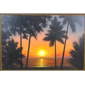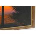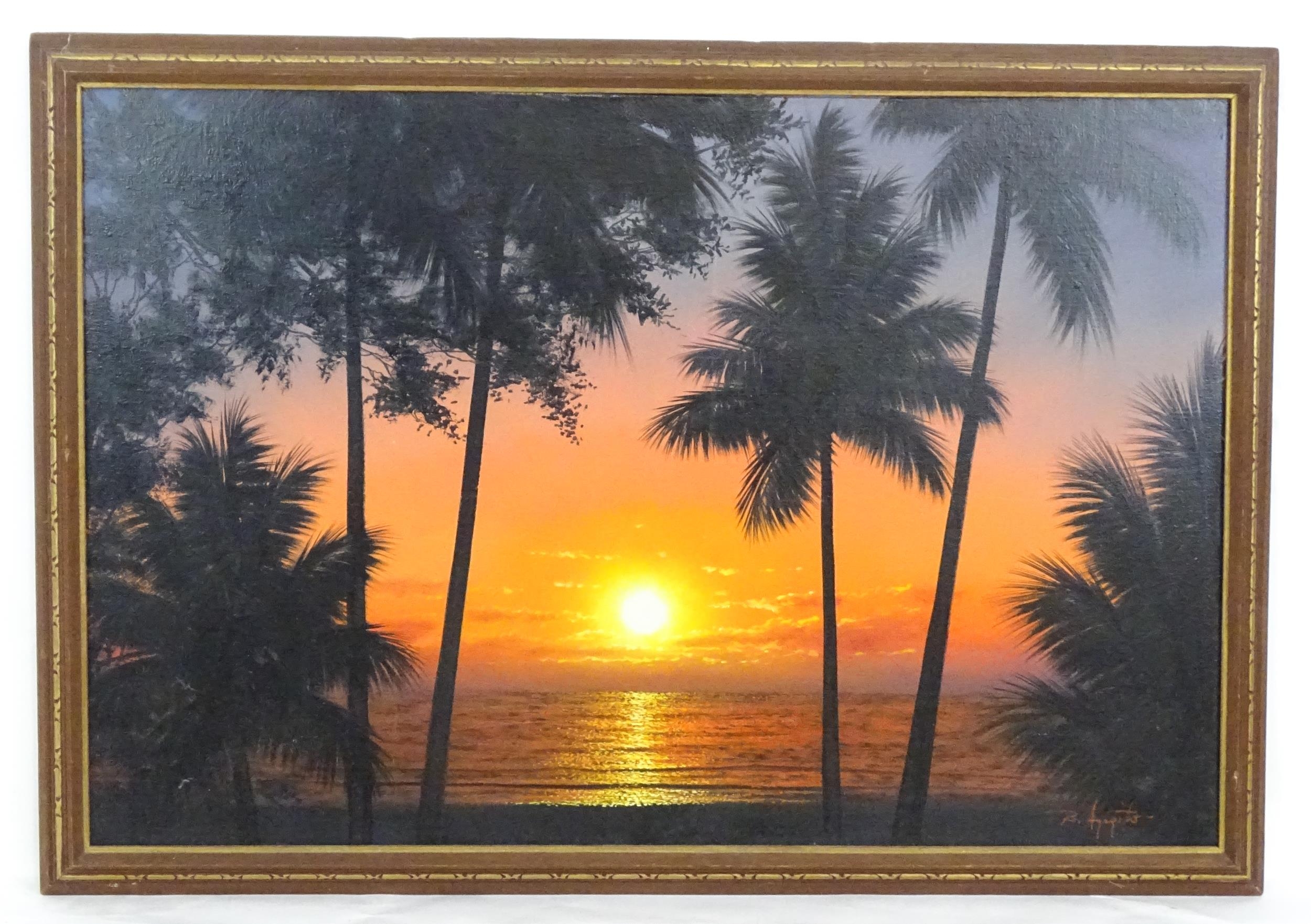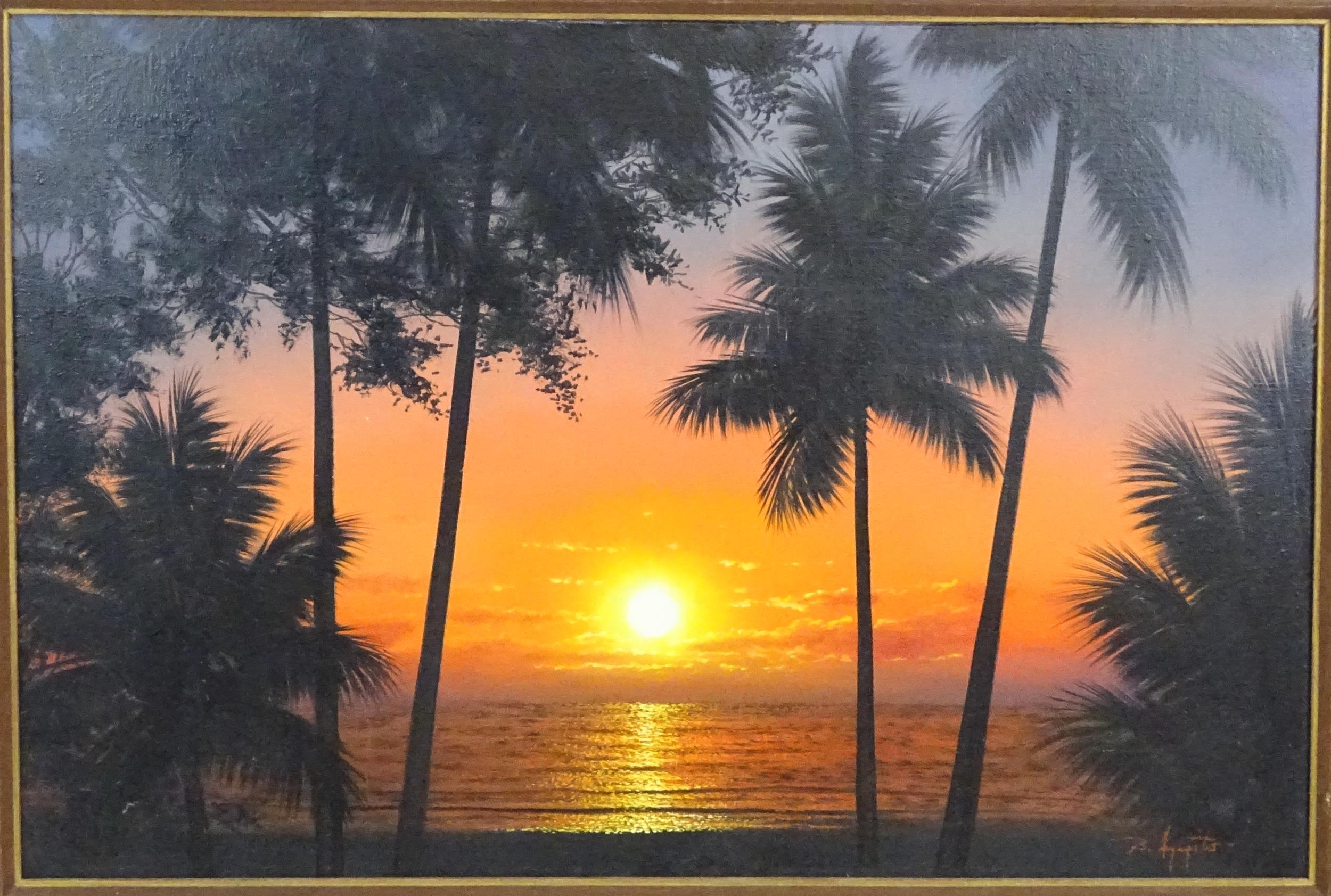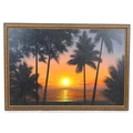 20th century, Oil on canvas, A sunset over the sea with silhouetted palm trees. Signed lower right. Approx. 23 3/4" x 35 1/2"