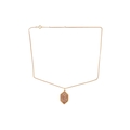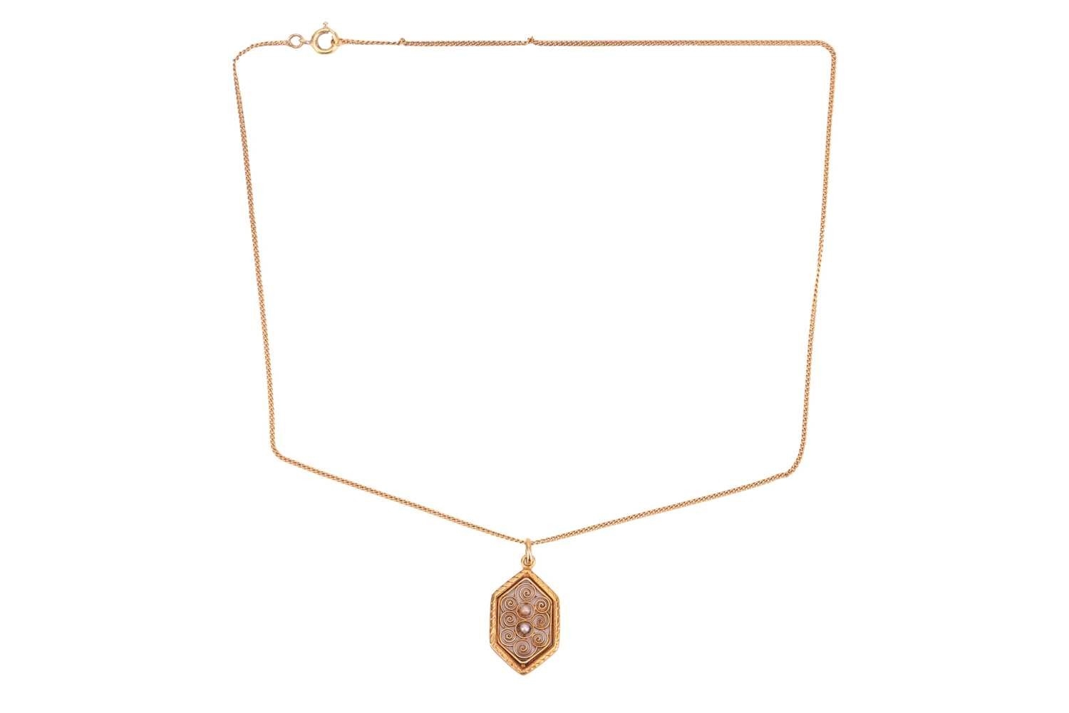 A filigree pendant, the six-sided panel featuring filigree detailing of spiral design, centrally set with two seed pearls, in yellow metal marked ‘750’, to a yellow metal flat curb link chain marked ‘585’, measuring approximately 42cm; 4.0 grams.