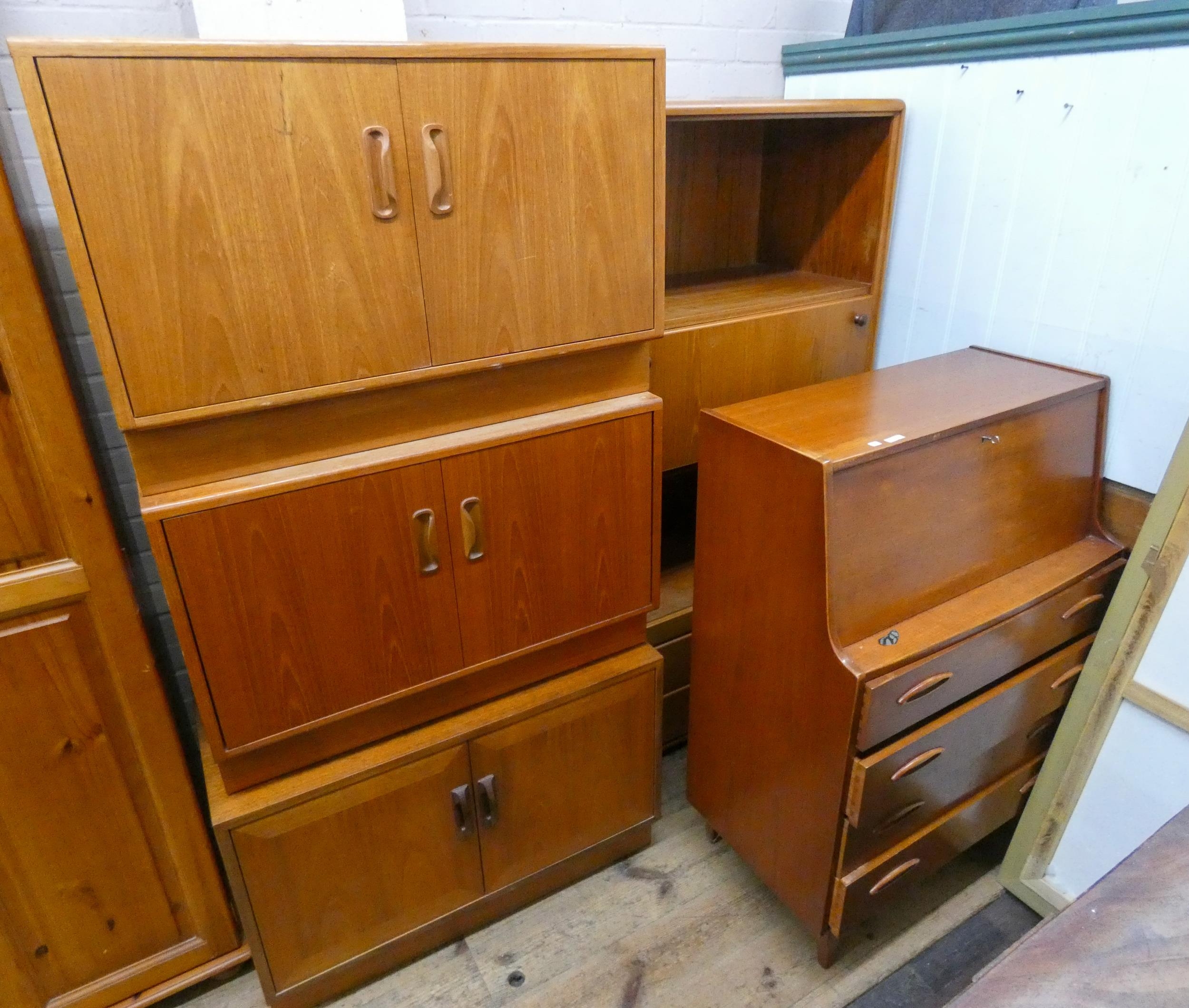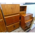 Teak bureau with four long drawers under, three small floor cabinets and a display unit