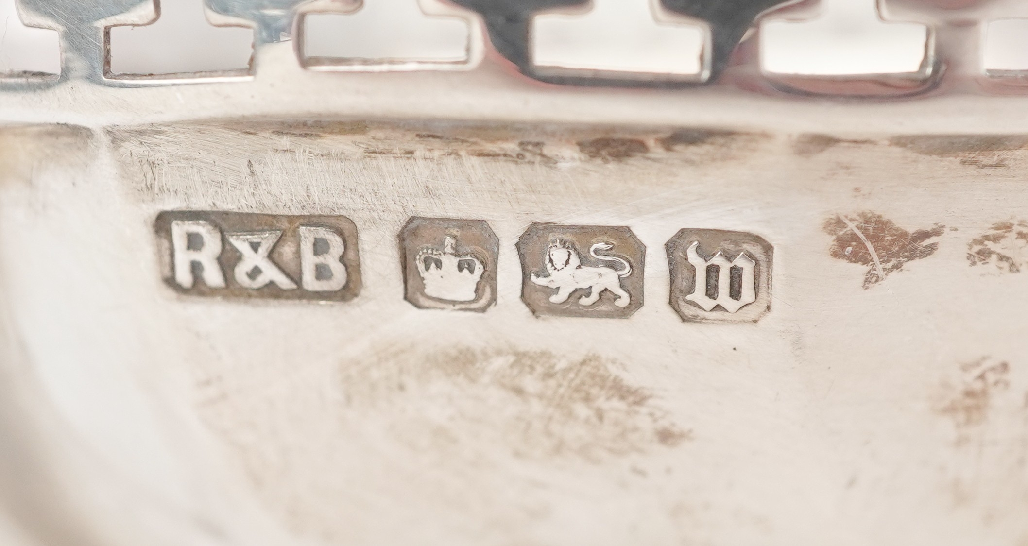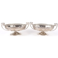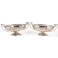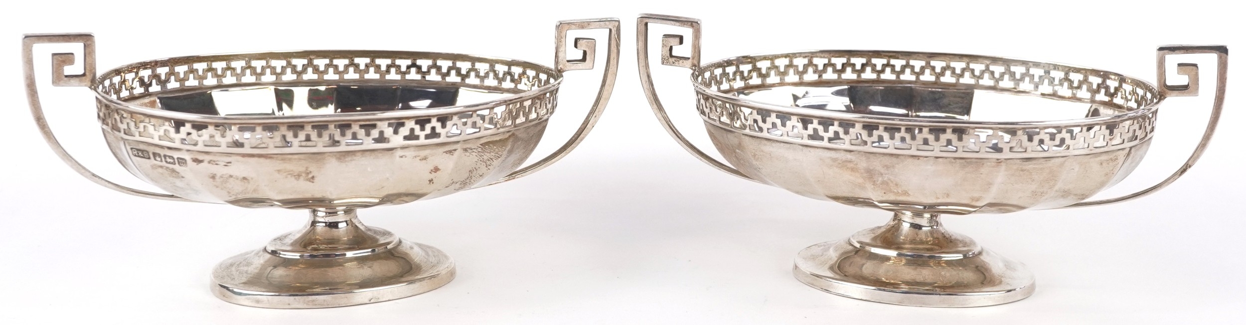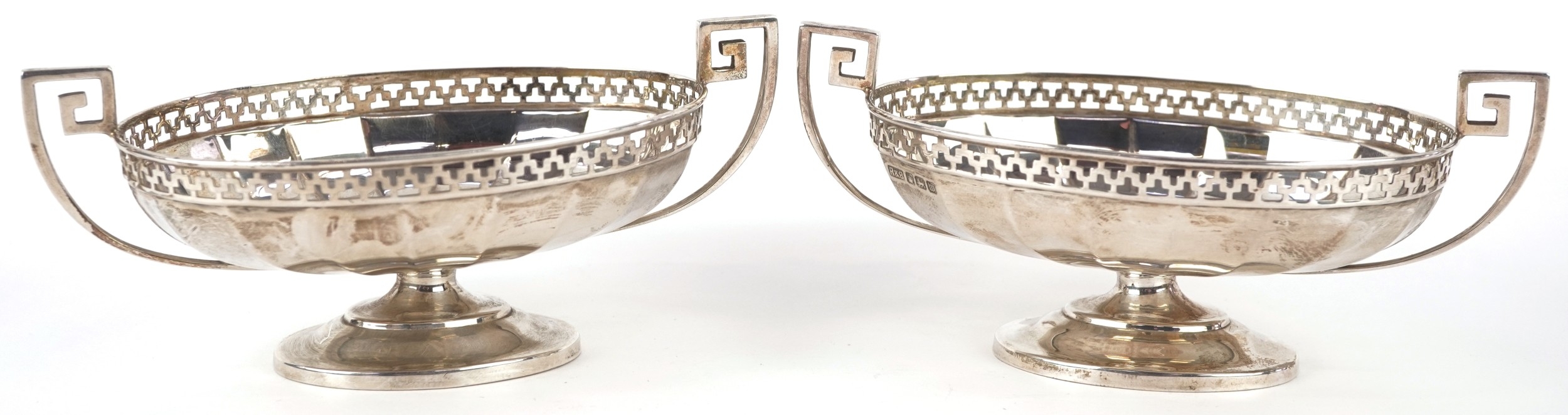 Roberts & Belk Ltd., a pair of George V silver pedestal sweetmeat dishes having twin handles and pierced galleries, Sheffield 1914, 14.5cm wide, total 172.0g.