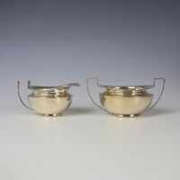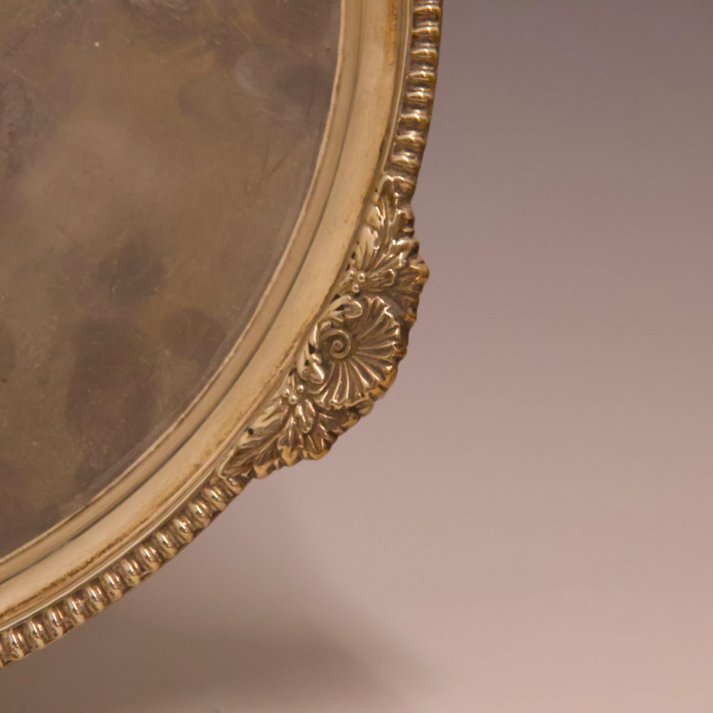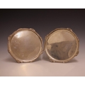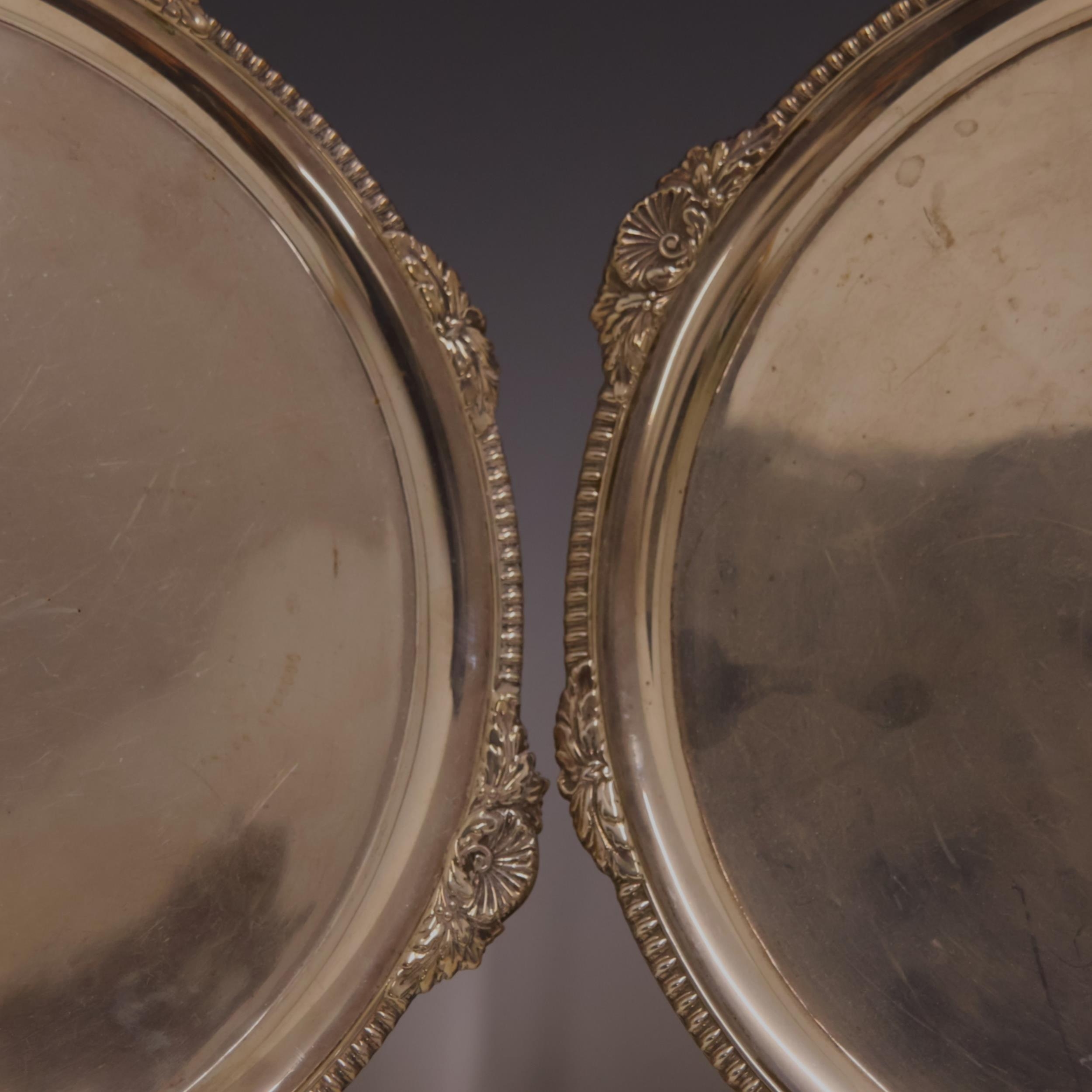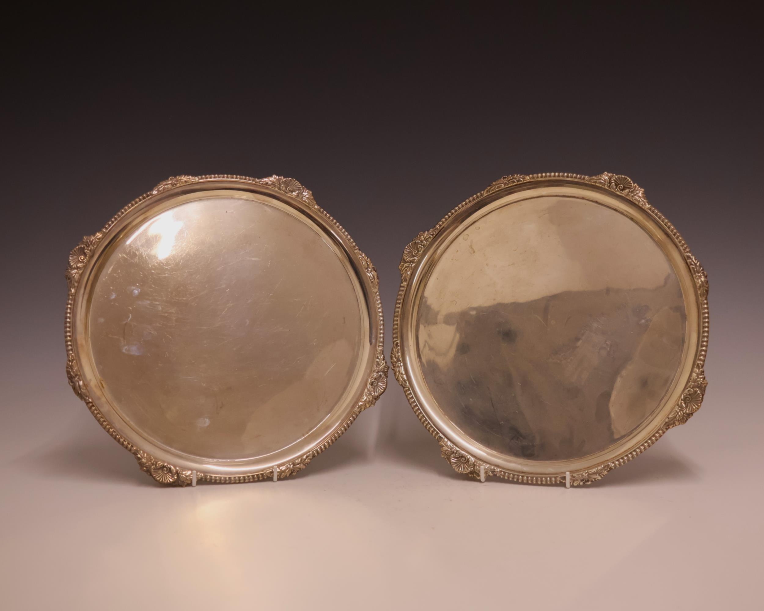 A pair of George IV silver salvers, Harrods Ltd, London 1938, each of circular form with shell and gadroon style decoration to the rim, upon four conforming scroll feet, 33cm wide, 54ozt (2)