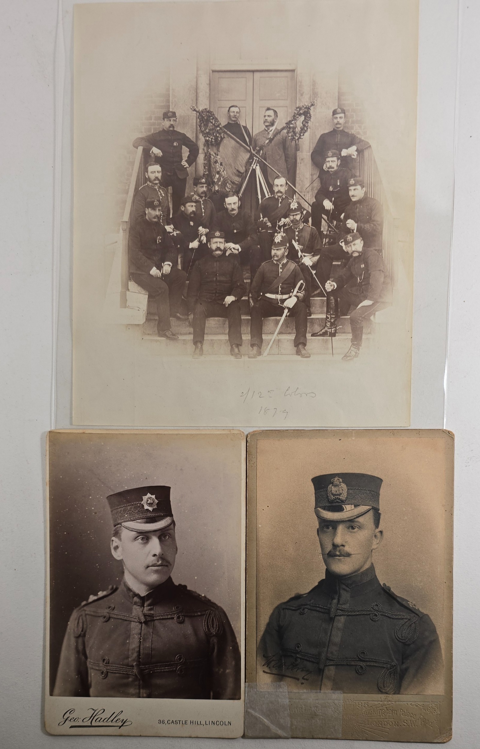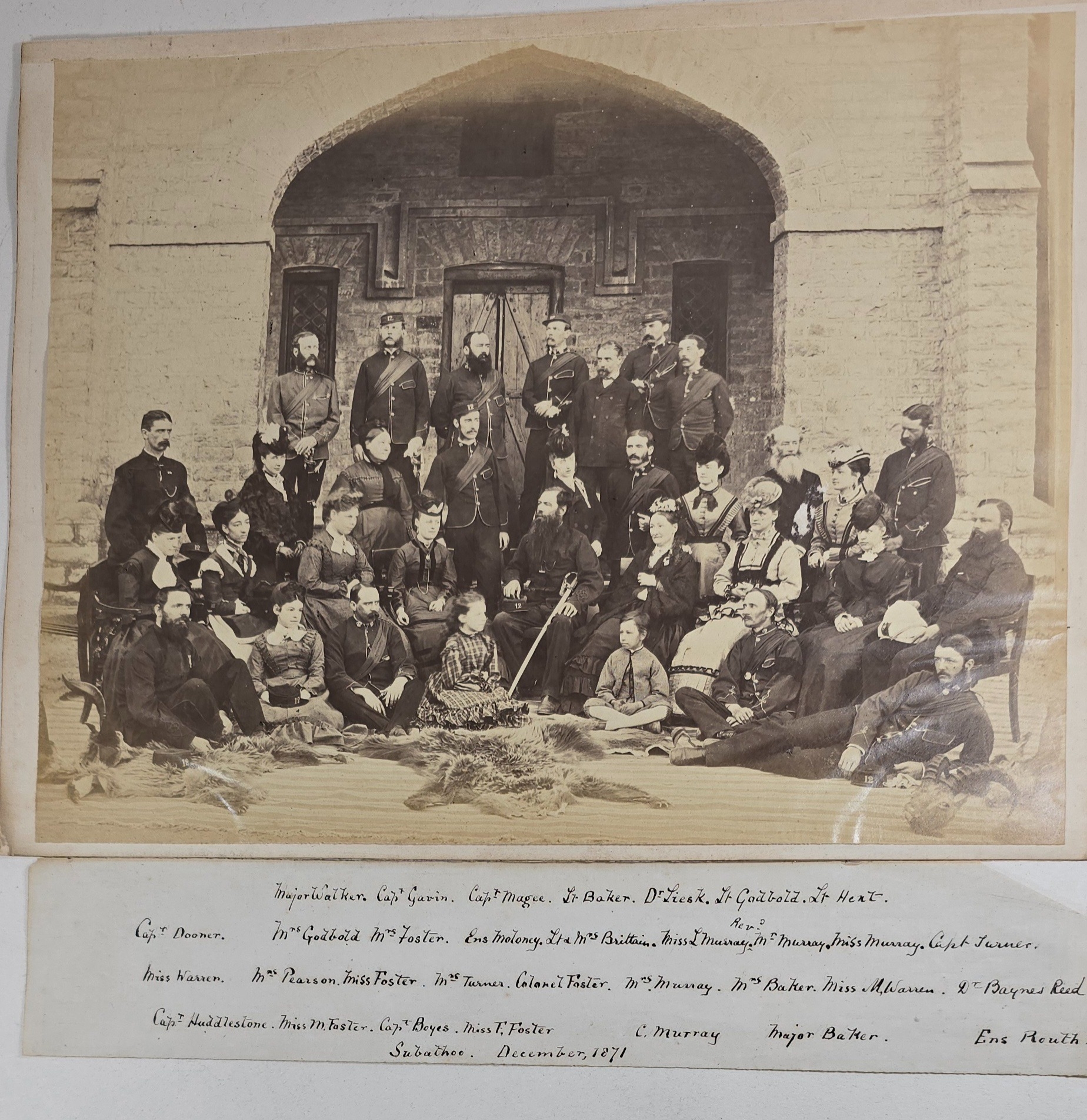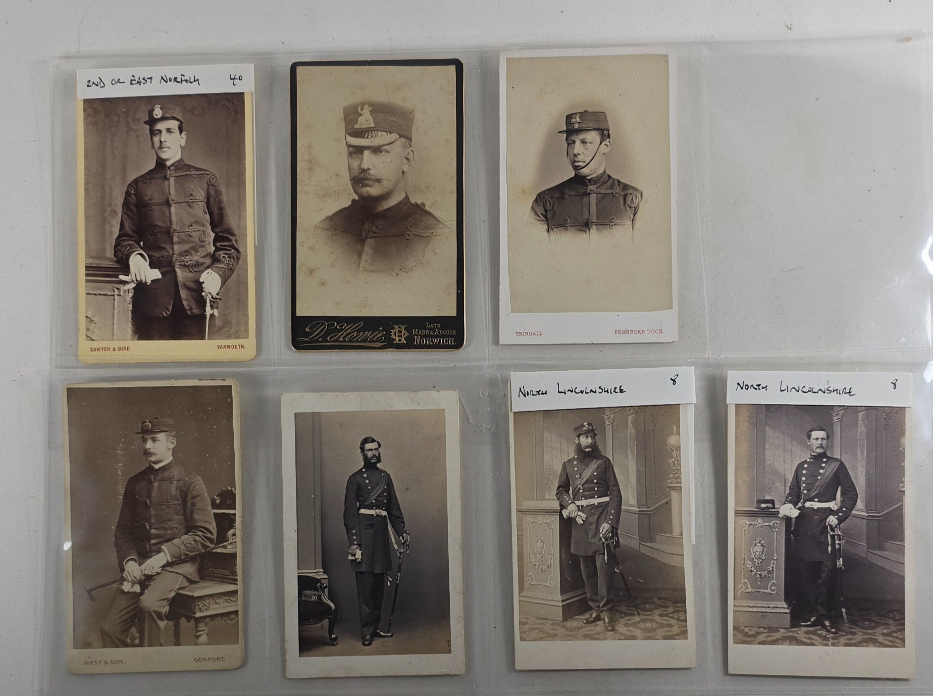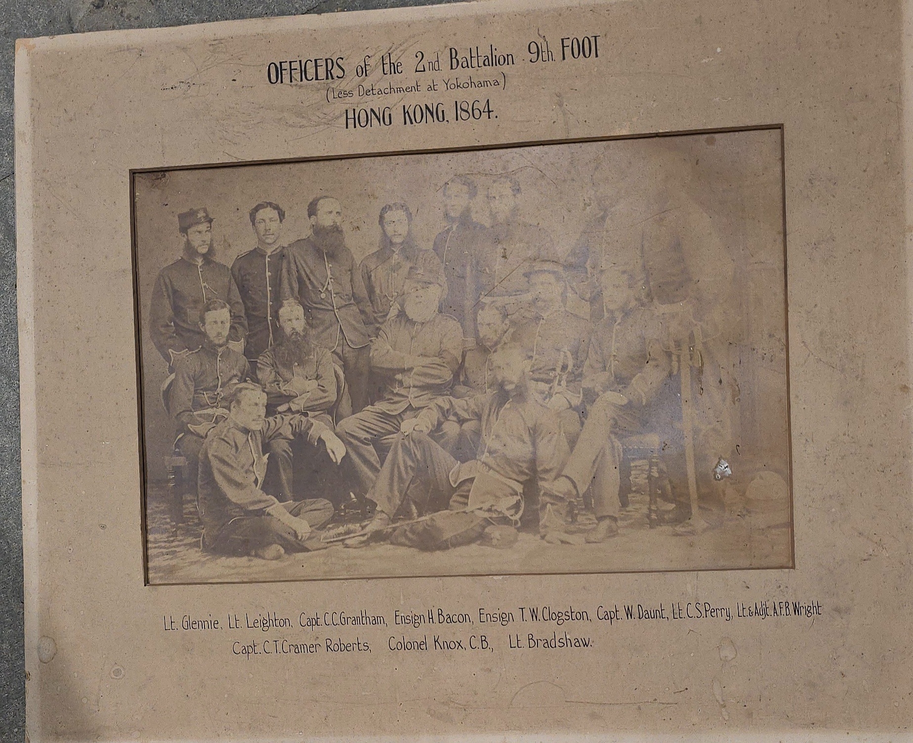 The regiments of East Anglia:- Norfolk, Suffolk and Lincolnshire- a group of 19 Victorian photos comprising :-The Norfolk Regiment:- a huge regimental named officer group of 2nd Bn. 9th Foot, (less Detachment at Yokohama), at Hong Kong, on the mount date is given as 1864 but on border of photo ink description says 1865, with mount 60.5 cm x 50 cm., a group of soldiers from Norfolk Regiment relaxing in camp at Bombay, one soldier wearing regimental yellow pugri on helmet, two cdvs of officers, one of 9th Foot, 1860s, the other of Norfolk Regiment, 1880s/90s, and another cdv of officer of 2nd or East Norfolk Militia, 1870s: Lincolnshire Regiment-a good named officer group, March, 1891, a cabinet photo of officer of Lincolnshire Regiment in forage cap and blue patrols, 3 more cdvs, 1860s, one of officer of 10th Foot, two of North Lincolnshire Militia including one with grenade over title scroll on cap : Suffolk Regiment- an officer group with colours from 2/12 th Foot at Gosport on Minden Day, in various orders of dress, 1879, a cabinet photo of officer of Suffolk Regiment, 1890s, a cdv of officer of 12th Foot, 1870s, a named officer group of 12th Foot under Colonel Foster with their ladies, at Subathoo, (Subathu),India, December, 1871, and three album leaves, c.1860, with albumen portraits of officers of 12th Foot, named as Edward Herrick, Henry Smith Andrews, 1st Bn. and Ensign Campbell Thomas Morris, also 1st Bn.,each with another military portrait on reverse including Henry Francis Hutton, 23rd Royal Welch Fusiliers