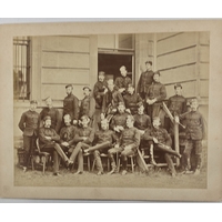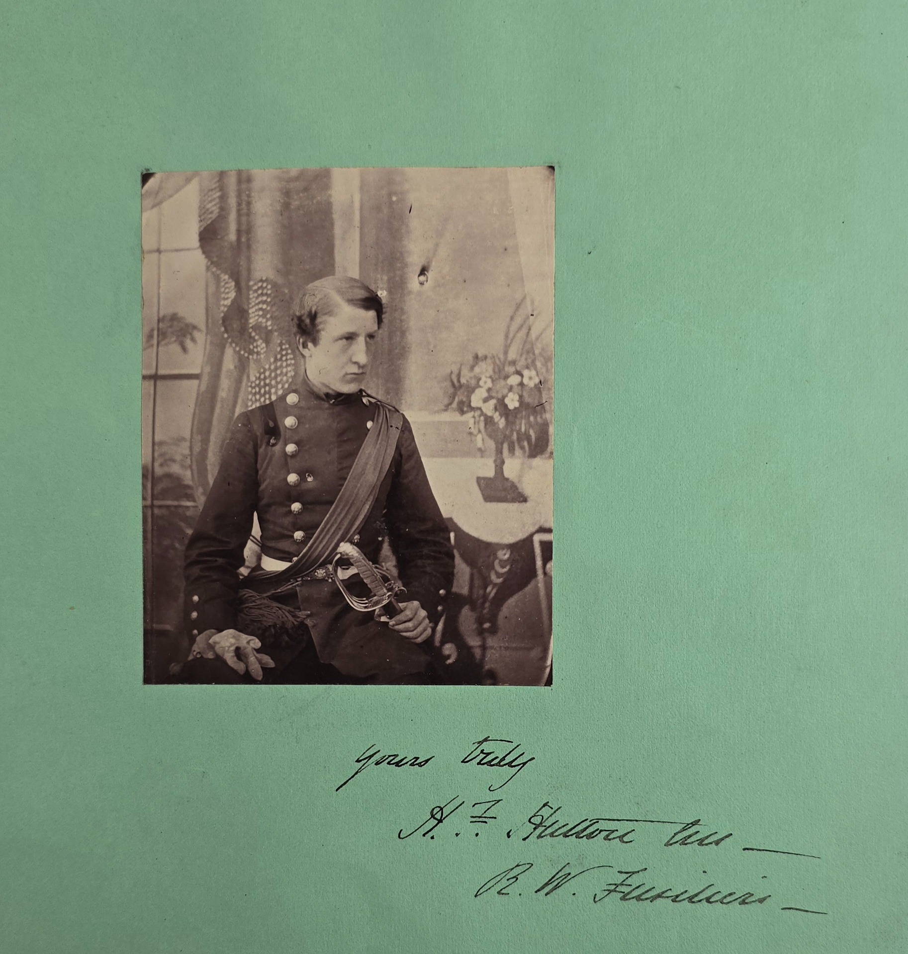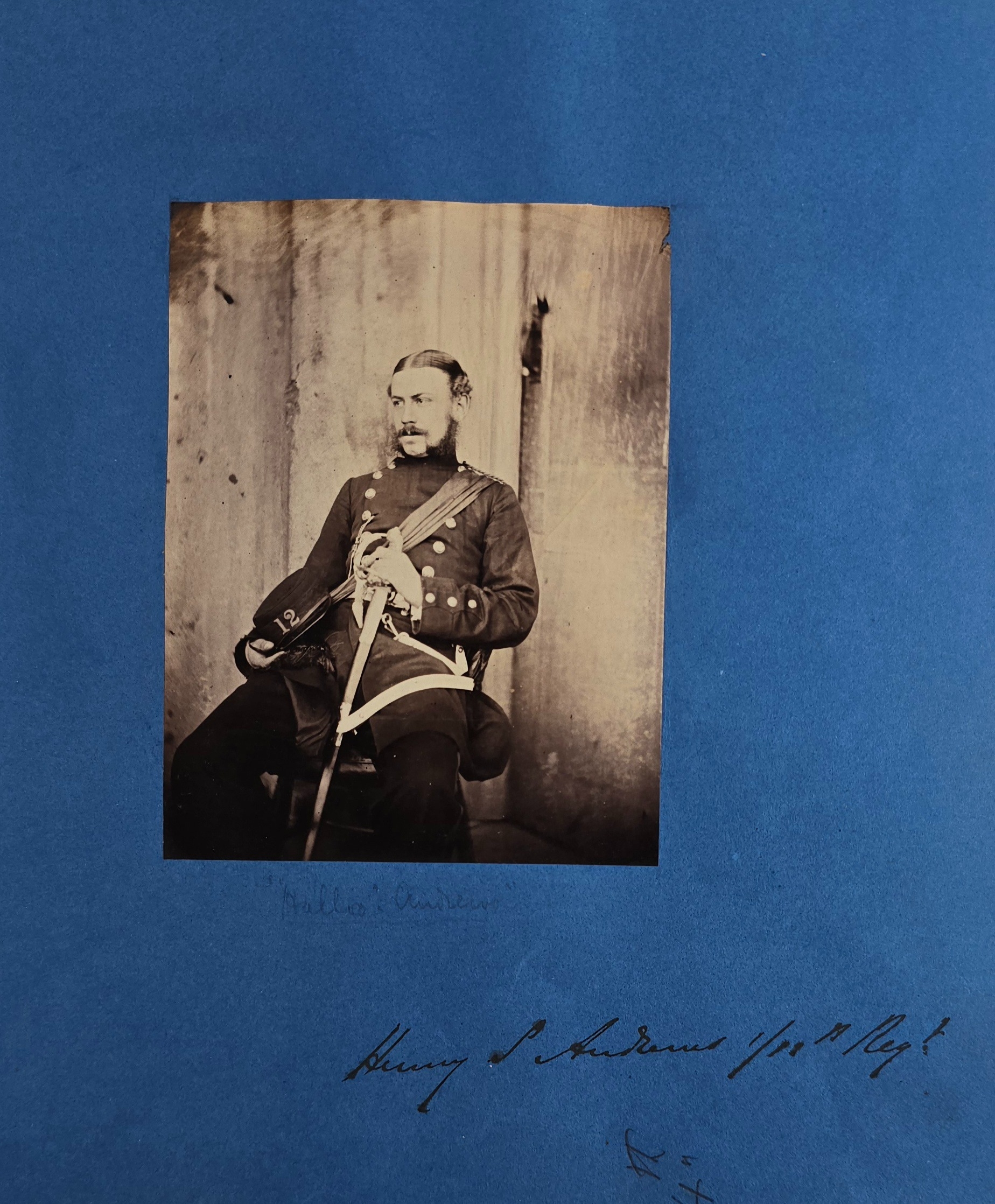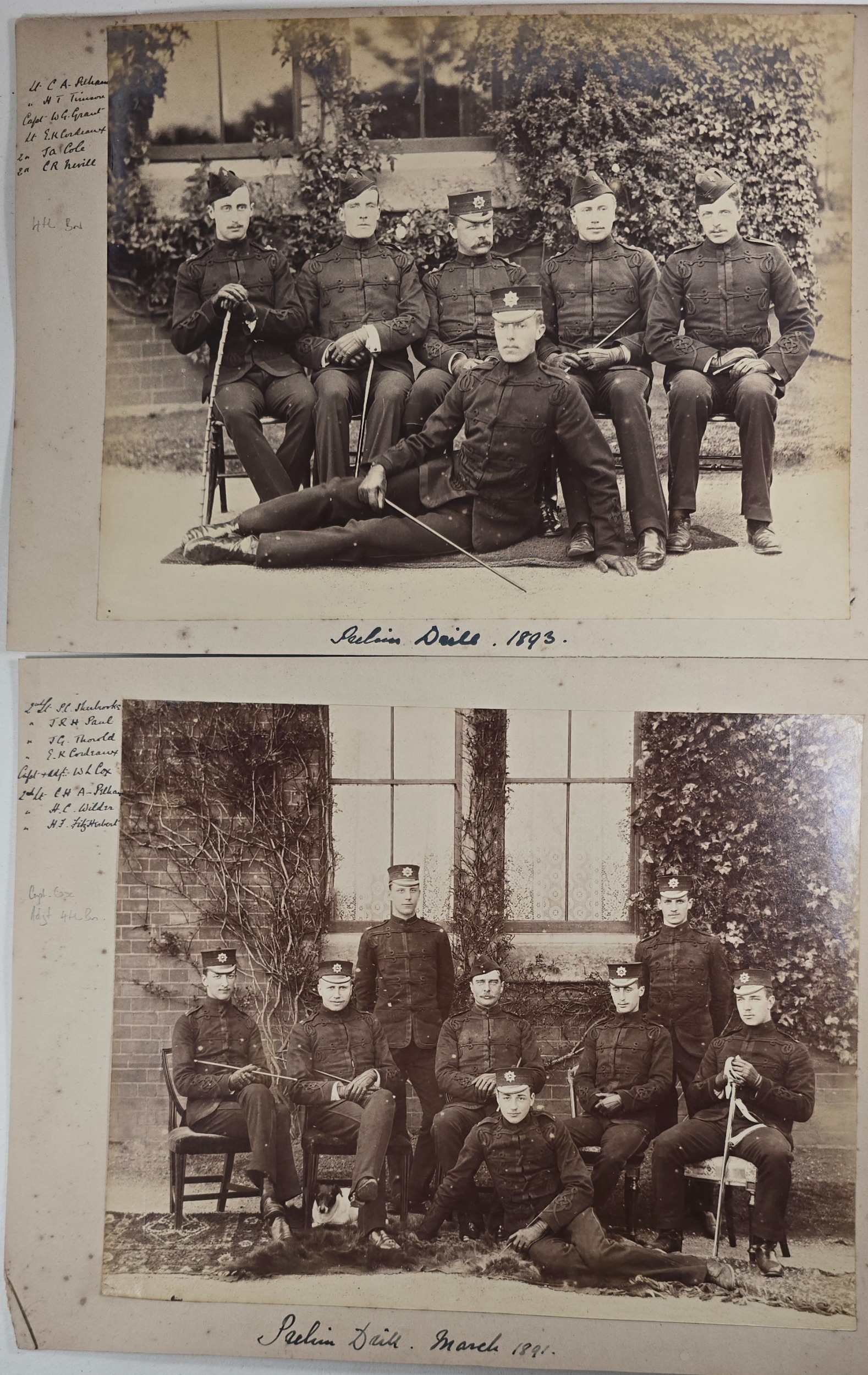 The regiments of East Anglia:- Norfolk, Suffolk and Lincolnshire- a group of 19 Victorian photos comprising :-The Norfolk Regiment:- a huge regimental named officer group of 2nd Bn. 9th Foot, (less Detachment at Yokohama), at Hong Kong, on the mount date is given as 1864 but on border of photo ink description says 1865, with mount 60.5 cm x 50 cm., a group of soldiers from Norfolk Regiment relaxing in camp at Bombay, one soldier wearing regimental yellow pugri on helmet, two cdvs of officers, one of 9th Foot, 1860s, the other of Norfolk Regiment, 1880s/90s, and another cdv of officer of 2nd or East Norfolk Militia, 1870s: Lincolnshire Regiment-a good named officer group, March, 1891, a cabinet photo of officer of Lincolnshire Regiment in forage cap and blue patrols, 3 more cdvs, 1860s, one of officer of 10th Foot, two of North Lincolnshire Militia including one with grenade over title scroll on cap : Suffolk Regiment- an officer group with colours from 2/12 th Foot at Gosport on Minden Day, in various orders of dress, 1879, a cabinet photo of officer of Suffolk Regiment, 1890s, a cdv of officer of 12th Foot, 1870s, a named officer group of 12th Foot under Colonel Foster with their ladies, at Subathoo, (Subathu),India, December, 1871, and three album leaves, c.1860, with albumen portraits of officers of 12th Foot, named as Edward Herrick, Henry Smith Andrews, 1st Bn. and Ensign Campbell Thomas Morris, also 1st Bn.,each with another military portrait on reverse including Henry Francis Hutton, 23rd Royal Welch Fusiliers