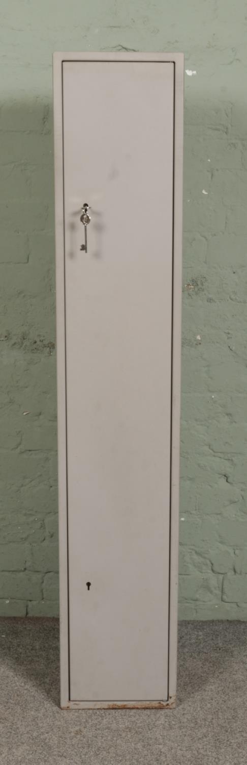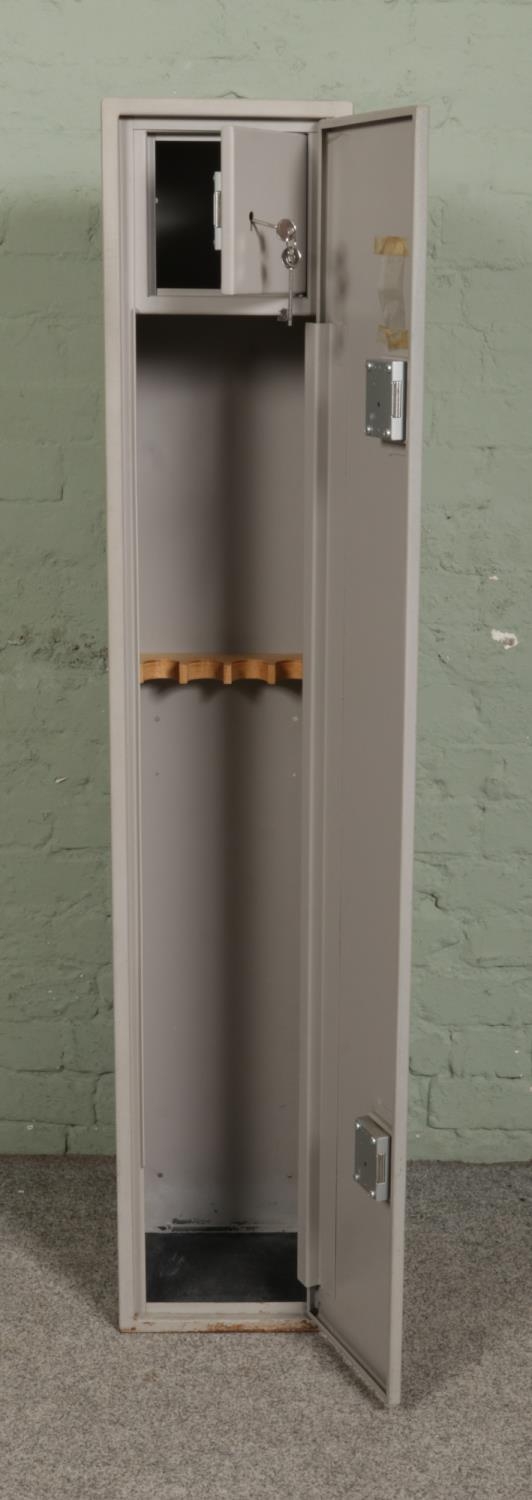 A steel two section gun cabinet, with ACE locks. Height: 151cm, Width: 28cm, Depth: 25cm.