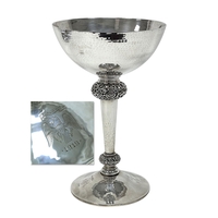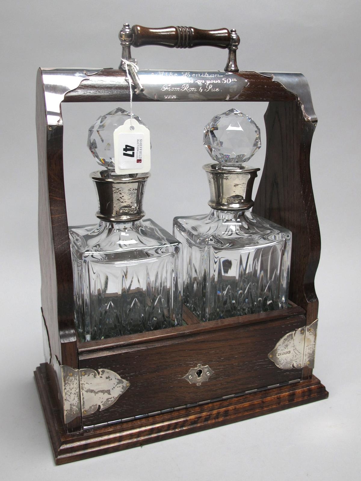 A Modern Hallmarked Silver Mounted Lockable Two Bottle Tantalus, HC, Sheffield 1995, with applied hallmarked silver plaque "Mike Lenihan Congratulations on your 50th From Ron & Sue", fitted with two hallmarked silver mounted stoppered decanters, HC, Sheffield 1995, overall height approximately 37.2cm.