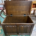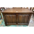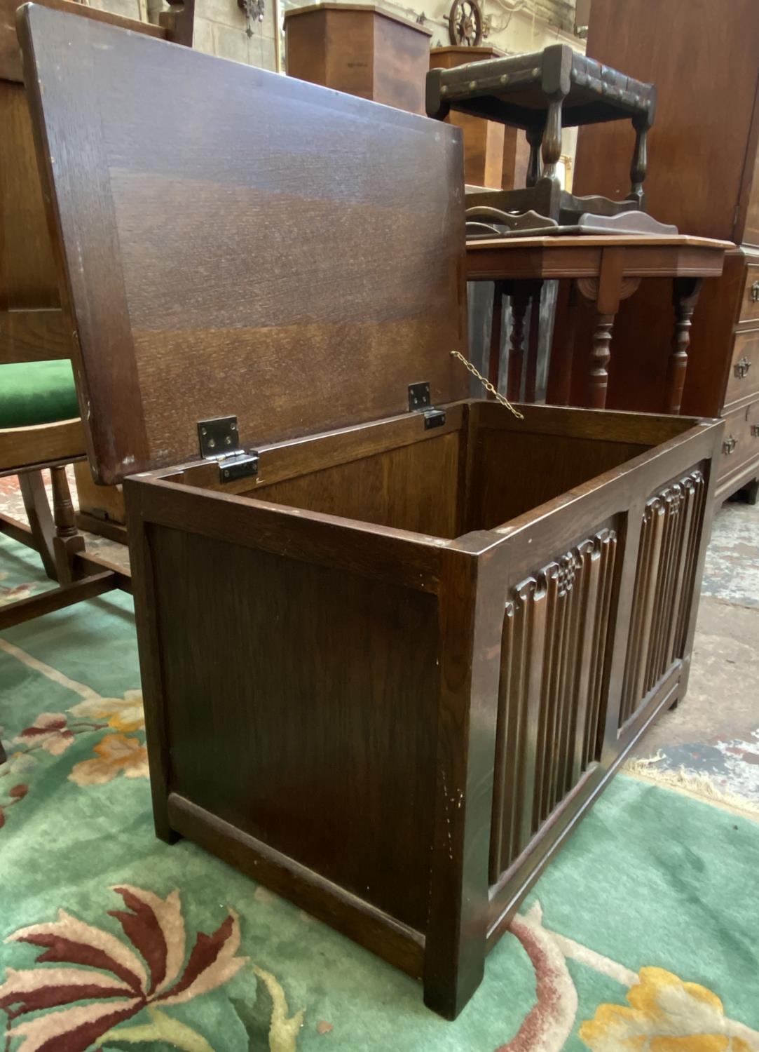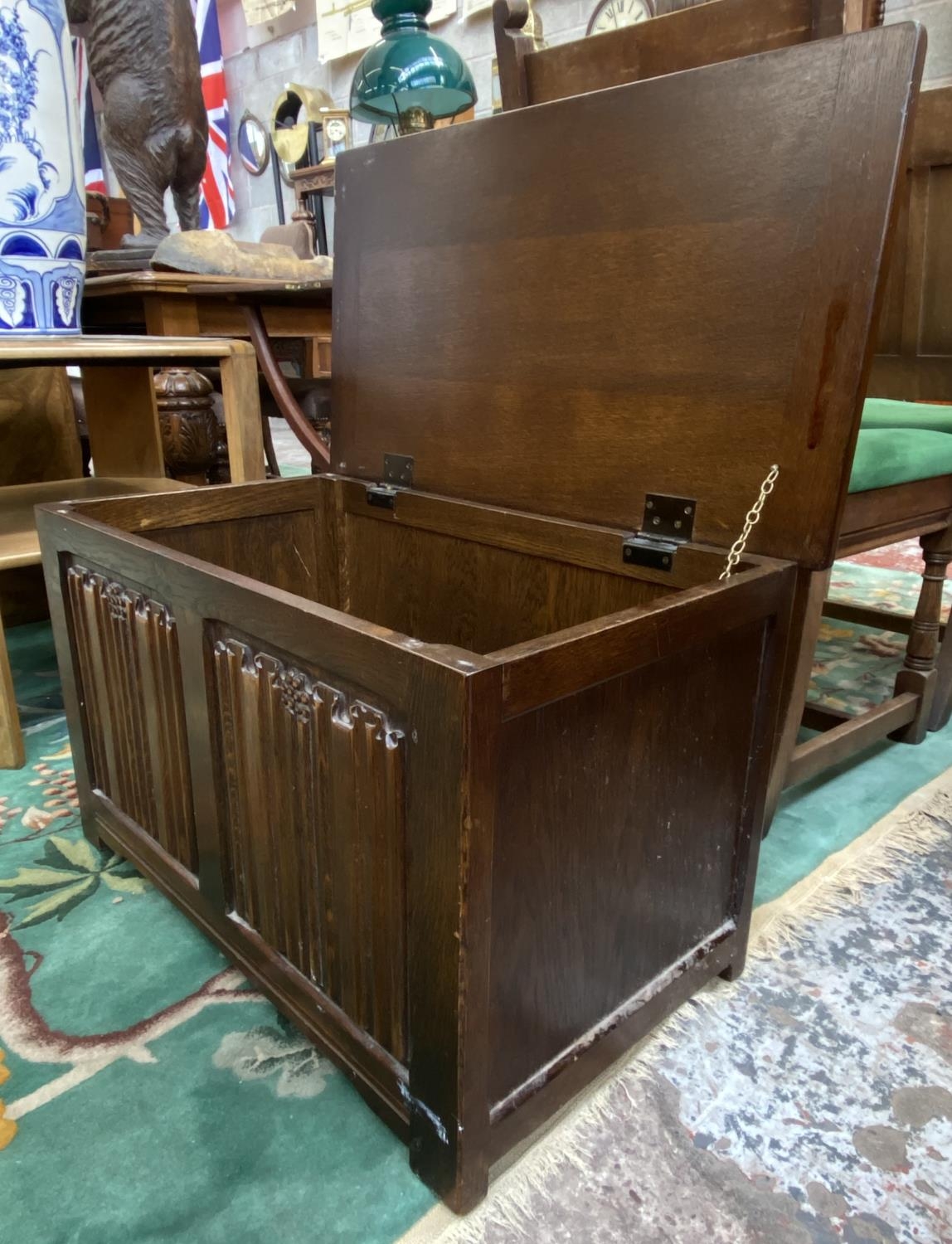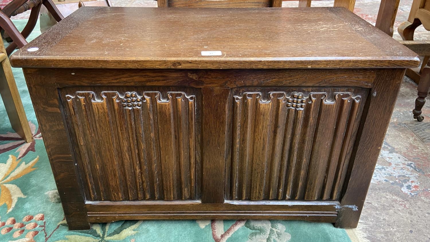 A mid 20th century carved oak linenfold blanket box - approx. 46cm high x 76cm wide x 43cm deep