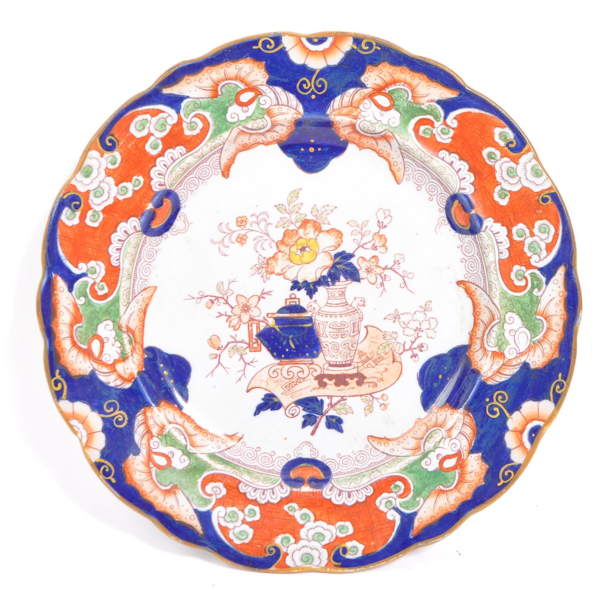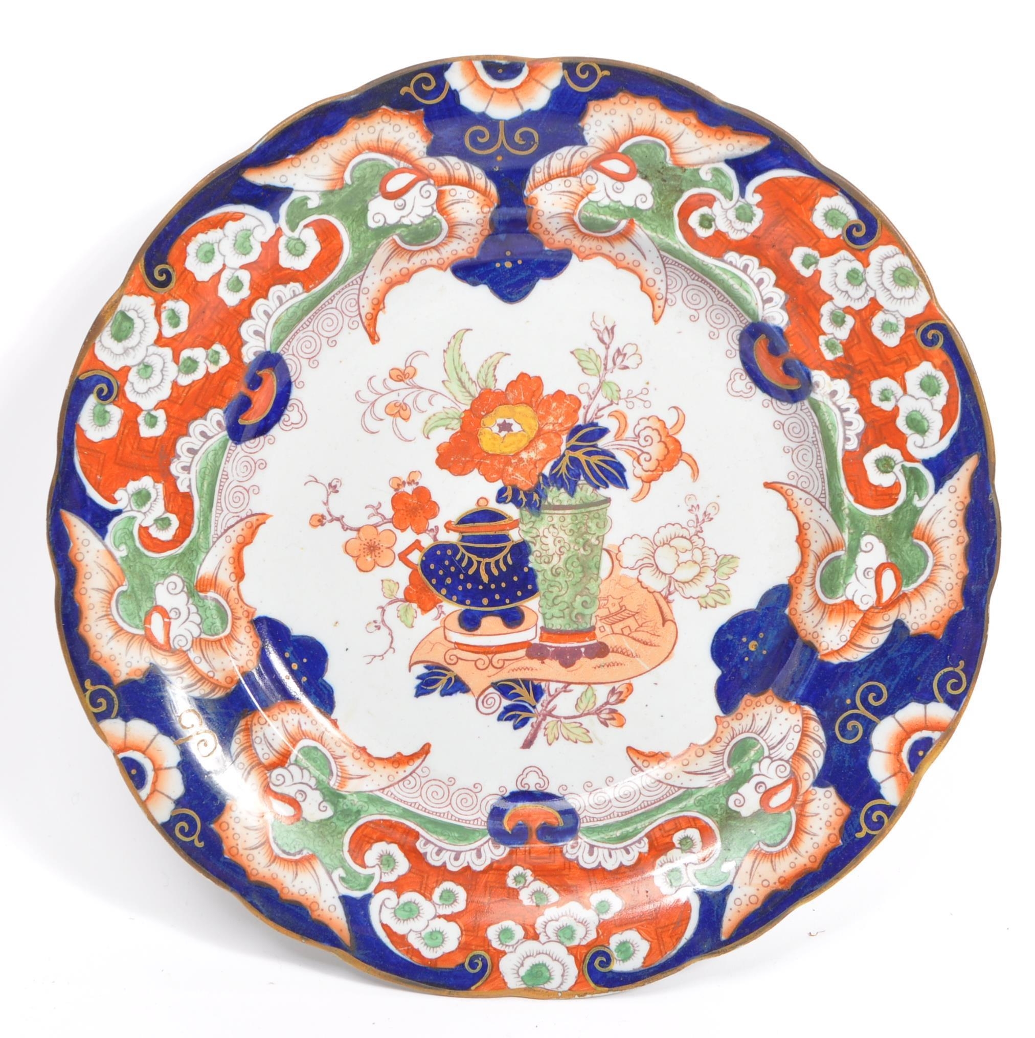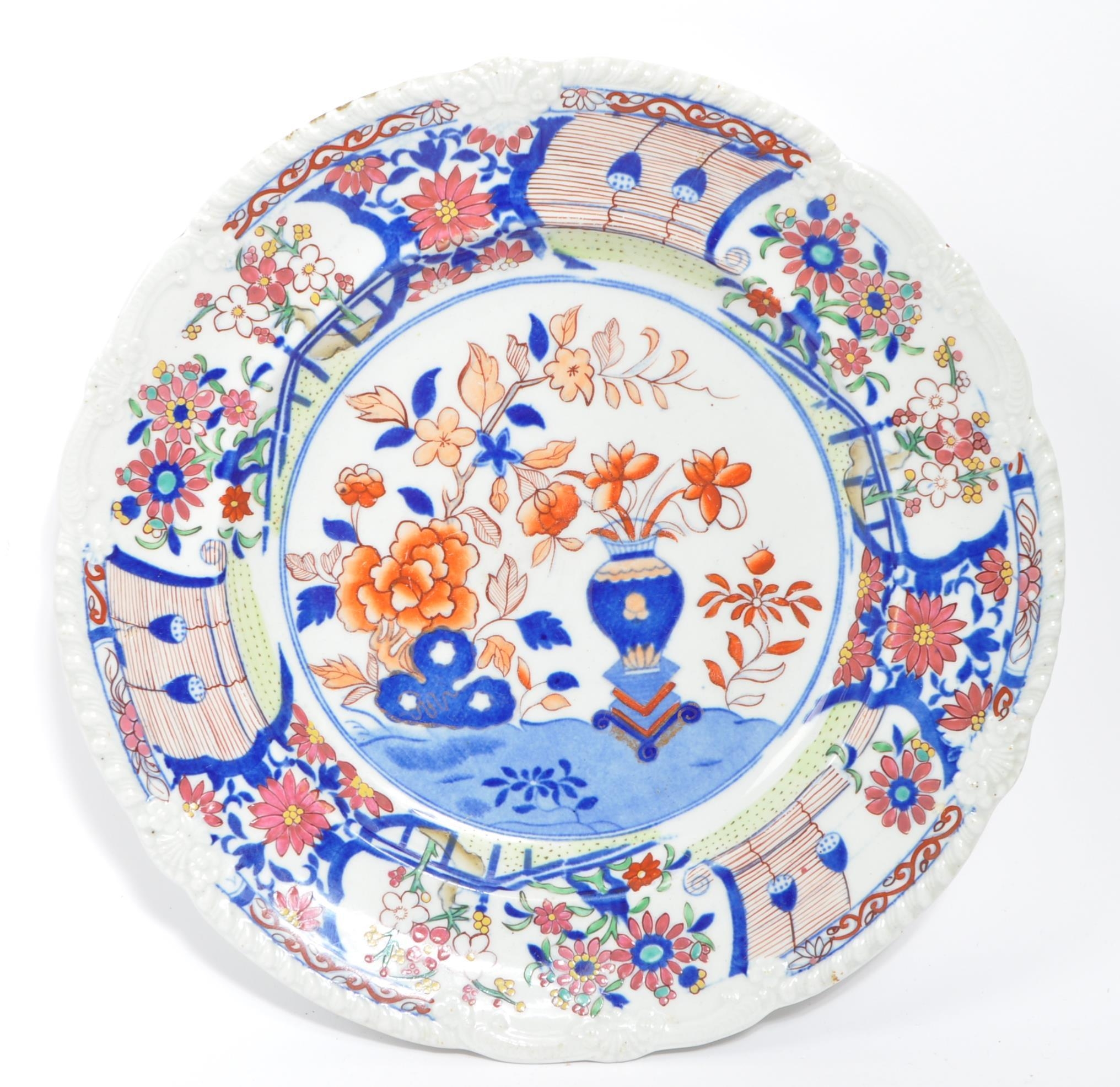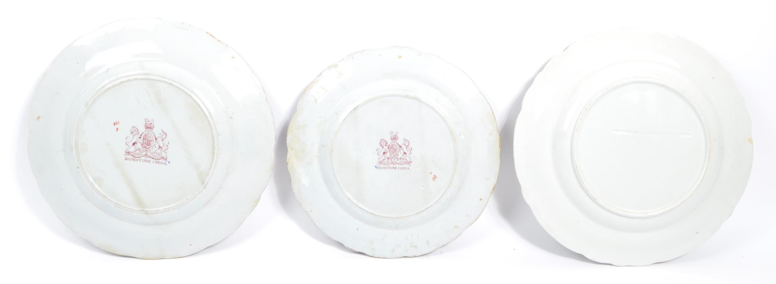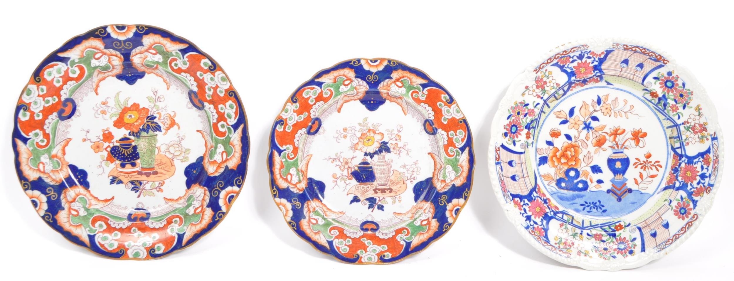 A collection of three early Ironstone plates to include two Ashworth examples and another Masons. All having chinoiserie style designs with florals and vase decoration. Measures 26cm diameter.