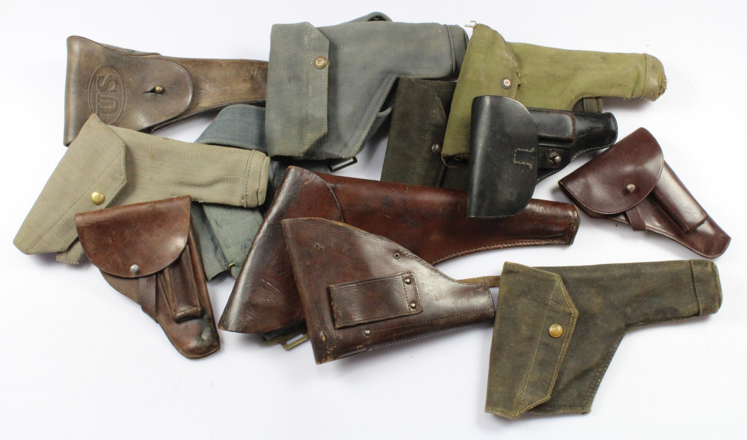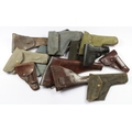 Box of Holsters to include Leather Colt 45 Holster, several Leather Holsters and 5x WW2 Webley Holsters (11 items)