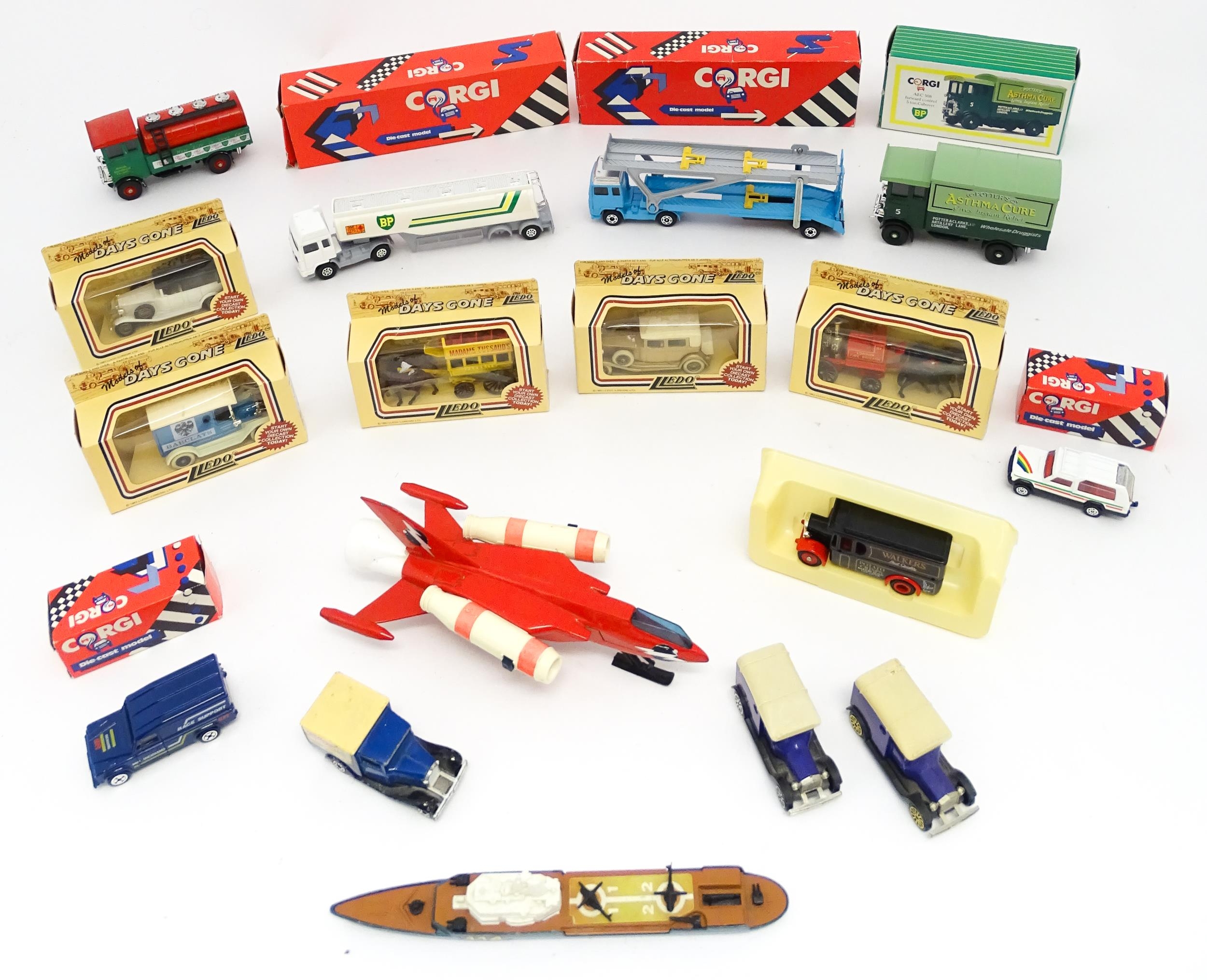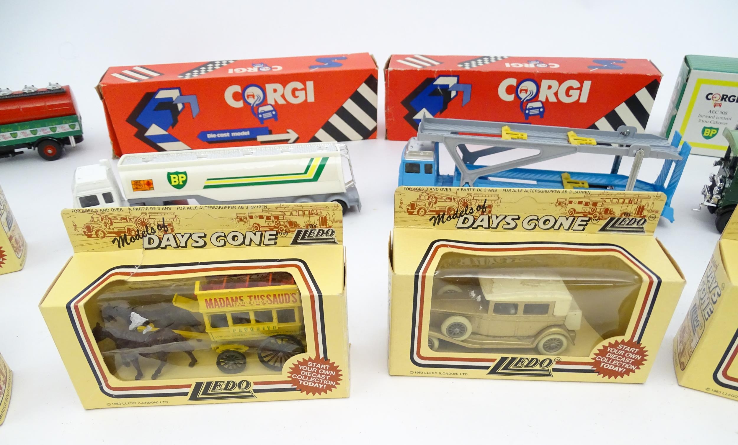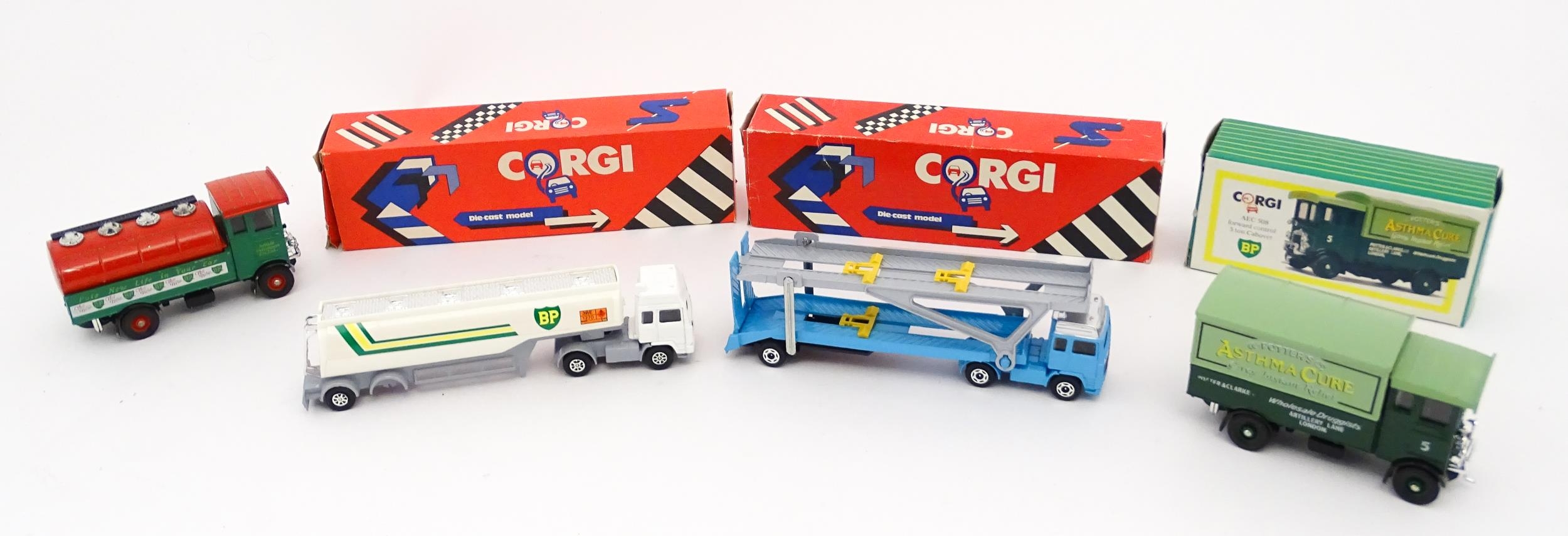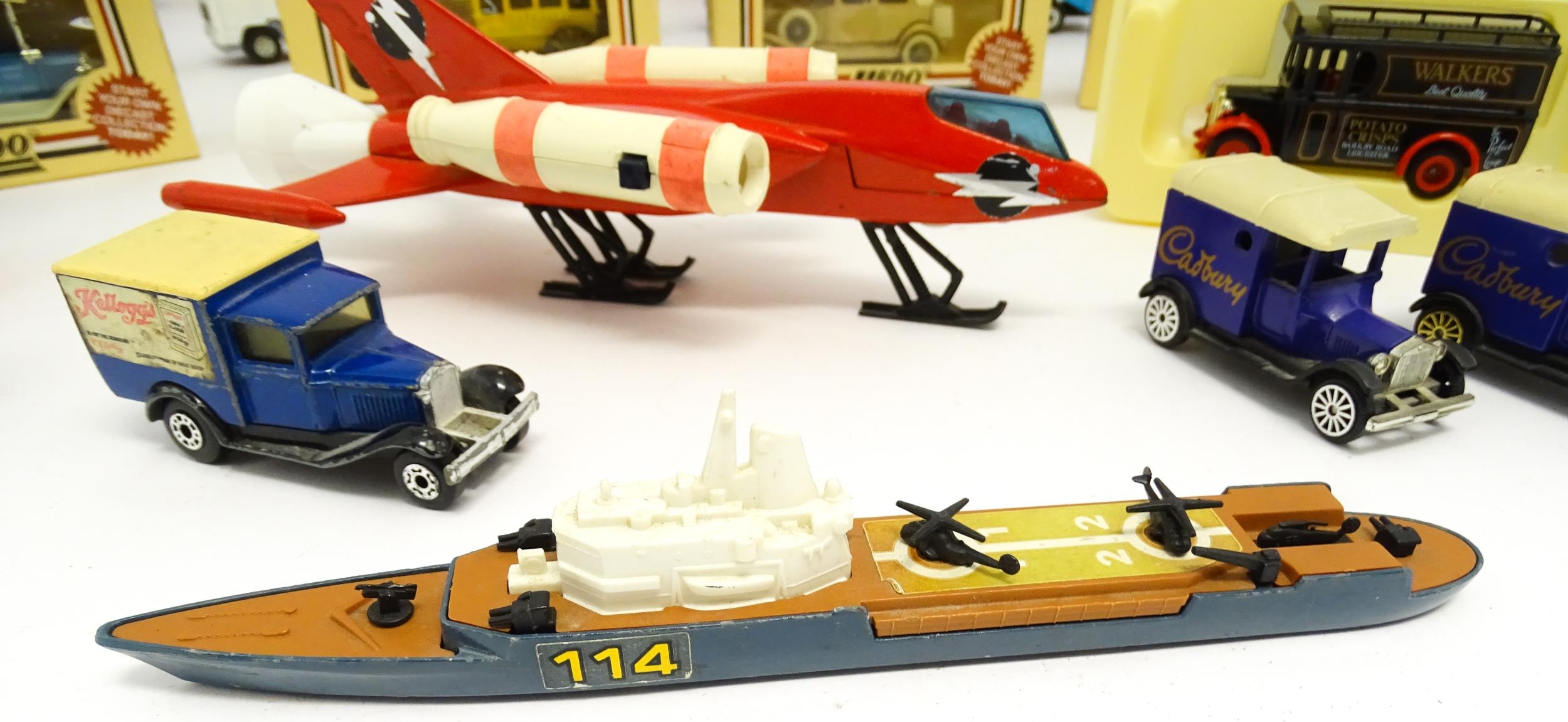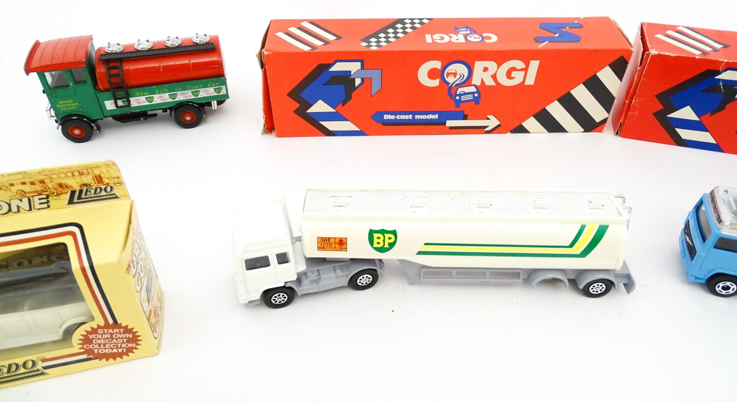 Toys: A quantity of die cast scale model vehicles etc. to include Corgi Toys Seddon Atkinson Tanker, Volvo Car Transporter, Matra Rancho, Land Rover, AEC 508 Cabover, Matchbox Sea Kings Helicopter Carrier K307, various Lledo cars, etc.