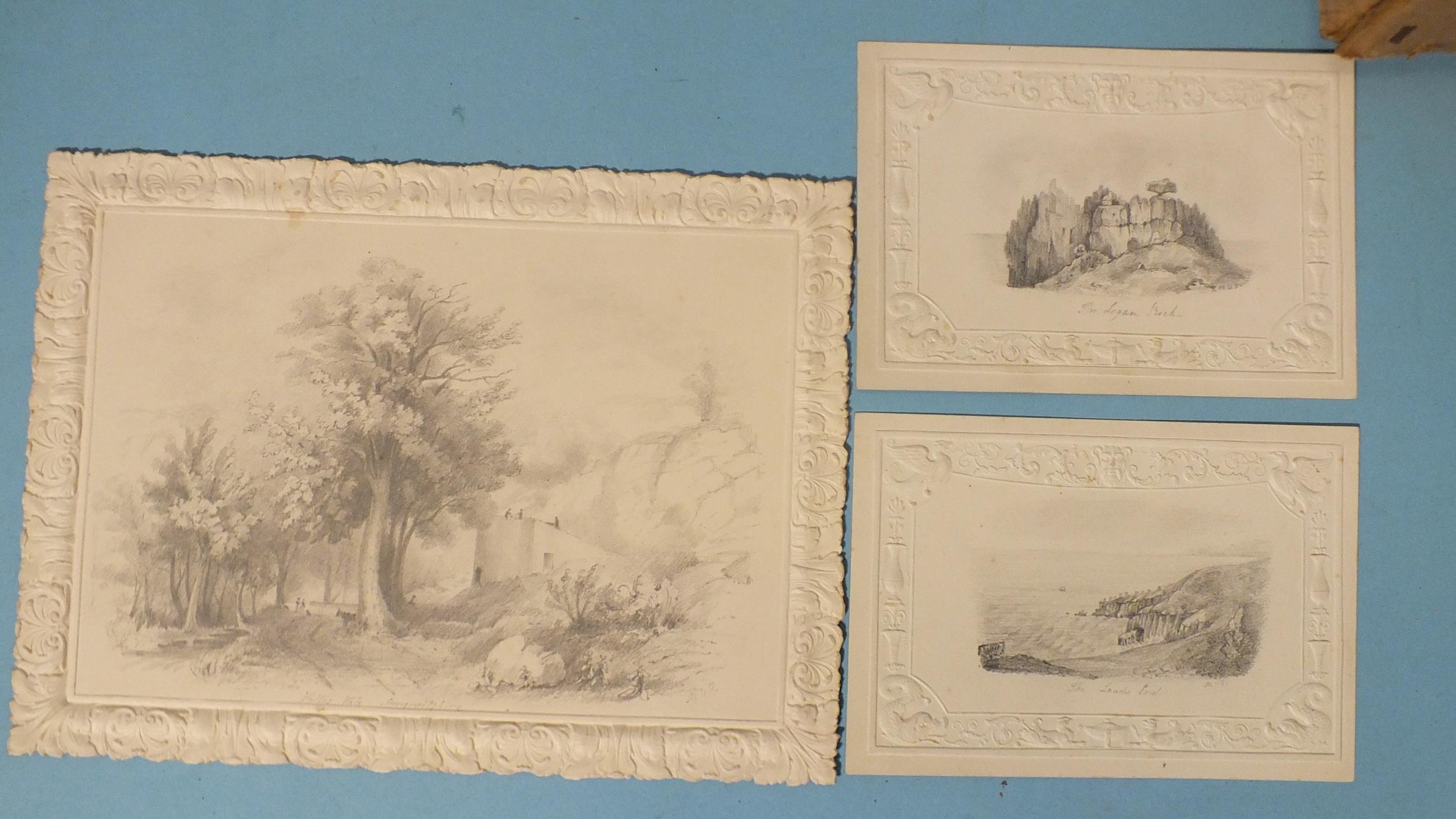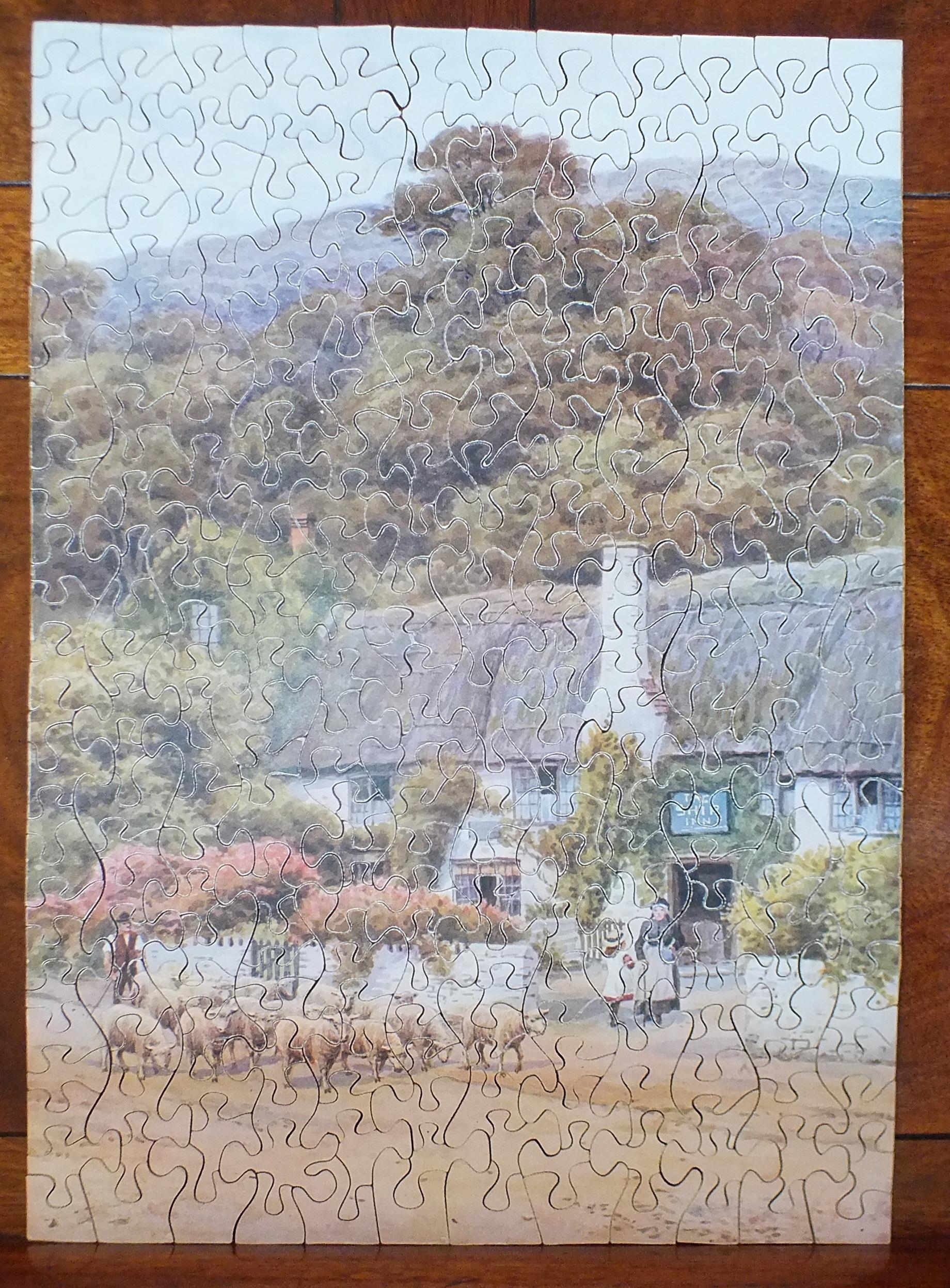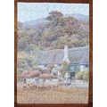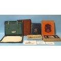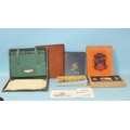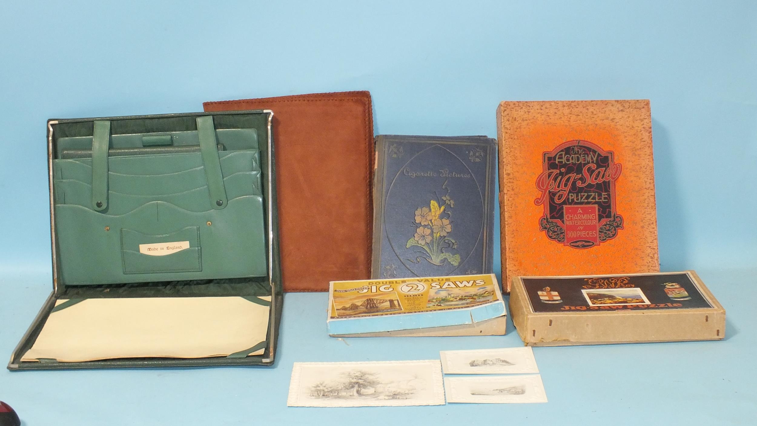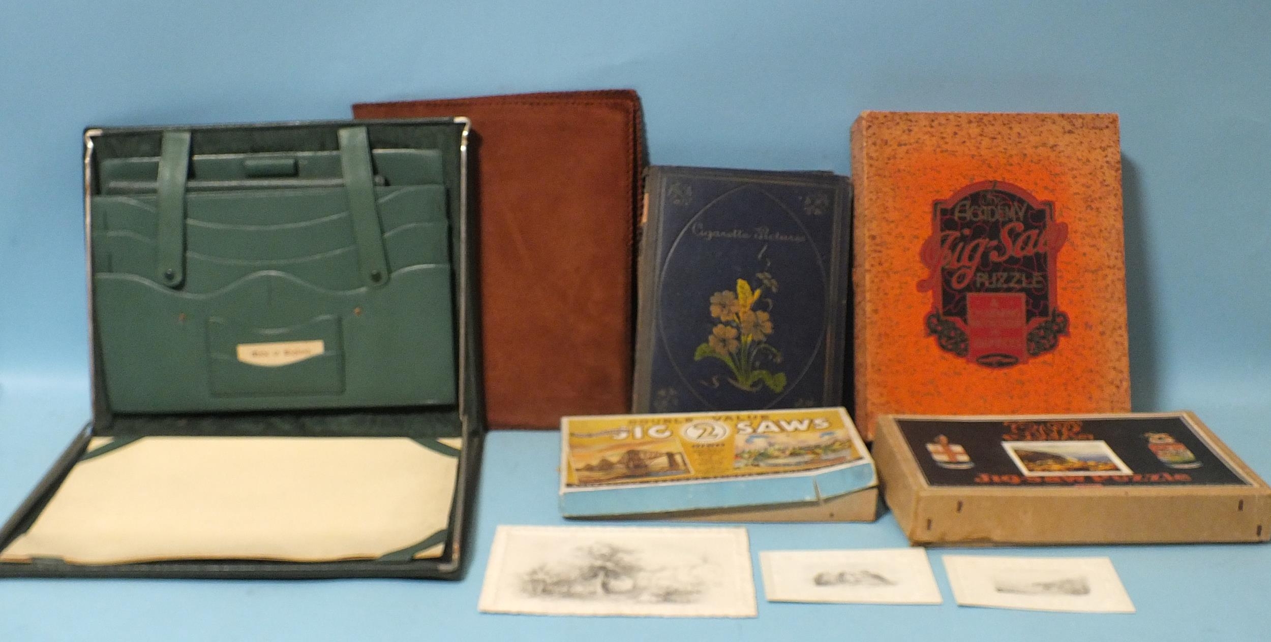 Two wooden jigsaws, (one complete), an album of cigarette cards, two leather stationery folders and other items.