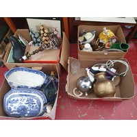 A box full of brassware to include a small marble lion and a wooden framed portrait