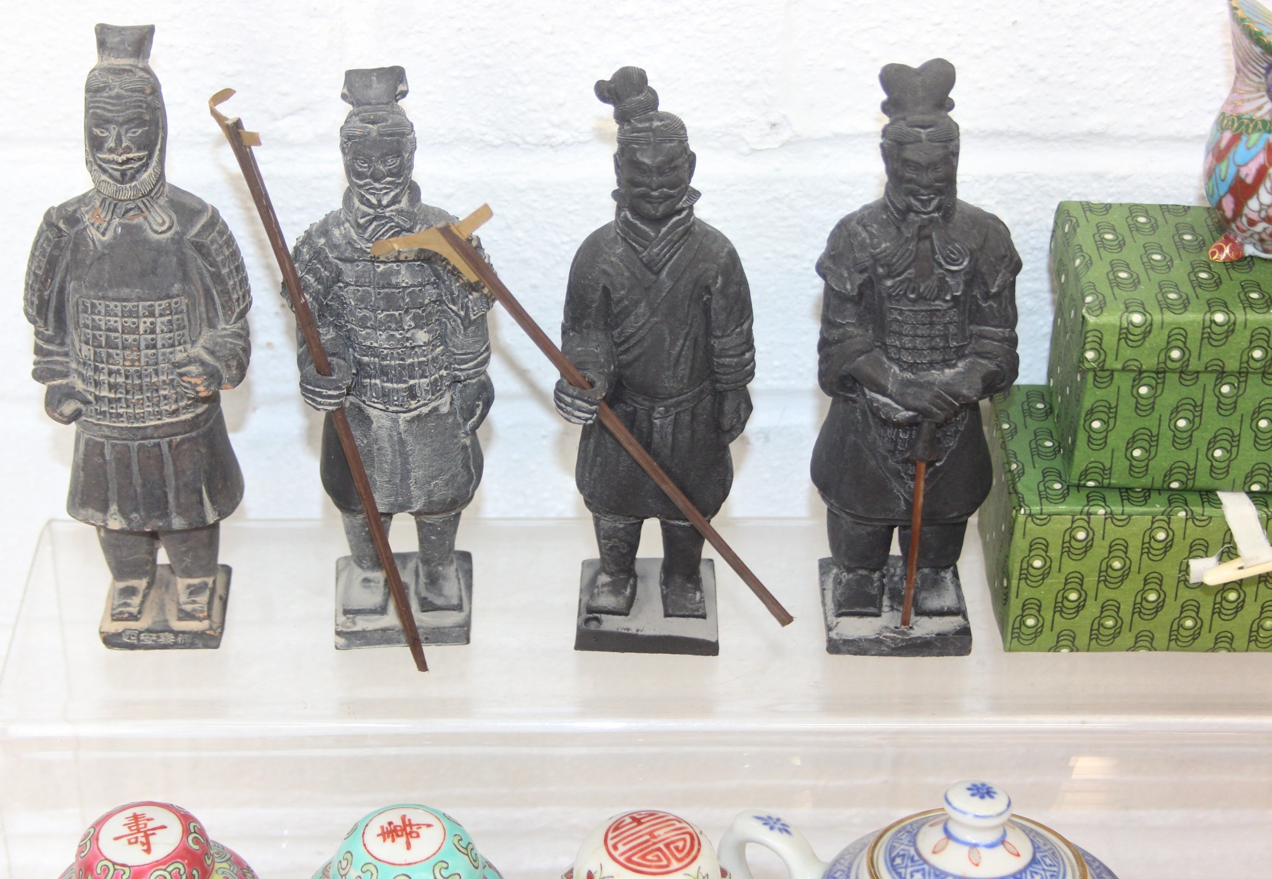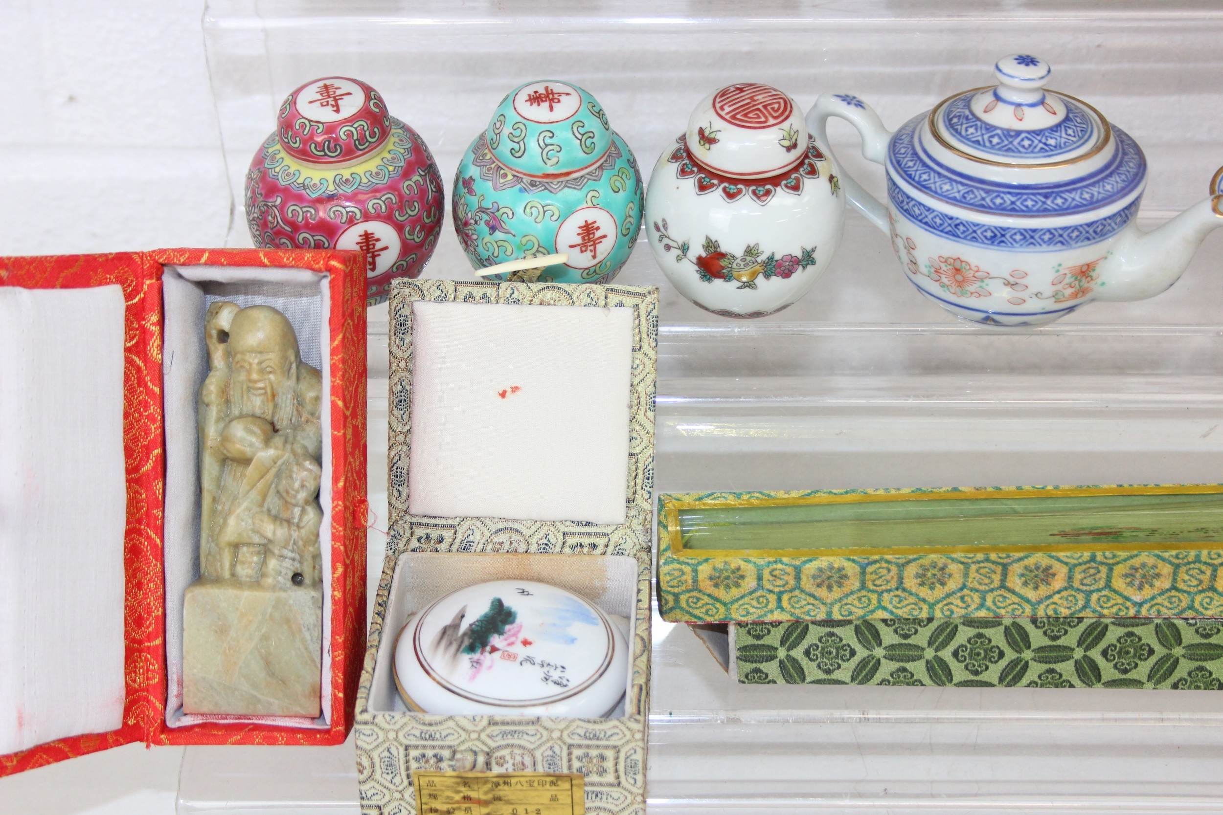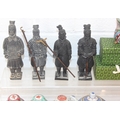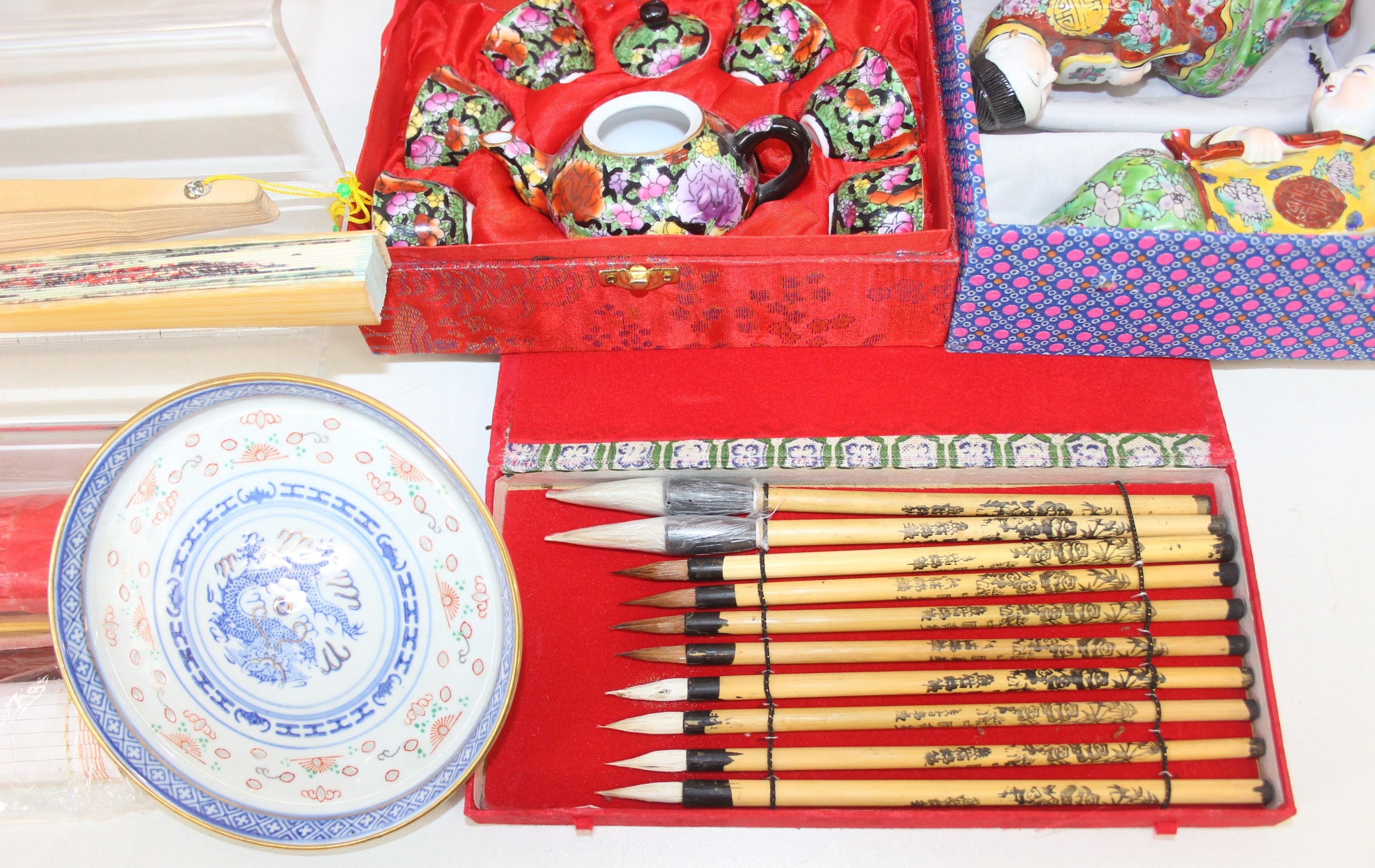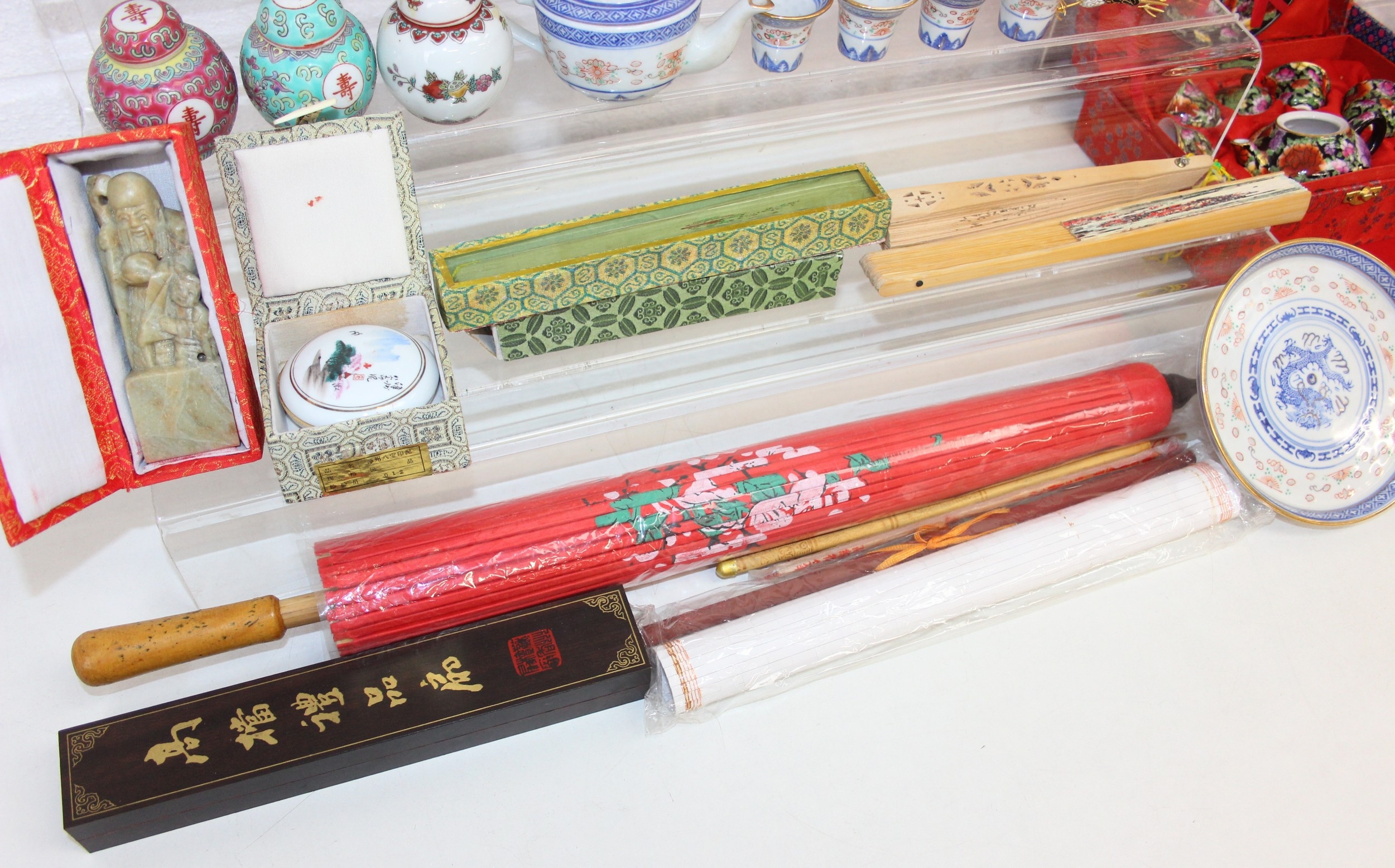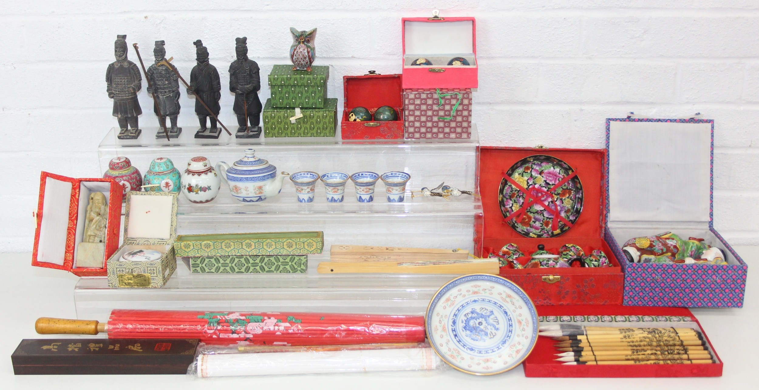 Qty of Oriental style items/souvenirs to incl terracotta figurines, hand fans, teapots, umbrella, boxed miniature tea set, carved soapstone figure, ink dish, etc