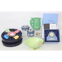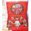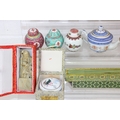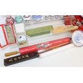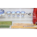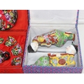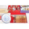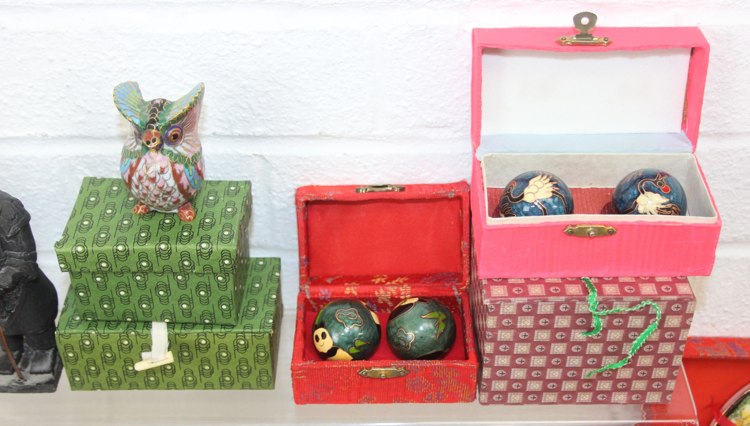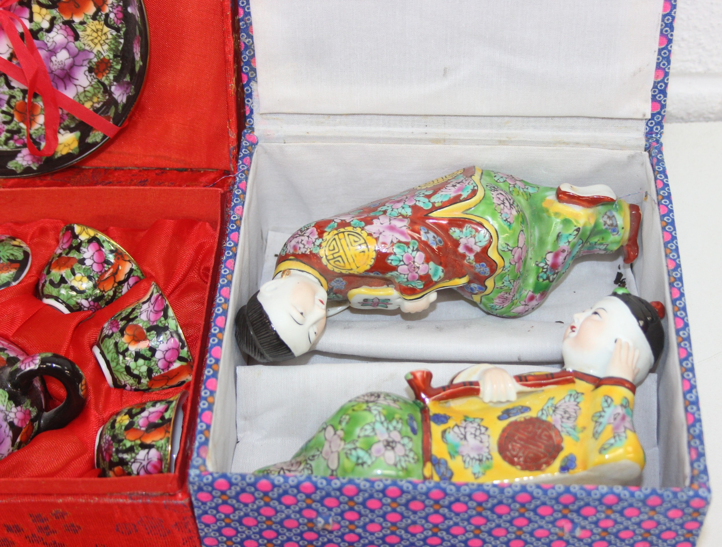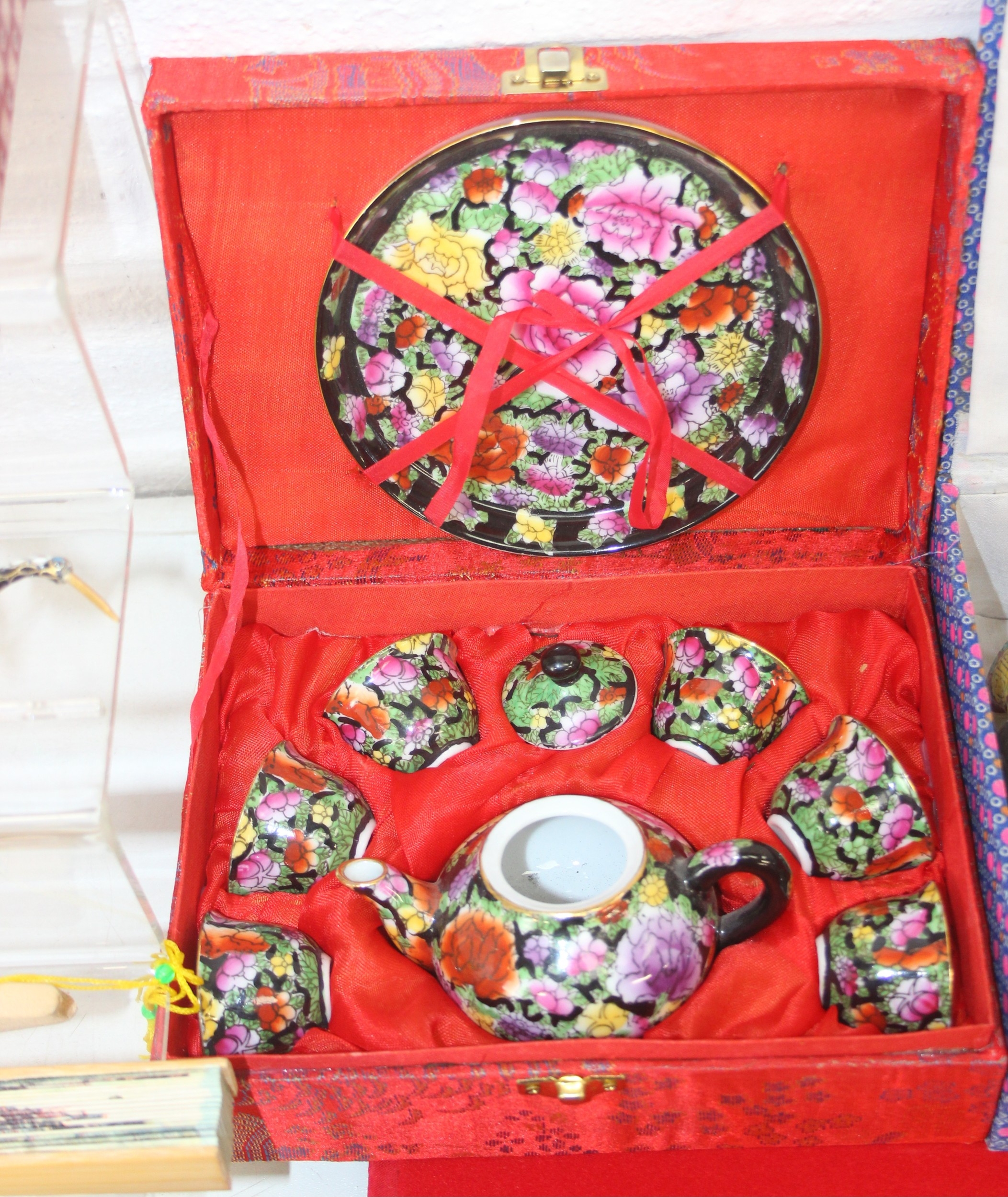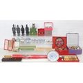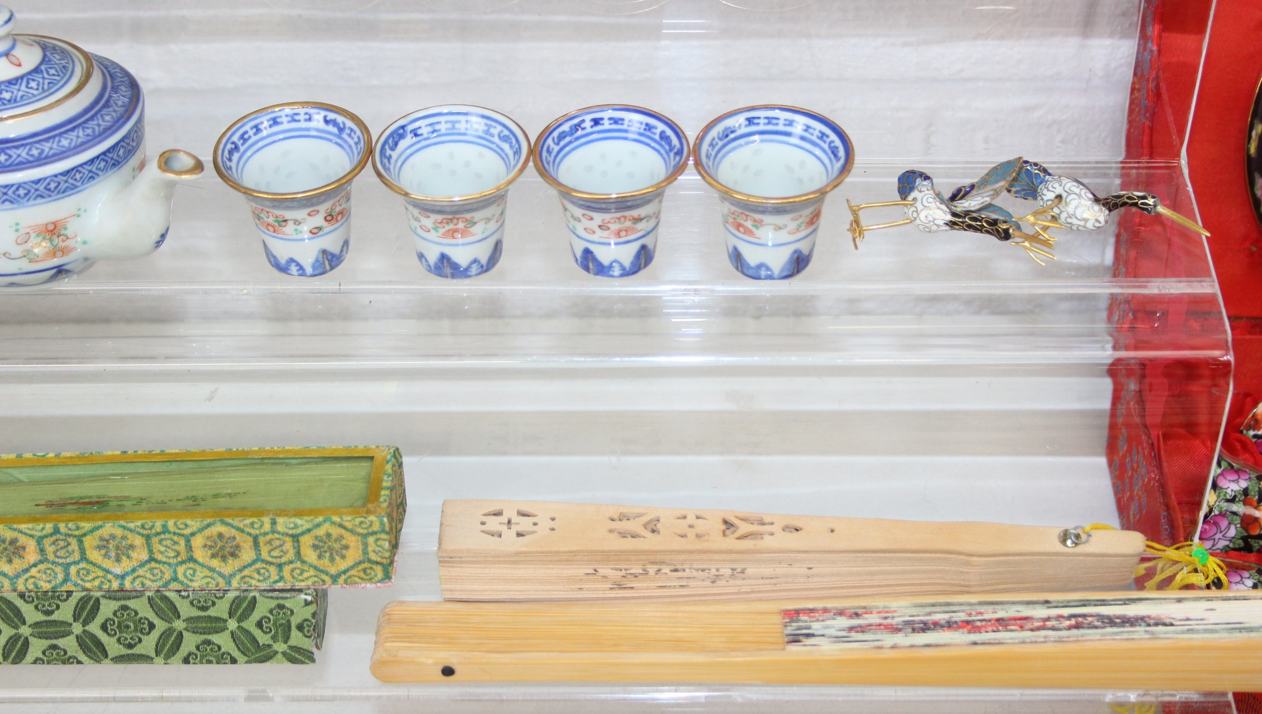 Qty of Oriental style items/souvenirs to incl terracotta figurines, hand fans, teapots, umbrella, boxed miniature tea set, carved soapstone figure, ink dish, etc