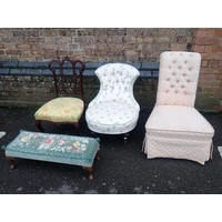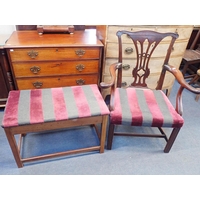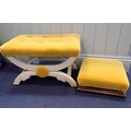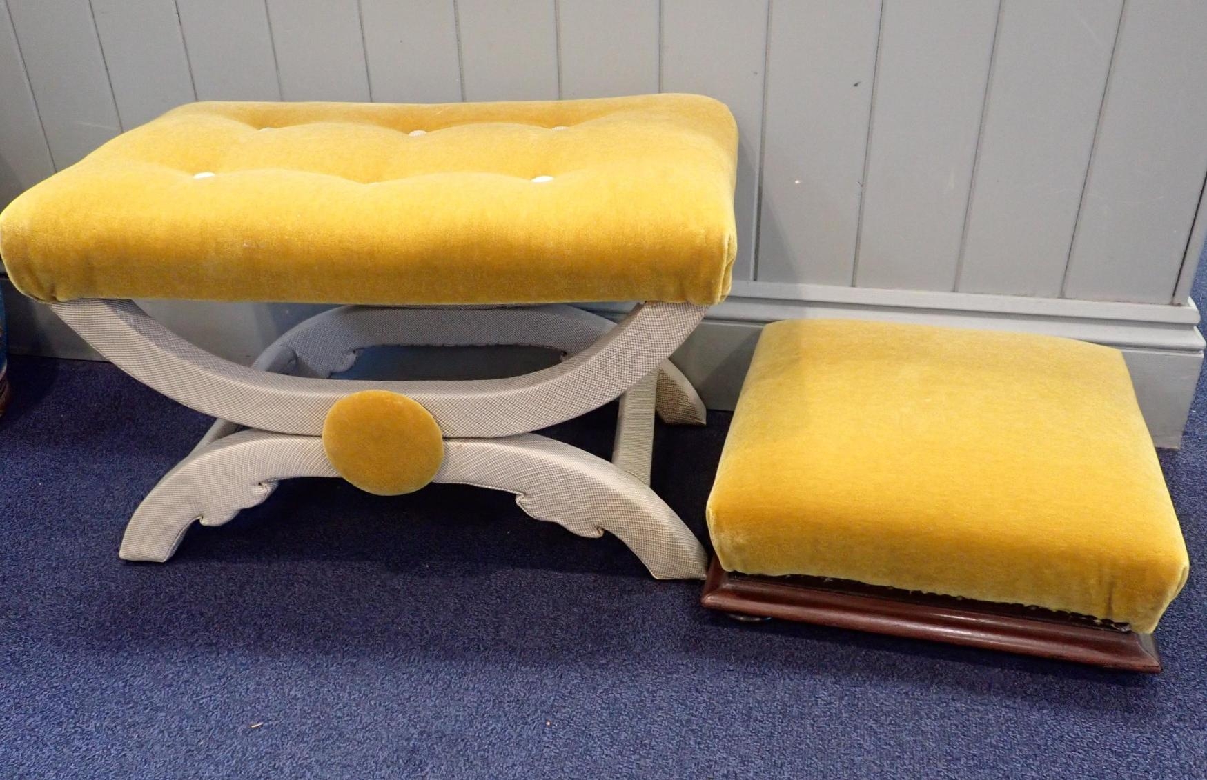 AN UPHOLSTERED 'X' FRAME STOOLwith gold plush seat, and the curved legs covered in fabric, 63cm wide, and a 19th century rosewood framed footstool with similar upholstery (2)