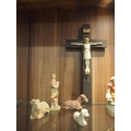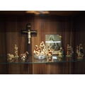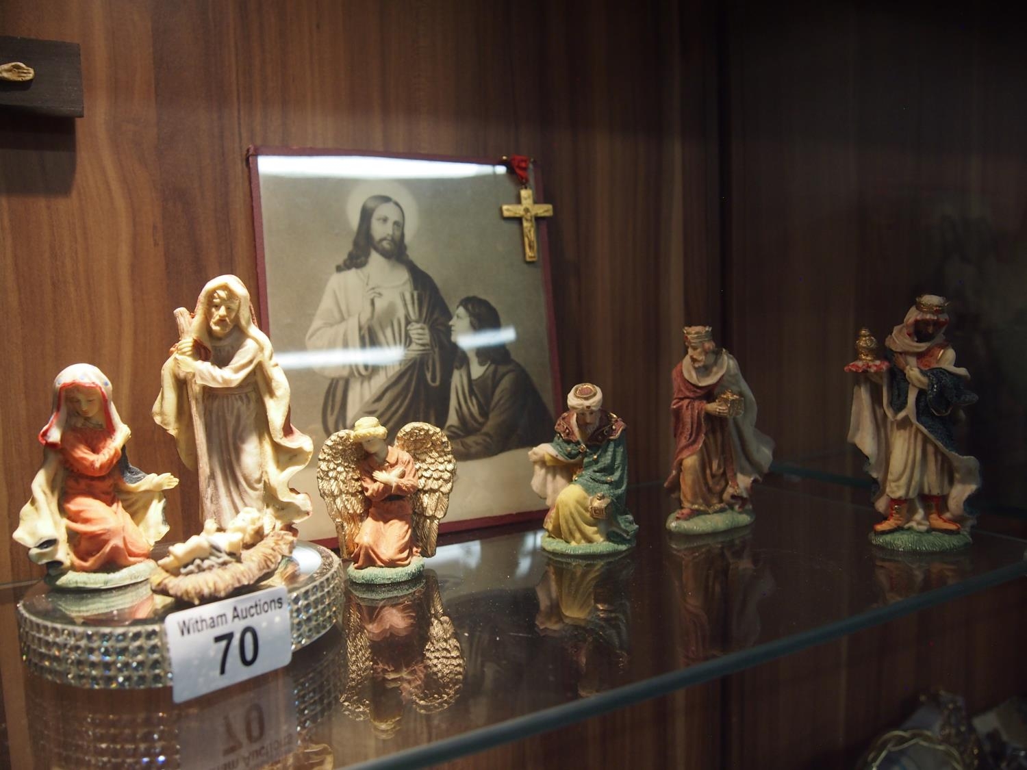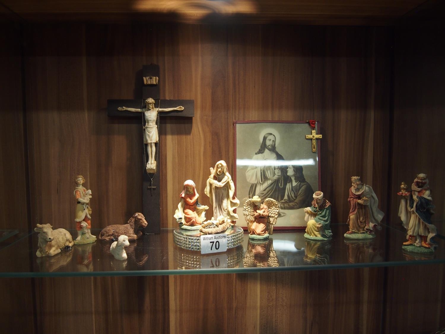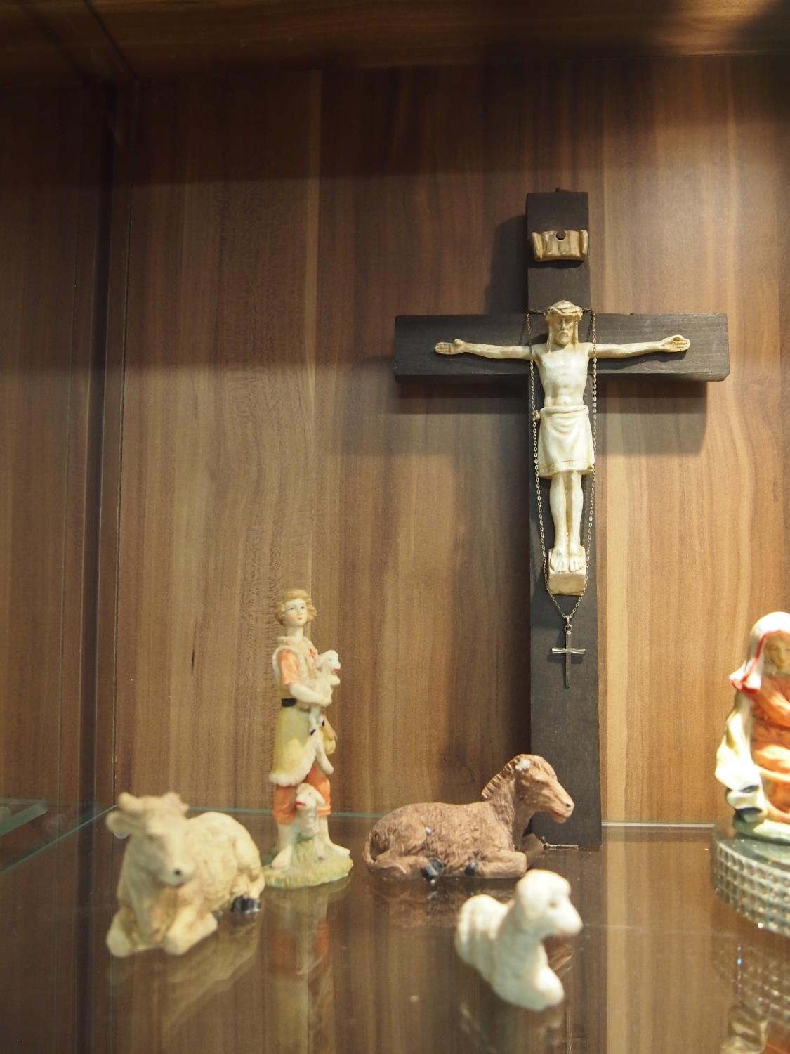 Ecclesiastical themed items including a wooden crucifix approx. length 30cm, vintage print of Jesus Christ 19x15cm, a silver cross pedant stamped silver with chain and pocket crucifix on pin stamped thy kingdom come to reverse and baby Jesus 11 piece nativity set various height range max height 10cm