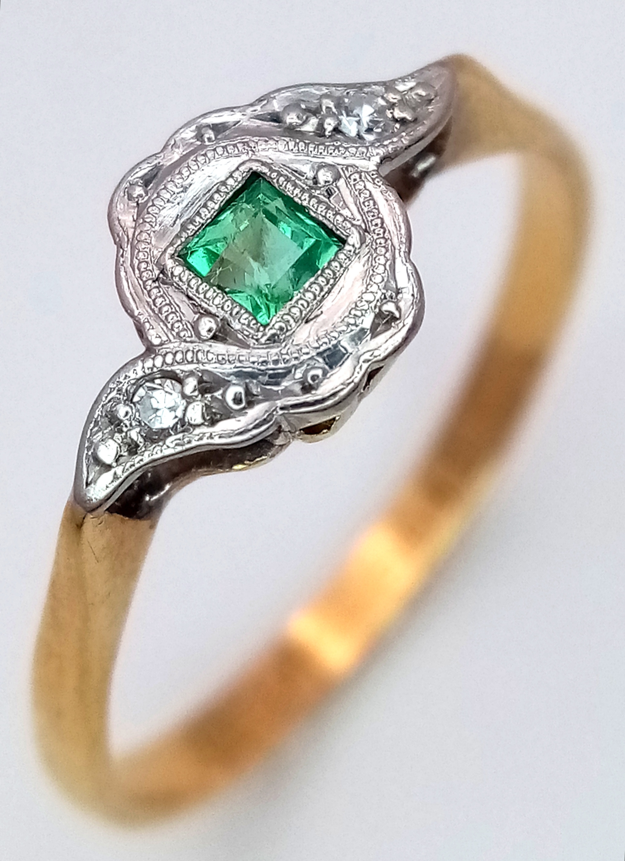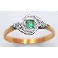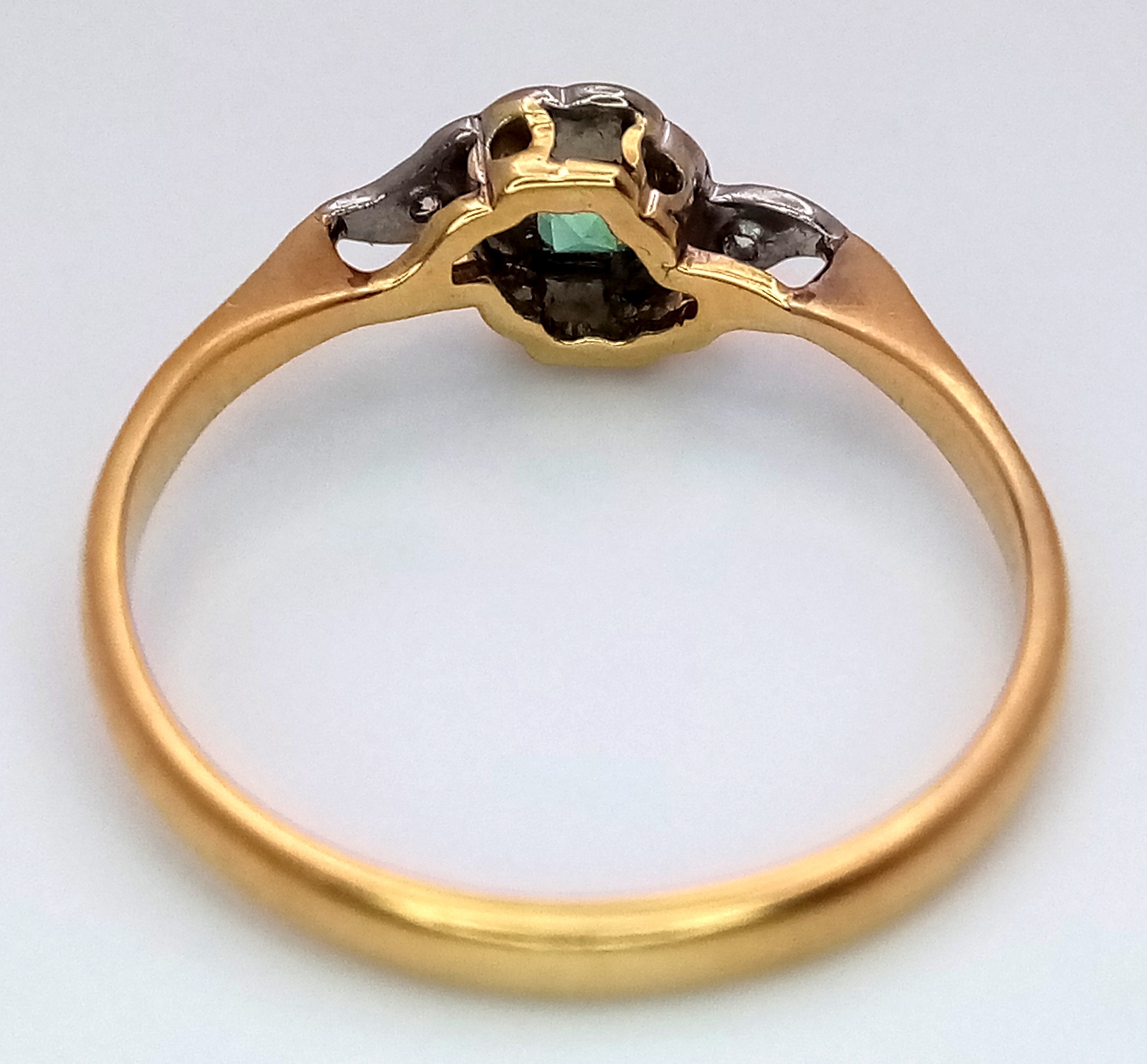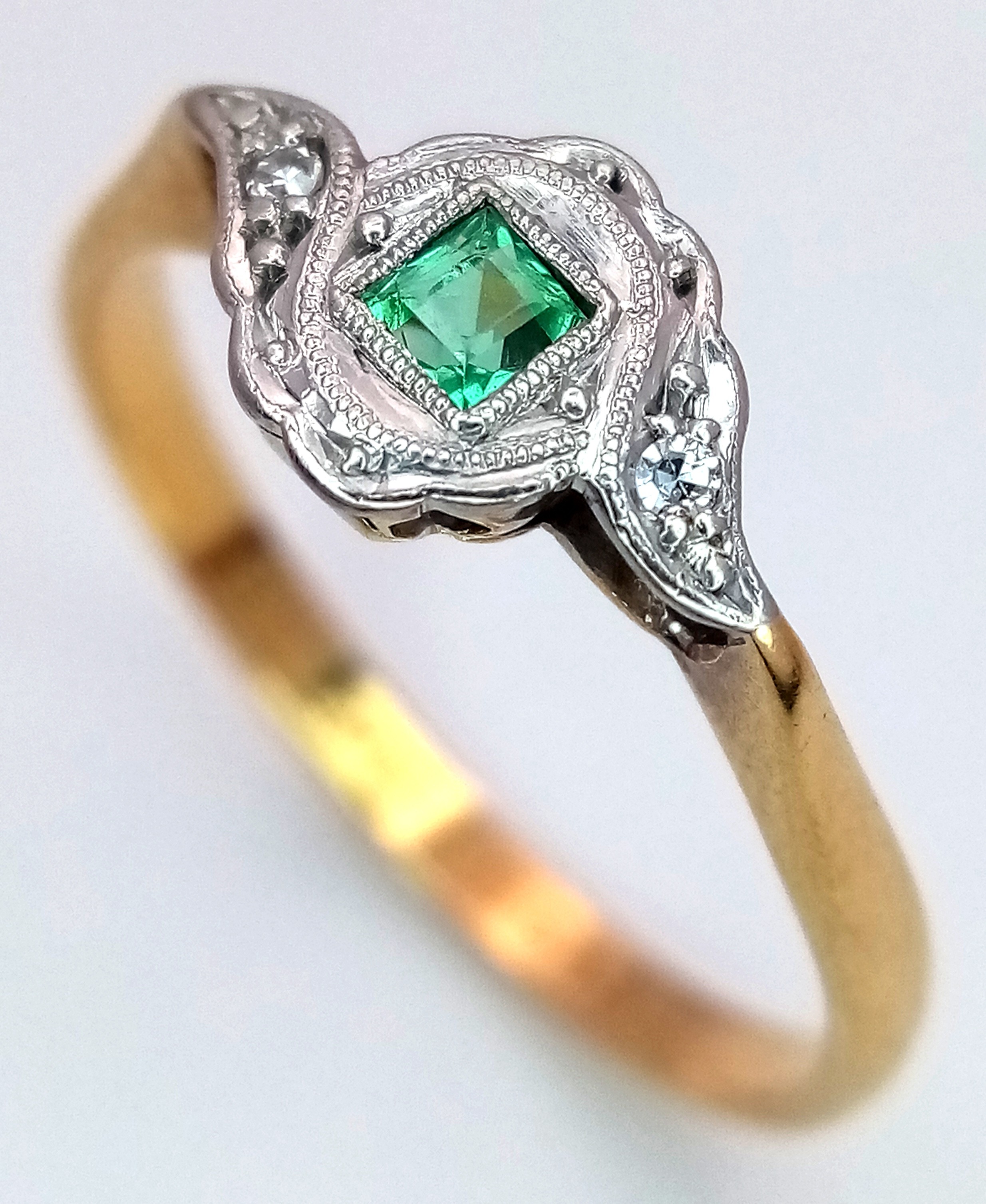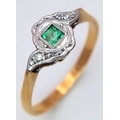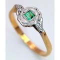 AN 18K YELLOW GOLD VINTAGE DIAMOND & EMERALD RING 2.3G TOTAL WEIGHT, SIZE Q. REF: SC 9090
