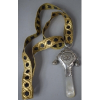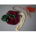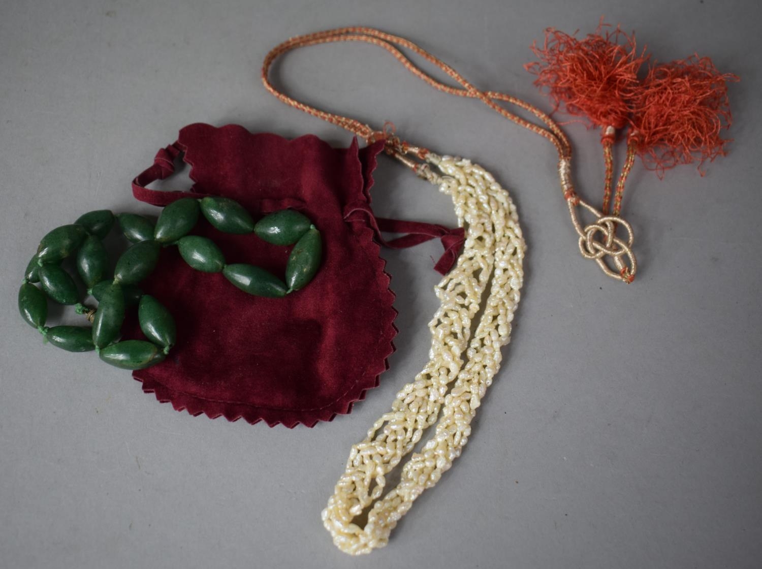 A String of Jade Ovoid Beads with Barrel Clasp together with a String of Oriental Pearls on Embroidered Silk Tassel