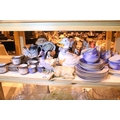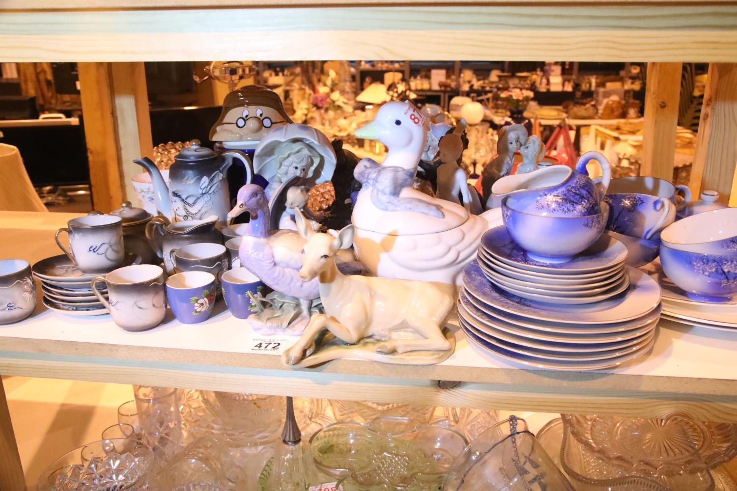 Shelf of mixed ceramics including Oriental tea set, figurines etc. Not available for in-house P&P