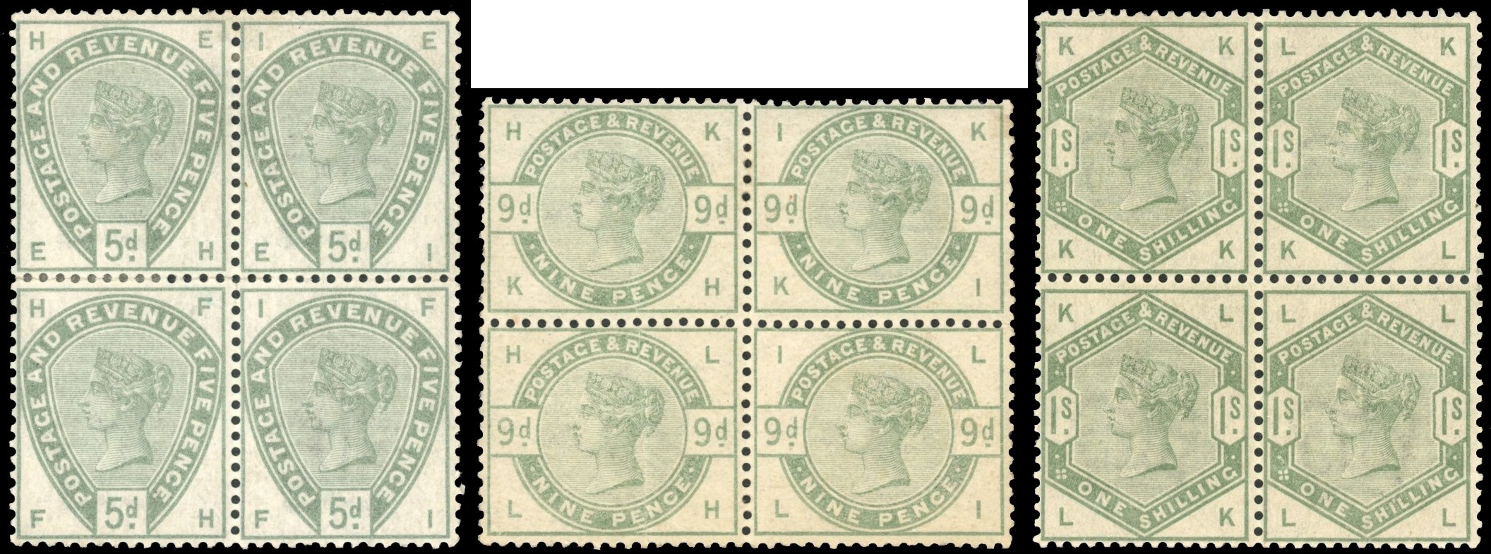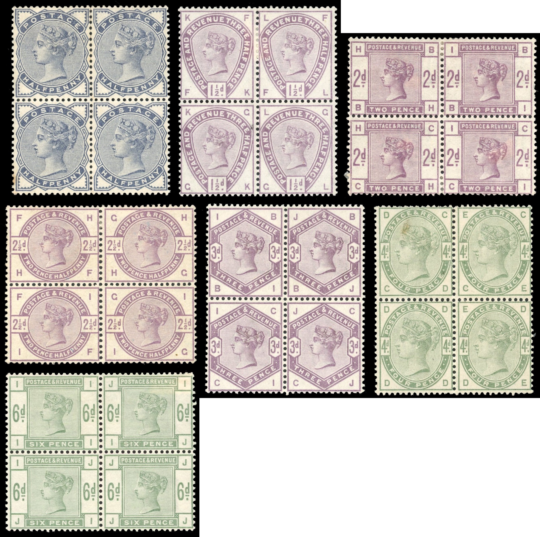 Great Britain 1883-84 Lilac and Green set in blocks four mint