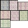 1883-84 Lilac and green set of ten values in blacks of four, the ½d with one stamp creased and one with tone spot, 1½d hinged between top pair, 2d each stamp hinged, 2½d and 3d hinged at top, 4d  centrally hinged and at top, top left stamp small tone, 5d hinged at top and reinforced with hinge between two, 6d hinged between top two and one also small piece selvedge, 9d hinged top and bottom with vertical crease through two stamps and 1s hinged at top only, apart from the 4d the appearance is very fine, a rare set in blocks of