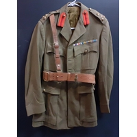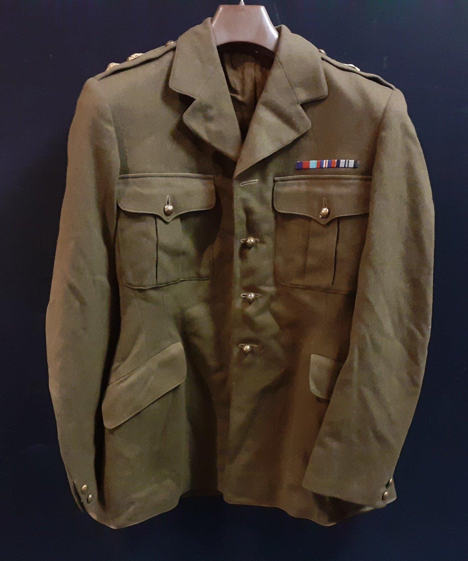 WWII Era army battle dress tunic. With 6L (6th Lancers) insignia and round regimental buttons. With WWII Medal bar which includes India General Service ribbon. Chest 96cm approx