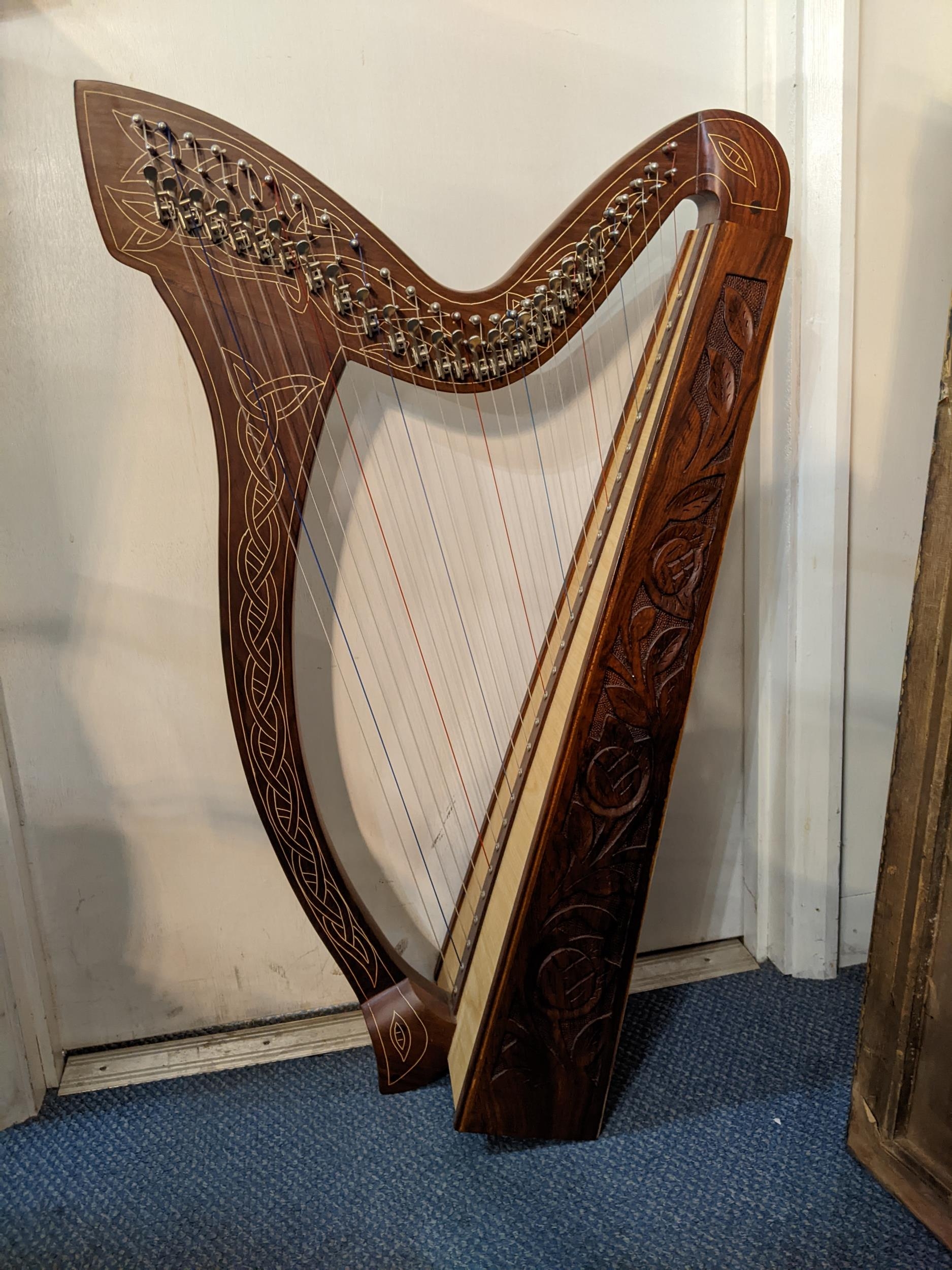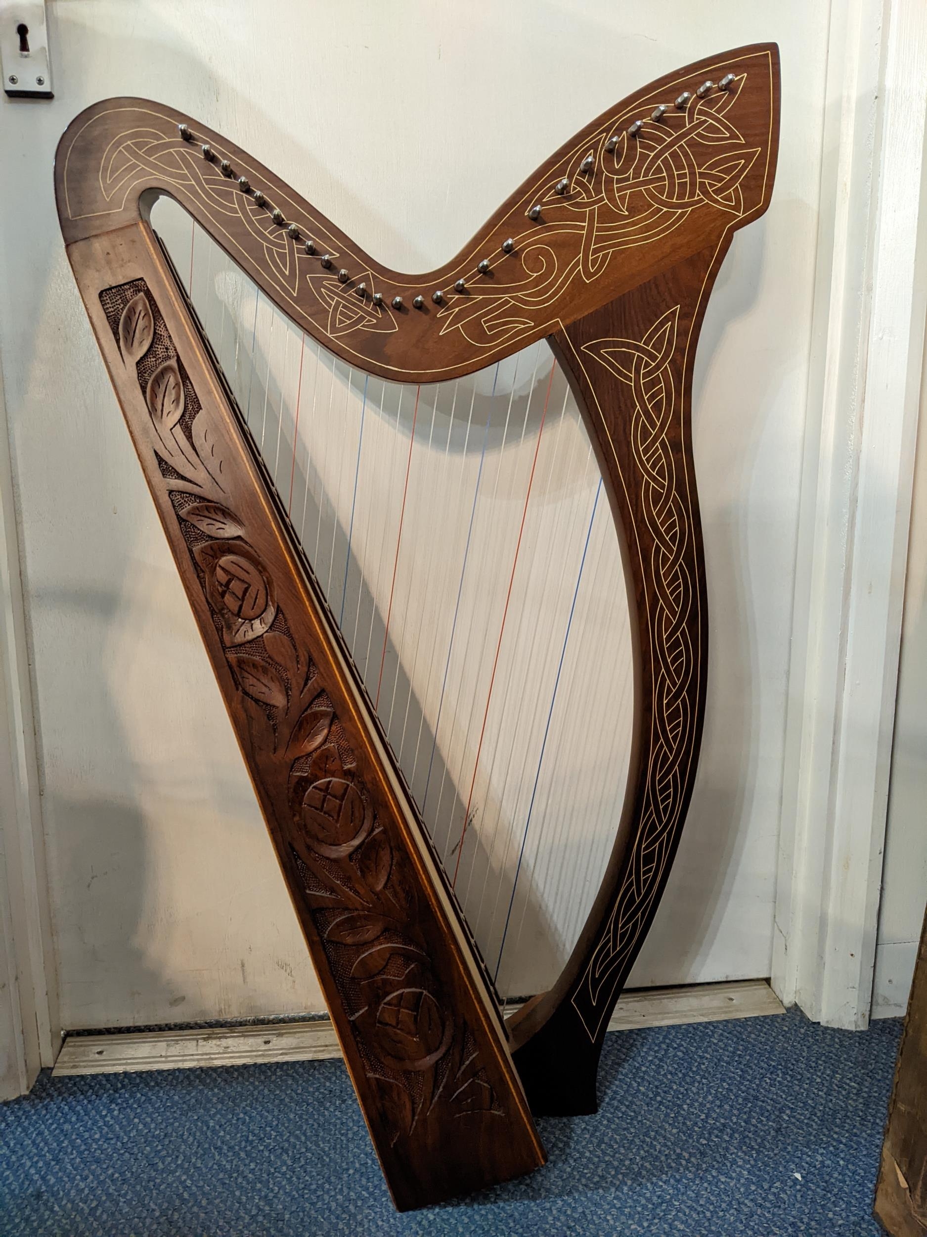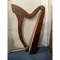 A wooden knee harp with twenty seven strings and carved ornament in a soft carrying case, 89cm high
