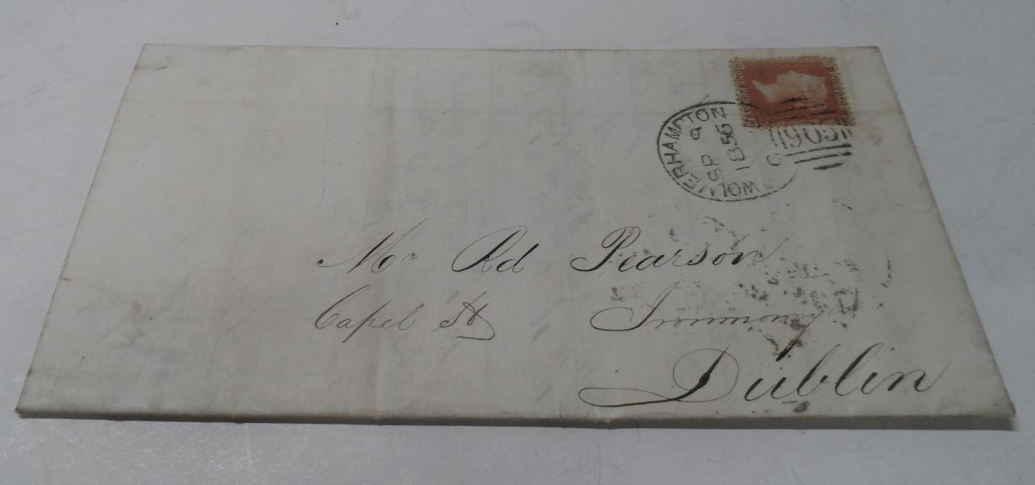 1856 receipt letter with 1d red stamp and fine clear cancelation Wolverhampton to Dublin