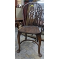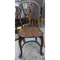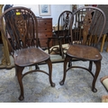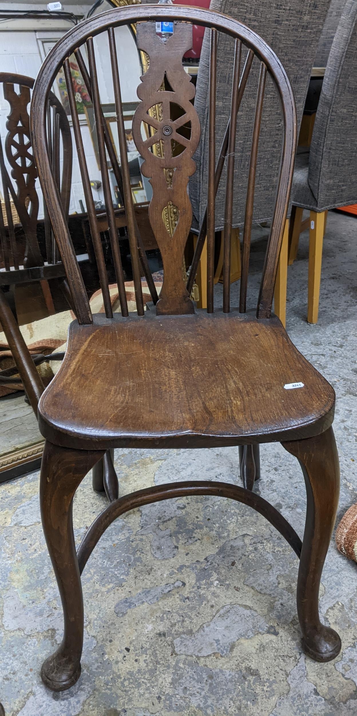 Two 20th century elm seated Windsor wheel back chairs with crinoline elliptical and stretchers, cabriole front legs and pad feet