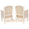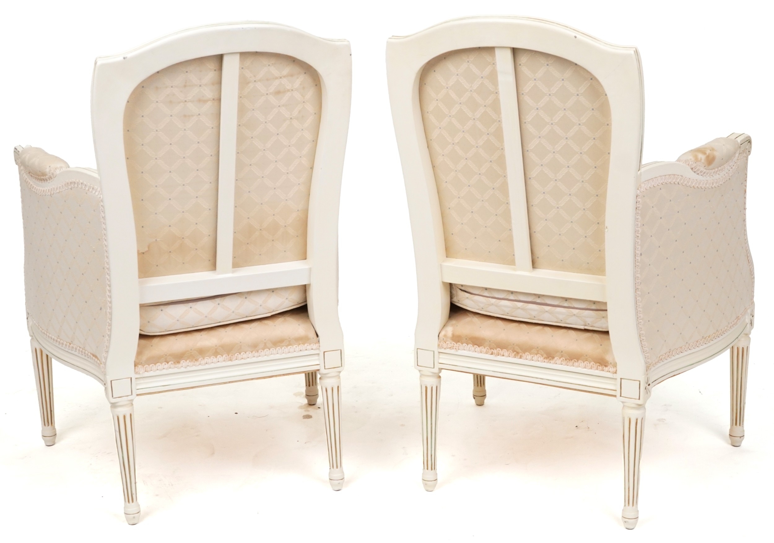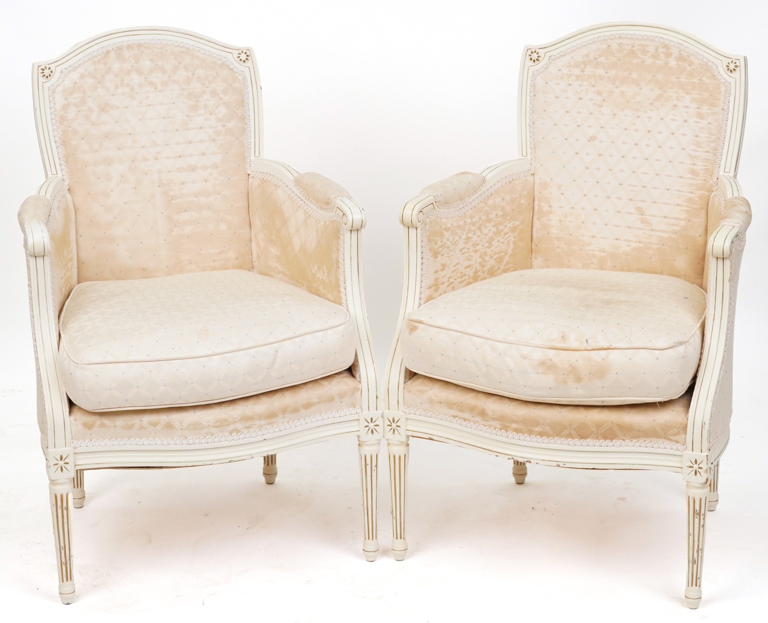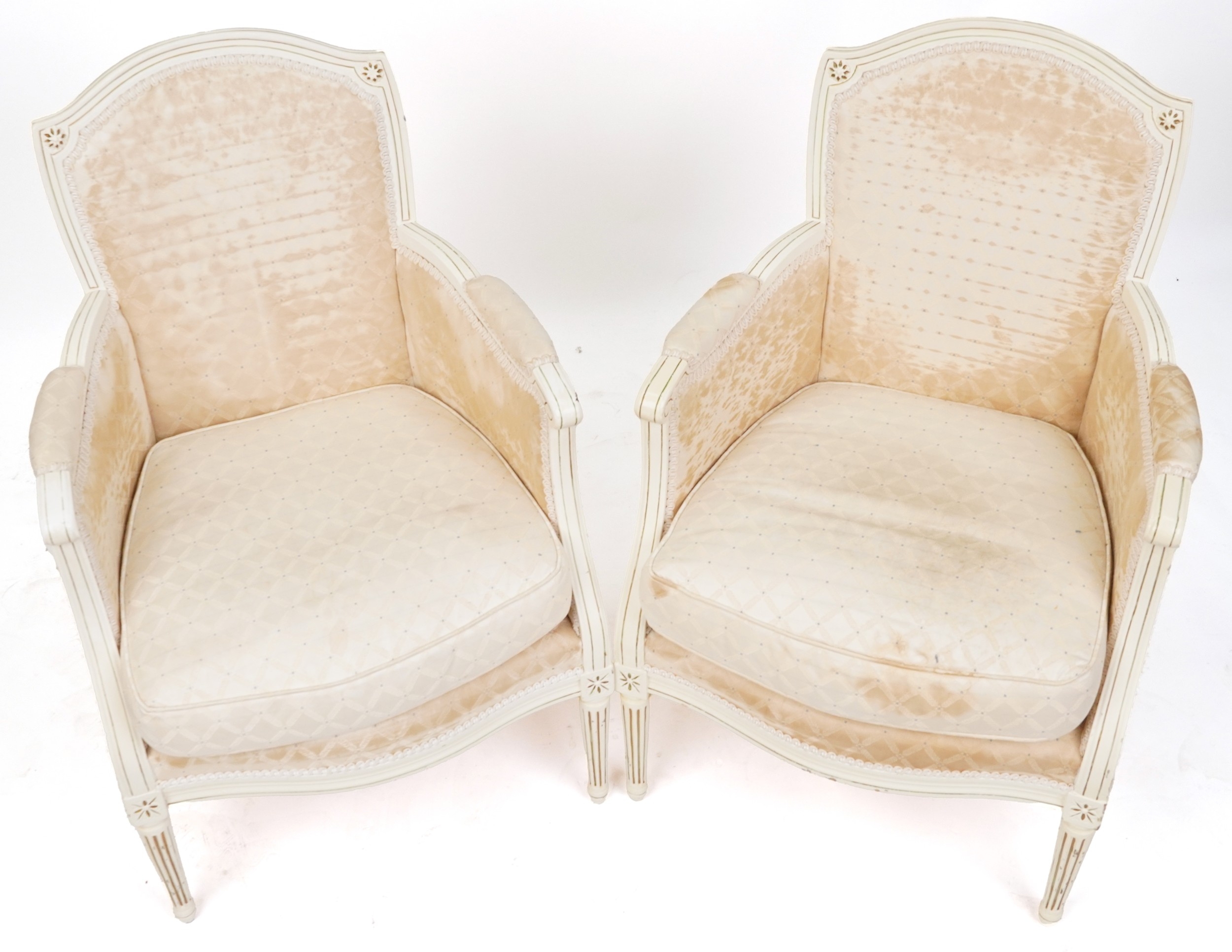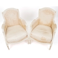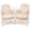 A pair of 20th century white painted fauteuil armchairs, each with loose cushions, raised on fluted legs, 90cm high x 59cm wide.