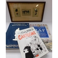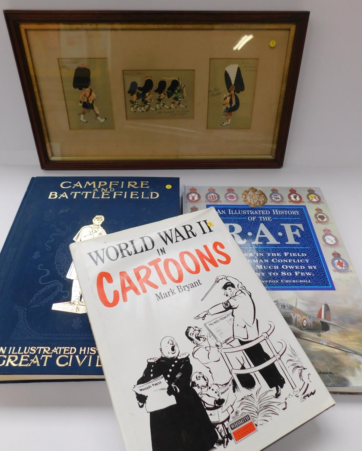 WW1 oak framed Scottish Regiments cartoons and 3x large format books; RAF, American Civil War, WWII cartoons
