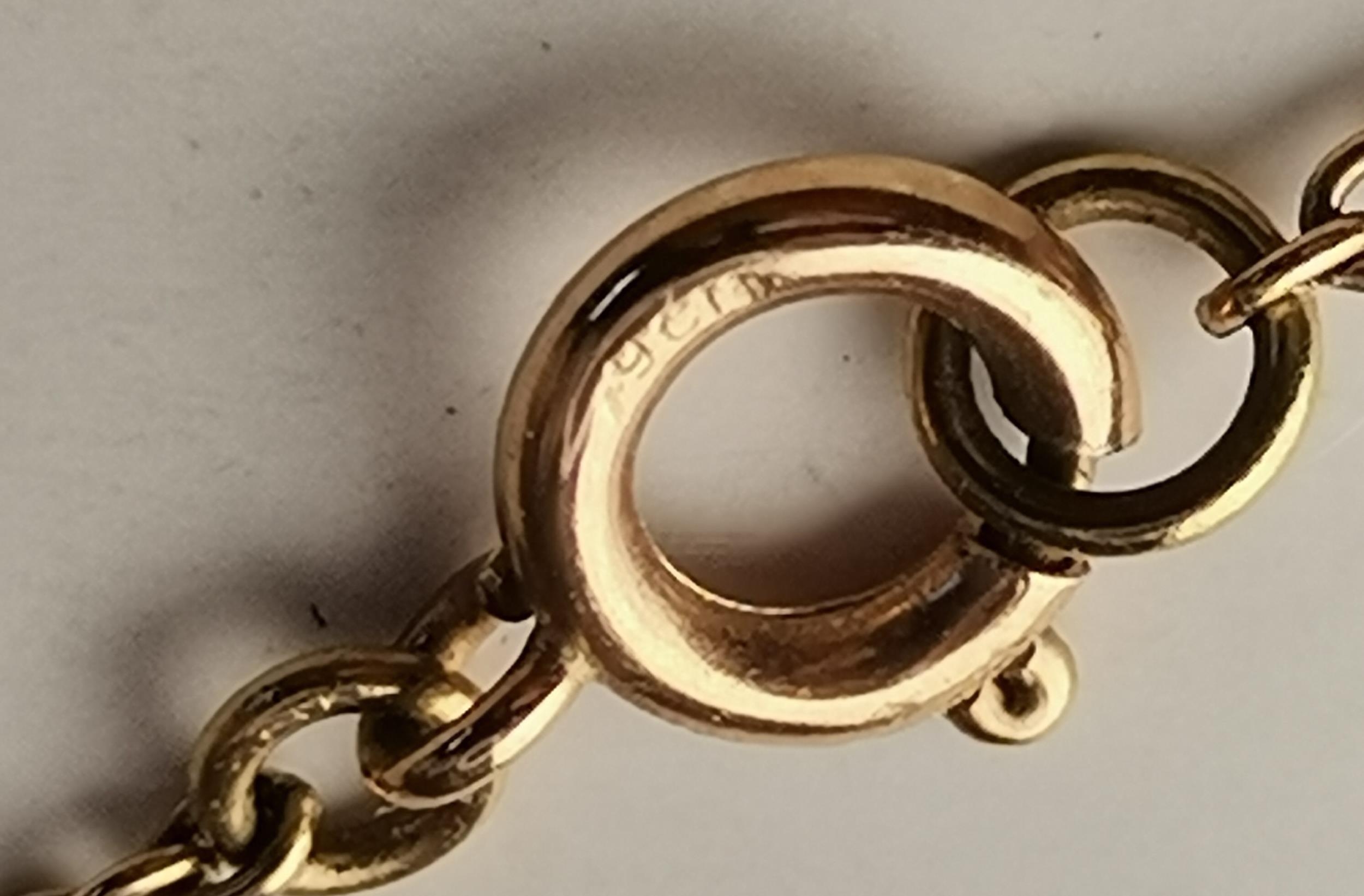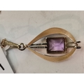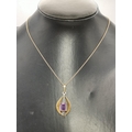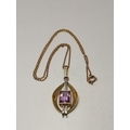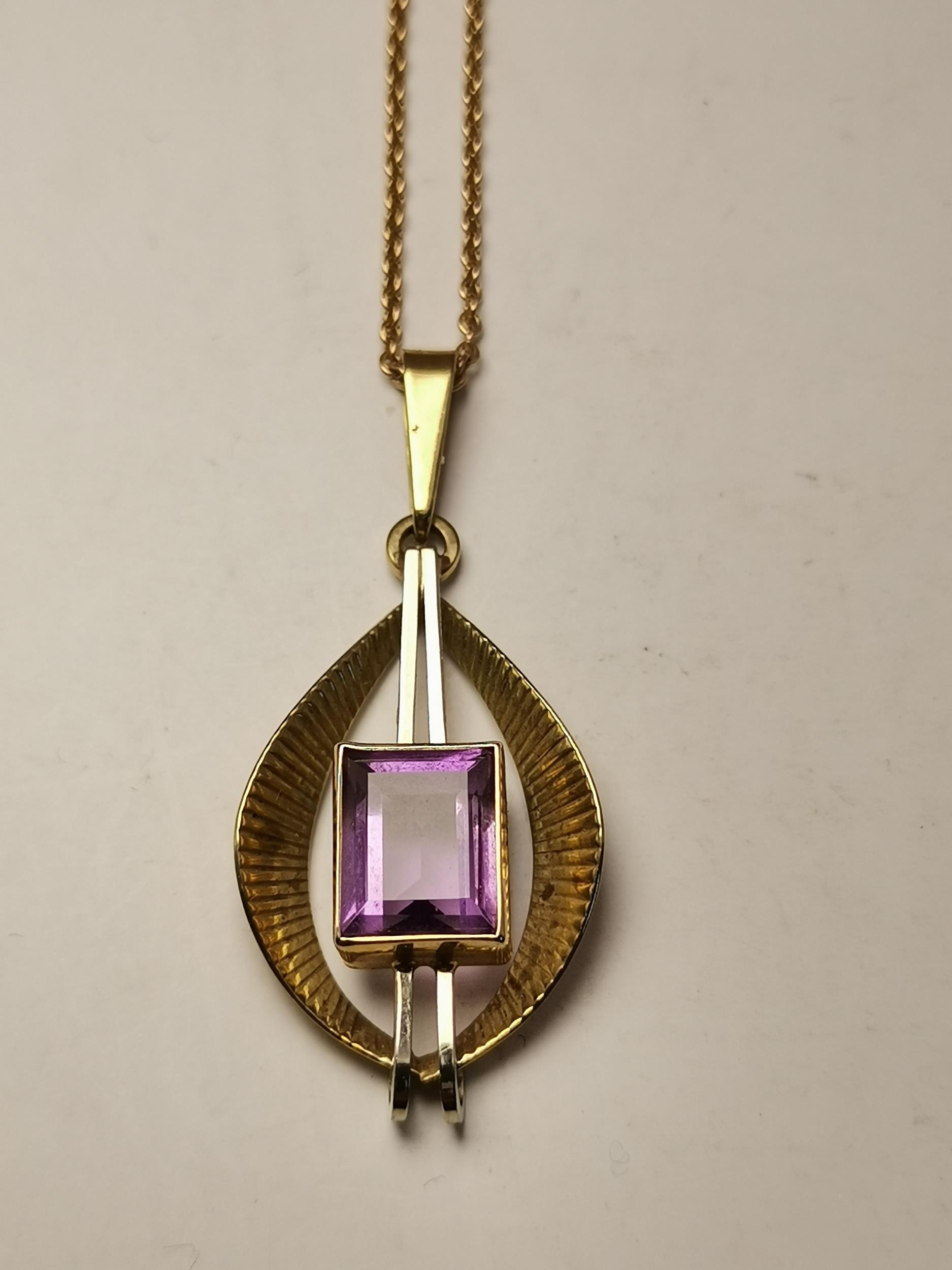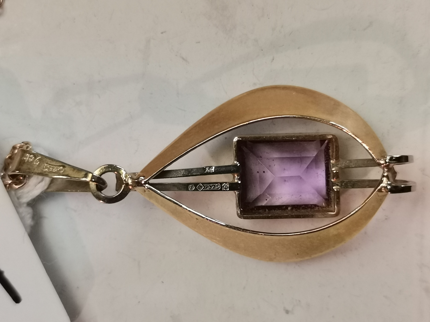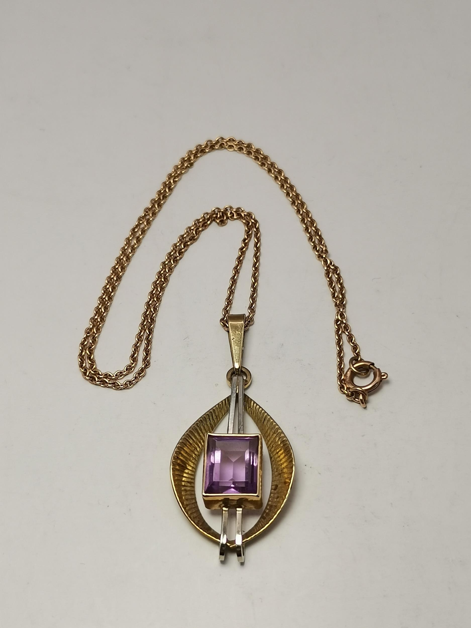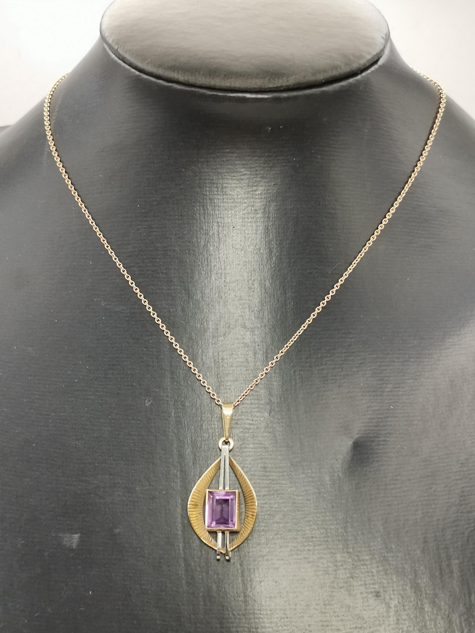 A 9 carat gold gem-stone pendant, set with a rectangular purple stone to twin vertical white gold bars, within an openwork leaf-form border, to a fine trace chain, hallmarked 375 to pendant and bail, chain stamped 9CT. Chain 41cm long, pendant 33mm (excl. bail) by 19mm, 5.3g gross