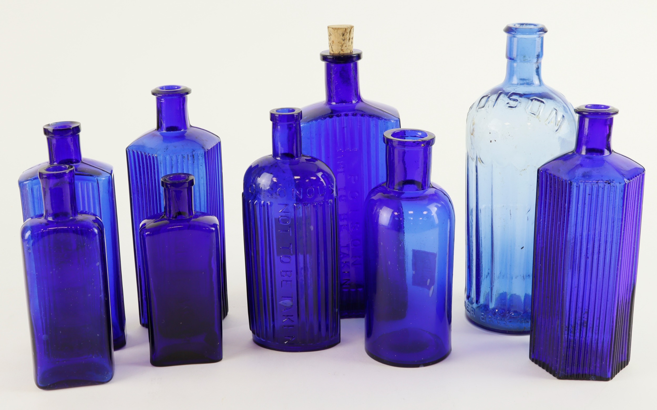 Blue Glass large Poison-type Bottles (9), two only marked "12oz", four marked "Not to be taken", one very large one is marked "Poison", one other large one marked "Poison - Not to be taken", and one plain bottle